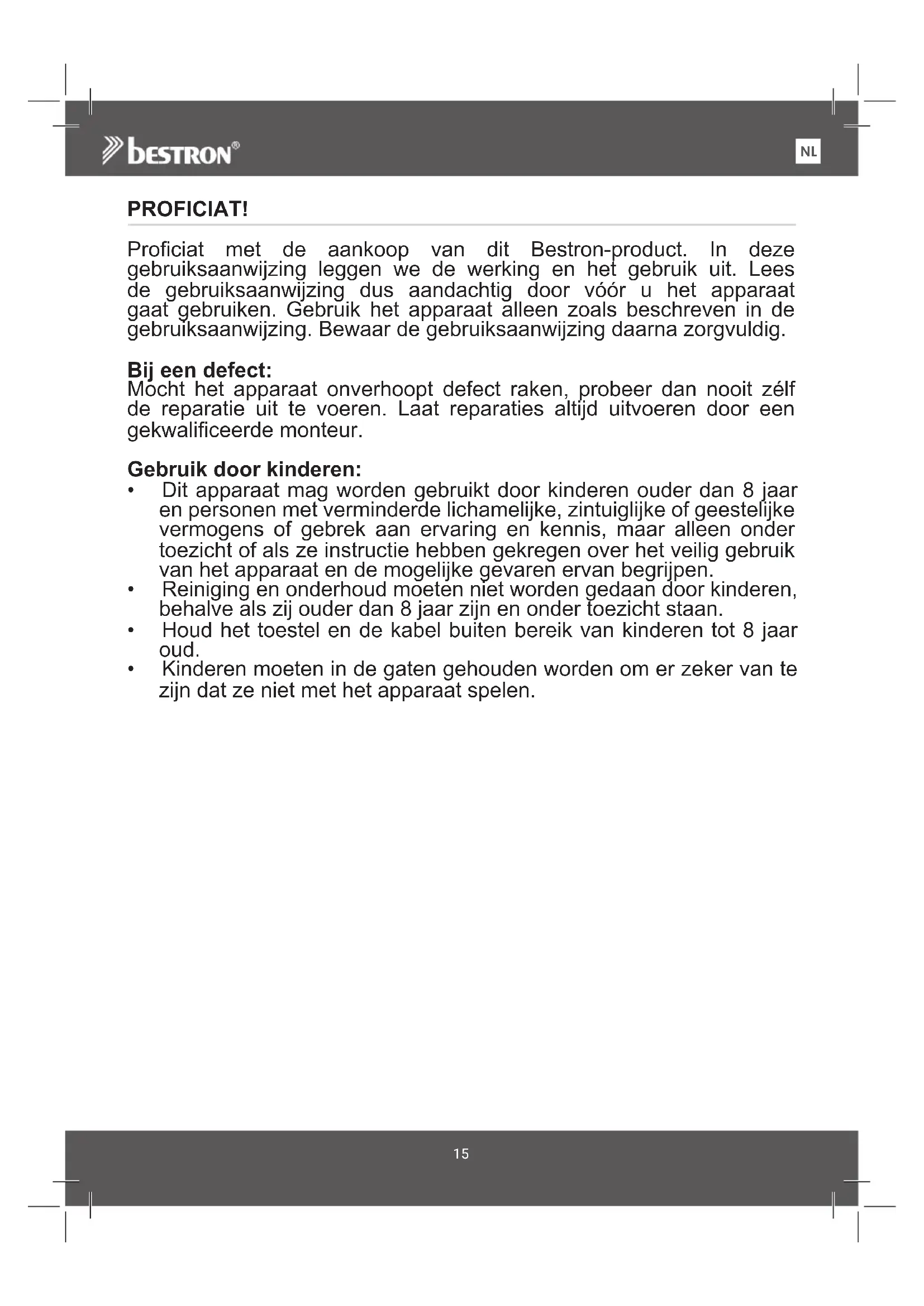 PROFICIAT! Proficiat met de aankoop van dit Bestron-product. In deze gebruiksaanwijzing leggen we de werking en het gebruik uit. Lees de gebruiksaanwijzing dus aandachtig door vóór u het apparaat gaat gebruiken. Gebruik het apparaat alleen zoals beschreven in de gebruiksaanwijzing. Bewaar de gebruiksaanwijzing daarna zorgvuldig. Bij een defect: Mocht het apparaat onverhoopt defect raken, probeer dan nooit zélf de reparatie uit te voeren. Laat reparaties altijd uitvoeren door een gekwalificeerde monteur. Gebruik door kinderen: