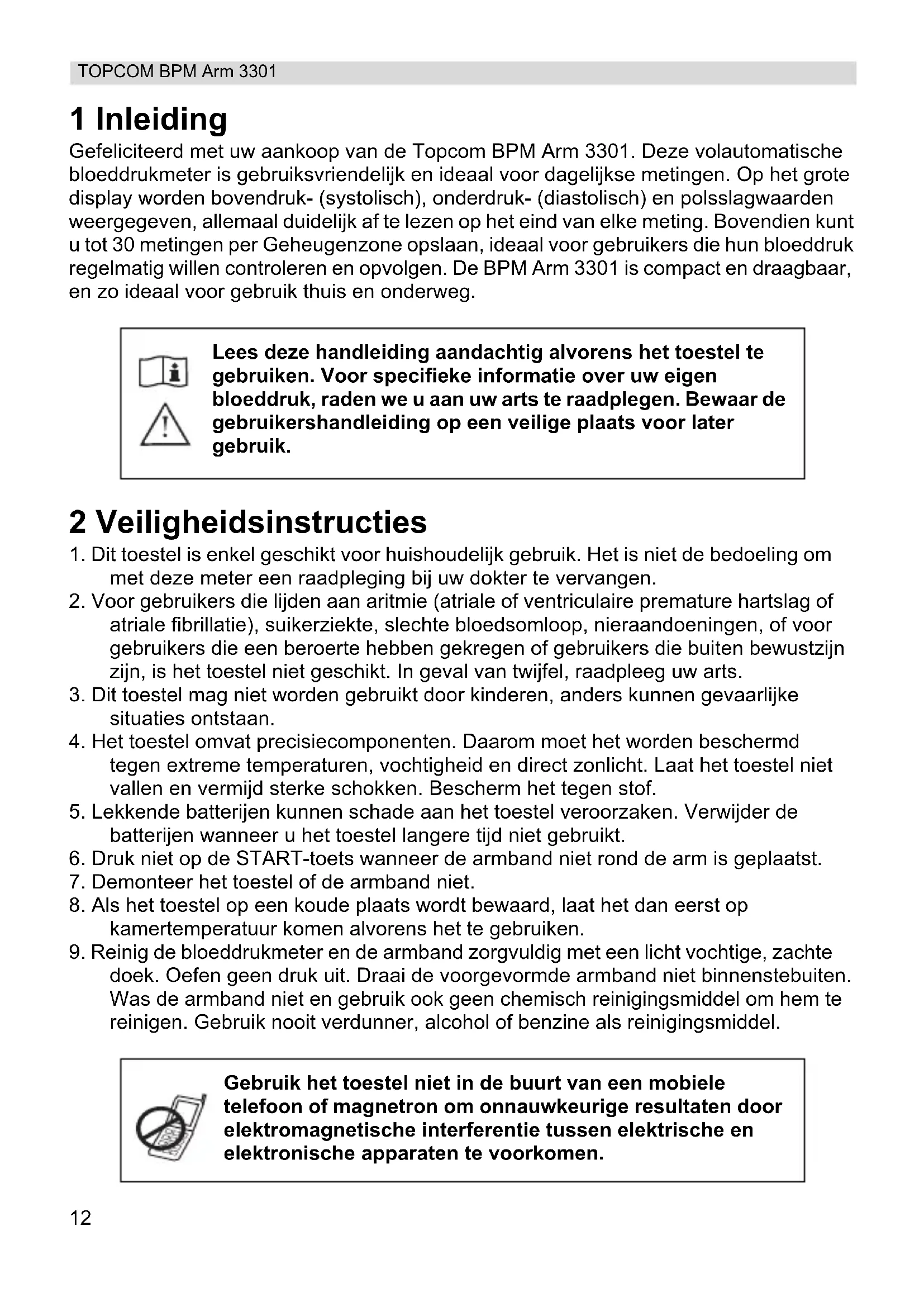 Damage or defects caused by incorrect treatment or operation and damage resulting from use of non-original parts or accessories not recommended by Topcom are not covered by the warranty. The warranty does not cover damage caused by outside factors, such as lightning, water and fire, nor any damage caused during transportation. No warranty can be claimed if the serial number on the units has been changed, removed or rendered illegible.12 TOPCOM BPM Arm 3301 1 Inleiding Gefeliciteerd met uw aankoop van de Topcom BPM Arm 3301. Deze volautomatische bloeddrukmeter is gebruiksvriendelijk en ideaal voor dagelijkse metingen. Op het grote display worden bovendruk- (systolisch), onderdruk- (diastolisch) en polsslagwaarden weergegeven, allemaal duidelijk af te lezen op het eind van elke meting. Bovendien kunt u tot 30 metingen per Geheugenzone opslaan, ideaal voor gebruikers die hun bloeddruk regelmatig willen controleren en opvolgen. De BPM Arm 3301 is compact en draagbaar, en zo ideaal voor gebruik thuis en onderweg. 2 Veiligheidsinstructies