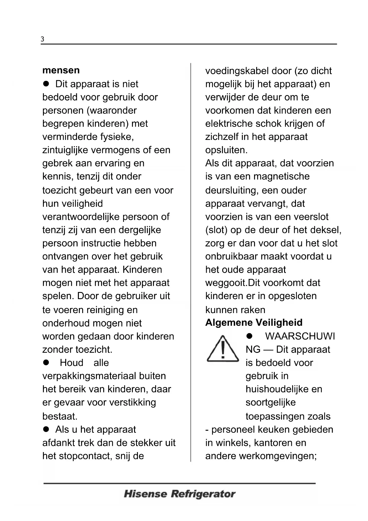 Corretto smaltimento del prodotto Questo simbolo indica che il prodotto non deve essere smaltito con altri rifiuti domestici in tutta l'UE. Per evitare eventuali danni all'ambiente o alla salute umana causati da smaltimento dei rifiuti, riciclarlo in maniera responsabile per favorire il riutilizzo sostenibile delle risorse materiali. Per restituire il dispositivo usato, si prega di utilizzare i sistemi di restituzione e di raccolta o contattare il rivenditore presso il quale il prodotto è stato acquistato. Possono raccogliere questo prodotto per il riciclaggio ambientale sicuro. 19mensen z Dit apparaat is niet bedoeld voor gebruik door personen (waaronder begrepen kinderen) met verminderde fysieke, zintuiglijke vermogens of een gebrek aan ervaring en kennis, tenzij dit onder toezicht gebeurt van een voor hun veiligheid verantwoordelijke persoon of tenzij zij van een dergelijke persoon instructie hebben ontvangen over het gebruik van het apparaat. Kinderen mogen niet met het apparaat spelen. Door de gebruiker uit te voeren reiniging en onderhoud mogen niet worden gedaan door kinderen zonder toezicht. z Houd alle verpakkingsmateriaal buiten het bereik van kinderen, daar er gevaar voor verstikking bestaat. z Als u het apparaat afdankt trek dan de stekker uit het stopcontact, snij de voedingskabel door (zo dicht mogelijk bij het apparaat) en verwijder de deur om te voorkomen dat kinderen een elektrische schok krijgen of zichzelf in het apparaat opsluiten. Als dit apparaat, dat voorzien is van een magnetische deursluiting, een ouder apparaat vervangt, dat voorzien is van een veerslot (slot) op de deur of het deksel, zorg er dan voor dat u het slot onbruikbaar maakt voordat u het oude apparaat weggooit.Dit voorkomt dat kinderen er in opgesloten kunnen raken Algemene Veiligheid z WAARSCHUWI NG — Dit apparaat is bedoeld voor gebruik in huishoudelijke en soortgelijke toepassingen zoals - personeel keuken gebieden in winkels, kantoren en andere werkomgevingen;
