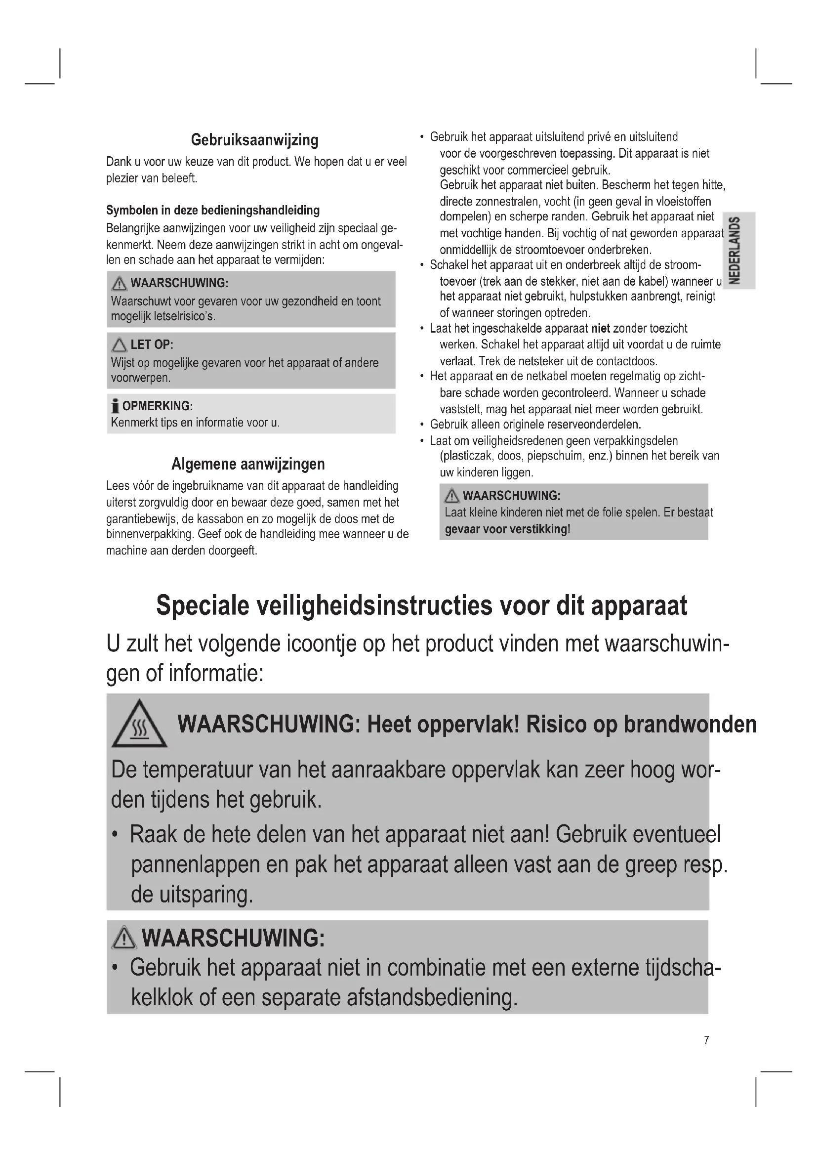 - Laat om veiligheidsredenen geen verpakkingsdelen (plasticzak, doos, piepschuim, enz.) binnen het bereik van uw kinderen liggen. WAARSCHUWING: Laat kleine kinderen niet met de folie spelen. Er bestaat gevaar voor verstikking! Speciale veiligheidsinstructies voor dit apparaat U zult het volgende icoontje op het product vinden met waarschuwin- gen of informatie: WAARSCHUWING: Heet oppervlak! Risico op brandwonden! De temperatuur van het aanraakbare oppervlak kan zeer hoog wor- den tijdens het gebruik.