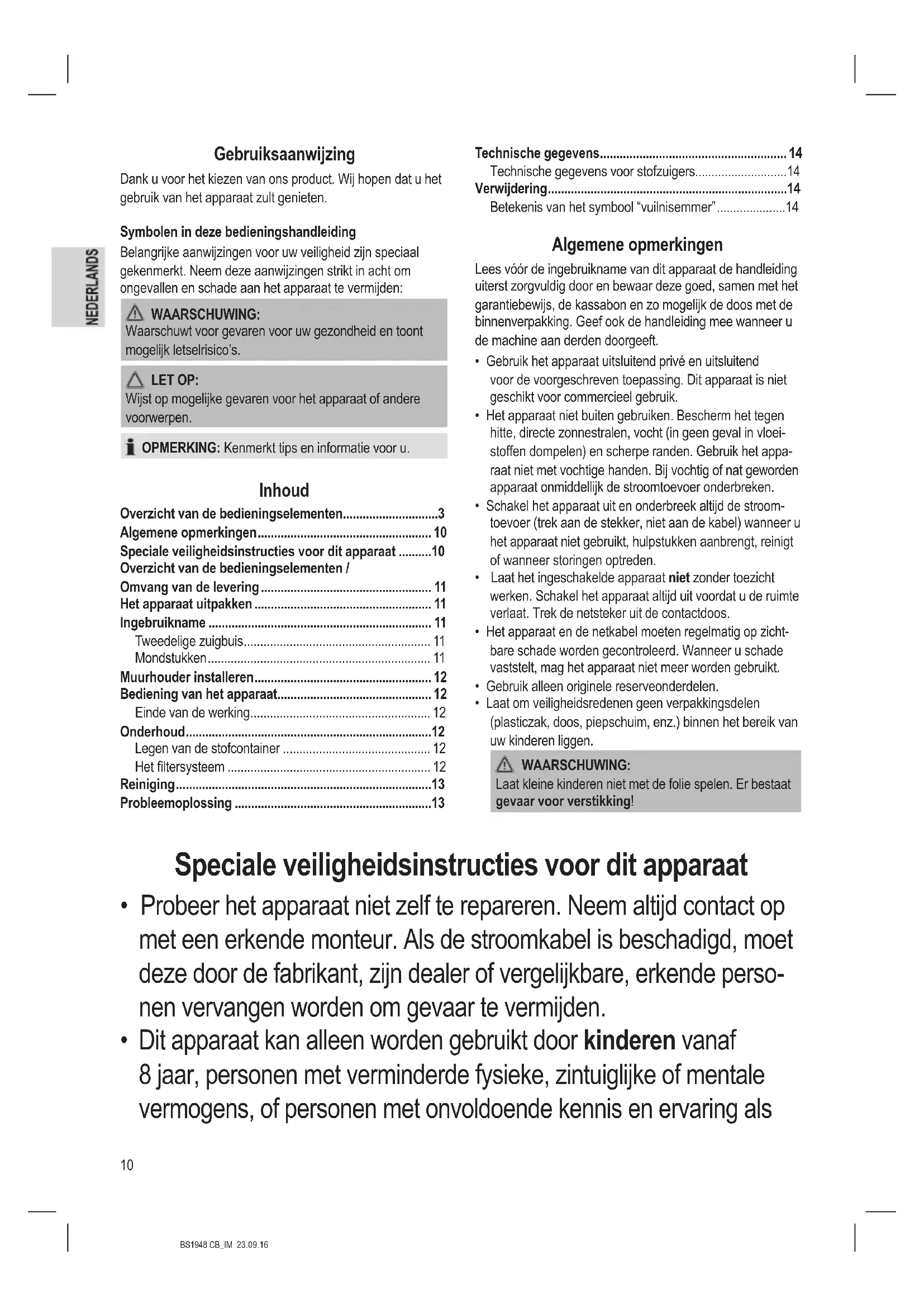 - Dit apparaat kan alleen worden gebruikt door kinderen vanaf 8 jaar, personen met verminderde fysieke, zintuiglijke of mentale vermogens, of personen met onvoldoende kennis en ervaring als11 BS1948 CB_IM 23.09.16 zij begeleid worden of zijn geïnstrueerd in het veilig gebruik van het apparaat en de gevaren begrijpen.