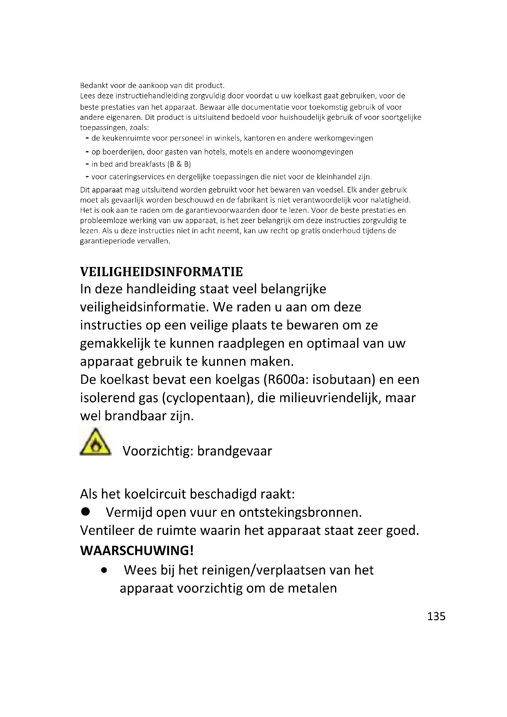 Conformiteit ................................................................................................................ 154 DEURKLINK INSTALLEREN (optioneel)...............................................................152135 Bedankt voor de aankoop van dit product. Lees deze instructiehandleiding zorgvuldig door voordat u uw koelkast gaat gebruiken, voor de beste prestaties van het apparaat. Bewaar alle documentatie voor toekomstig gebruik of voor andere eigenaren. Dit product is uitsluitend bedoeld voor huishoudelijk gebruik of voor soortgelijke toepassingen, zoals: - de keukenruimte voor personeel in winkels, kantoren en andere werkomgevingen - op boerderijen, door gasten van hotels, motels en andere woonomgevingen - in bed and breakfasts (B & B) - voor cateringservices en dergelijke toepassingen die niet voor de kleinhandel zijn. Dit apparaat mag uitsluitend worden gebruikt voor het bewaren van voedsel. Elk ander gebruik moet als gevaarlijk worden beschouwd en de fabrikant is niet verantwoordelijk voor nalatigheid. Het is ook aan te raden om de garantievoorwaarden door te lezen. Voor de beste prestaties en probleemloze werking van uw apparaat, is het zeer belangrijk om deze instructies zorgvuldig te lezen. Als u deze instructies niet in acht neemt, kan uw recht op gratis onderhoud tijdens de garantieperiode vervallen. VEILIGHEIDSINFORMATIE In deze handleiding staat veel belangrijke veiligheidsinformatie. We raden u aan om deze instructies op een veilige plaats te bewaren om ze gemakkelijk te kunnen raadplegen en optimaal van uw apparaat gebruik te kunnen maken. De koelkast bevat een koelgas (R600a: isobutaan) en een isolerend gas (cyclopentaan), die milieuvriendelijk, maar wel brandbaar zijn. Voorzichtig: brandgevaar Als het koelcircuit beschadigd raakt: Vermijd open vuur en ontstekingsbronnen. Ventileer de ruimte waarin het apparaat staat zeer goed. WAARSCHUWING! Wees bij het reinigen/verplaatsen van het apparaat voorzichtig om de metalen136 condensatordraden aan de achterkant van het apparaat niet aan te raken, omdat u daardoor uw vingers en handen kunt verwonden of uw product kunt beschadigen. Dit apparaat is niet ontworpen om op andere apparaten te stapelen. Probeer niet op uw apparaat te zitten of te staan, omdat het daar niet voor is ontworpen. U kunt uzelf verwonden of het apparaat beschadigen. Zorg ervoor dat het netsnoer niet beklemd zit onder het apparaat tijdens en na het vervoeren/verplaatsen van het apparaat, om te voorkomen dat het netsnoer doorgesneden of beschadigd raakt. Let bij het plaatsen van uw apparaat goed op om uw vloer, leidingen, wandbekleding enz. niet te beschadigen. Verplaats het apparaat niet door het aan het deksel of de handgreep te trekken. Laat kinderen niet met het apparaat spelen of aan de bedieningselementen komen. Ons bedrijf wijst alle aansprakelijkheid van de hand als de instructies niet worden gevolgd. Installeer het apparaat niet in vochtige, olieachtige of stoffige plaatsen en stel het niet bloot aan direct zonlicht of water. Installeer het apparaat niet in de buurt van verwarmingsapparaten of ontvlambare materialen.137 Open het deksel niet als er een stroomstoring is. Als de storing korter dan 20 uur duurt, zou deze geen effect moeten hebben op bevroren voedsel. Als de storing langer duurt, moet het voedsel worden gecontroleerd en onmiddellijk worden geconsumeerd of bereid en daarna opnieuw ingevroren. Maakt u zich geen zorgen als het deksel van de diepvrieskist moeilijk te openen is meteen nadat u het heeft gesloten. Dit komt door het drukverschil, dat gewoonlijk na enkele minuten verdwijnt waardoor het deksel gewoon kan worden geopend. Sluit het apparaat niet aan op de elektriciteitsvoorziening voordat alle verpakkingen en transportbeschermers zijn verwijderd. Laat het apparaat minstens 4 uur staan voordat u het aanzet, om de compressorolie te laten stabiliseren na horizontaal transport. Deze vriezer mag alleen worden gebruikt voor het beoogde doel (d.w.z. het bewaren en invriezen van eetbare voedingsmiddelen). Bewaar geen medicijnen of onderzoeksmaterialen in de wijnkoelers. Als er materiaal moet worden opgeslagen waarvoor een strenge controle van de opslagtemperatuur vereist is, kan dit bederven of kan er een ongecontroleerde reactie optreden die risico's kan veroorzaken.138 Haal de stekker uit het stopcontact voordat u handelingen uitvoert. Controleer bij levering of het product niet beschadigd is en of alle onderdelen en accessoires in perfecte staat zijn. Als in het koelsysteem een lek opgemerkt wordt, raak dan de wandcontactdoos niet aan en gebruik geen open vlammen. Open het venster en laat lucht de kamer binnenkomen. Bel vervolgens een servicecentrum en vraag om reparatie. Gebruik geen verlengsnoeren of adapters. Trek niet te hard aan het netsnoer, vouw het niet dubbel en raak de stekker niet met natte handen aan. Beschadig de stekker en/of het netsnoer niet; dit kan elektrische schokken of brand veroorzaken. Plaats geen brandbare en sterk vluchtige materialen zoals ether, benzine, LPG, propaangas, spuitbussen, lijm, pure alcohol, enz. op of in het apparaat. Deze materialen kunnen een explosie veroorzaken. Als het netsnoer van het apparaat is beschadigd, moet het worden vervangen door de fabrikant, diens technische dienst of personen met vergelijkbare kwalificaties, om gevaarlijke situaties te voorkomen. Gebruik of bewaar geen ontvlambare sprays, zoals verfbussen in de buurt van de wijnkoelers. Deze139 kunnen een explosie of brand veroorzaken. Plaats geen voorwerpen en/of houders gevuld met water bovenop het apparaat. We raden het gebruik van verlengsnoeren en multi-adapters niet aan. Verbrand het apparaat niet als u het weg wilt doen. Wees voorzichtig dat u het koelcircuit/de koelleidingen van het apparaat niet beschadigt tijdens het transport en het gebruik. Stel in het geval van schade het apparaat niet bloot aan brand, mogelijke ontstekingsbronnen en ventileer onmiddellijk de ruimte waarin het apparaat staat. Het koelsy