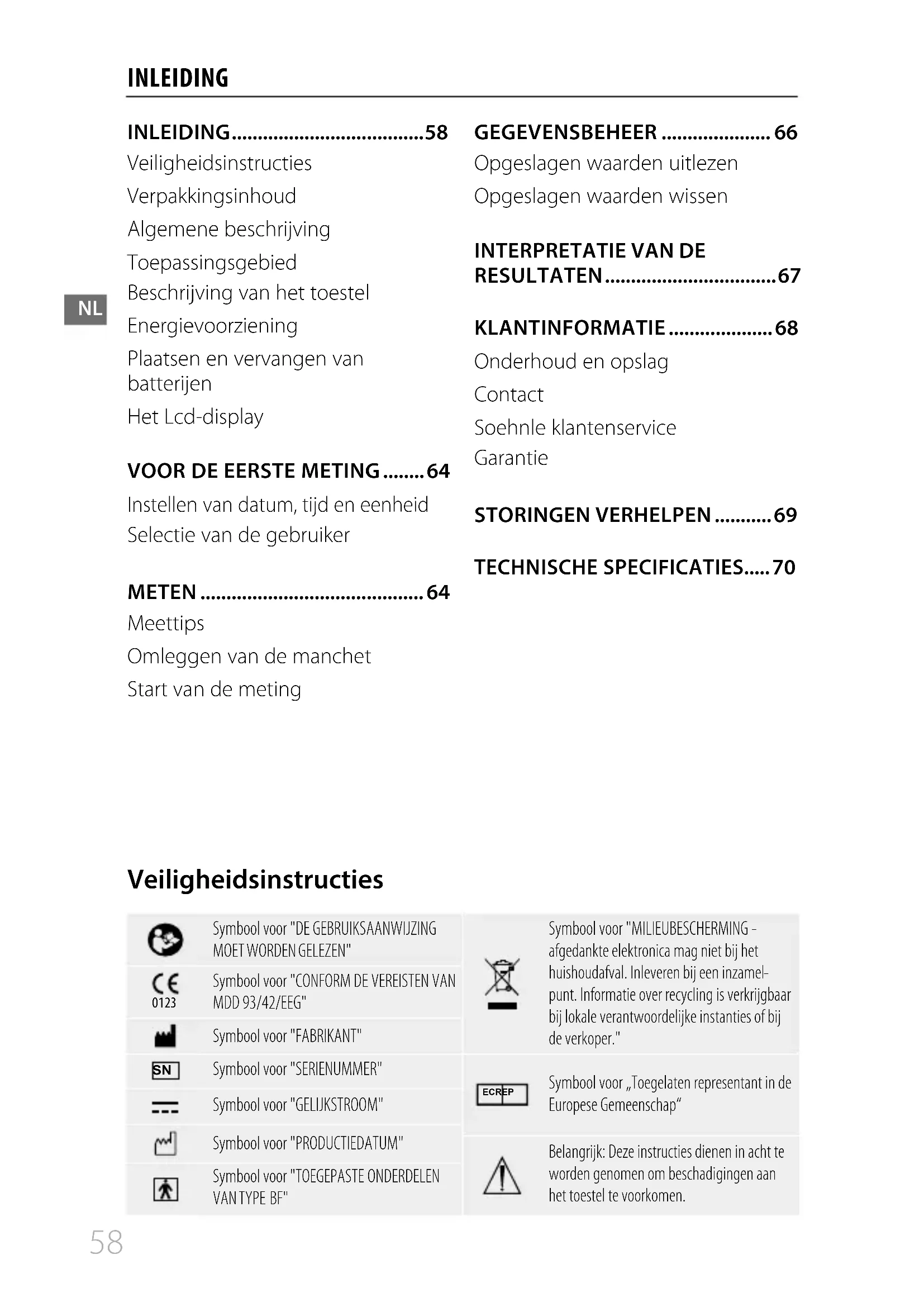 - Het materiaal van de manchet is gekeurd en voldoet aantoonbaar aan de vereisten van ISO 10993- BELANGRIJKE INSTRUCTIES! ABSOLUUT BEWAREN! Lees de gebruiksaanwijzing, met name de veiligheidsinst- ructies, zorgvuldig door voordat het toestel in gebruik wordt genomen en bewaar deze gebruiksaanwijzing om later te kunnen raadplegen. Als het toestel aan derden wordt doorgegeven, ook deze gebruiksaanwijzing meeleveren. Negeren van deze instructies kan lei- den tot letsel of schade aan het toestel.NL