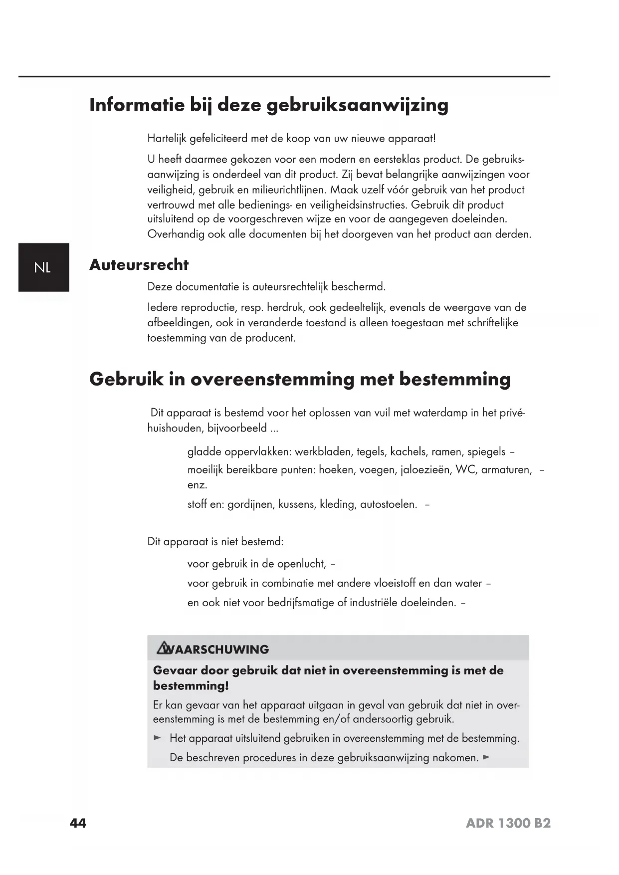 Informatie bij deze gebruiksaanwijzing Hartelijk gefeliciteerd met de koop van uw nieuwe apparaat! U heeft daarmee gekozen voor een modern en eersteklas product. De gebruiks- aanwijzing is onderdeel van dit product. Zij bevat belangrijke aanwijzingen voor veiligheid, gebruik en milieurichtlijnen. Maak uzelf vóór gebruik van het product vertrouwd met alle bedienings- en veiligheidsinstructies. Gebruik dit product uitsluitend op de voorgeschreven wijze en voor de aangegeven doeleinden. Overhandig ook alle documenten bij het doorgeven van het product aan derden. Auteursrecht Deze documentatie is auteursrechtelijk beschermd. Iedere reproductie, resp. herdruk, ook gedeeltelijk, evenals de weergave van de afbeeldingen, ook in veranderde toestand is alleen toegestaan met schriftelijke toestemming van de producent. Gebruik in overeenstemming met bestemming Dit apparaat is bestemd voor het oplossen van vuil met waterdamp in het privé- huishouden, bijvoorbeeld ... gladde oppervlakken: werkbladen, tegels, kachels, ramen, spiegels – moeilijk bereikbare punten: hoeken, voegen, jaloezieën, WC, armaturen, – enz. stoff en: gordijnen, kussens, kleding, autostoelen. – Dit apparaat is niet bestemd: voor gebruik in de openlucht, – voor gebruik in combinatie met andere vloeistoff en dan water – en ook niet voor bedrijfsmatige of industriële doeleinden. – WAARSCHUWING Gevaar door gebruik dat niet in overeenstemming is met de bestemming! Er kan gevaar van het apparaat uitgaan in geval van gebruik dat niet in over- eenstemming is met de bestemming en/of andersoortig gebruik. Het apparaat uitsluitend gebruiken in overeenstemming met de bestemming.
