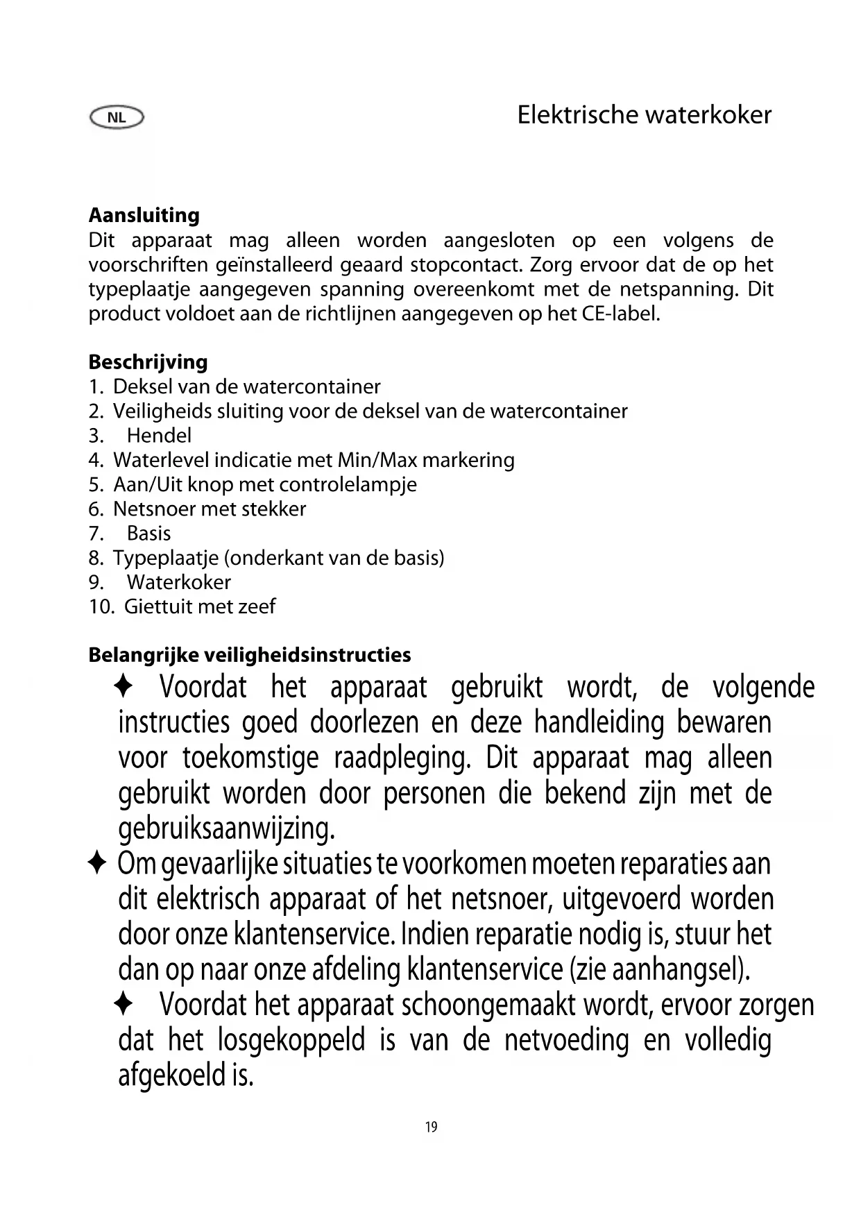 Belangrijke veiligheidsinstructies ✦ Voordat het apparaat gebruikt wordt, de volgende instructies goed doorlezen en deze handleiding bewaren voor toekomstige raadpleging. Dit apparaat mag alleen gebruikt worden door personen die bekend zijn met de gebruiksaanwijzing. ✦ Om gevaarlijke situaties te voorkomen moeten reparaties aan dit elektrisch apparaat of het netsnoer, uitgevoerd worden door onze klantenservice. Indien reparatie nodig is, stuur het dan op naar onze afdeling klantenservice (zie aanhangsel). ✦ Voordat het apparaat schoongemaakt wordt, ervoor zorgen dat het losgekoppeld is van de netvoeding en volledig afgekoeld is. NL20 ✦ Om het risico van een elektrische schok te voorkomen dit apparaat nooit schoonmaken met water en nooit in water onderdompelen. ✦ Dit apparaat mag gebruikt worden door kinderen (tenminste 8 jaar oud) en door personen met verminderde fysische, zintuigelijke of mentale bekwaamheden, of gebrek aan ervaring en kennis, mits zij onder begeleiding zijn of instructies ontvangen hebben over het gebruik van dit apparaat en de gevaren en veiligheidsvoorschriften volledig begrijpen. ✦ Kinderen mogen niet met het apparaat spelen. ✦ Kinderen mogen aan dit apparaat geen schoonmaak-of onderhoudswerkzaamheden verrichten behalve wanneer ze onder toezicht zijn. ✦ Het apparaat en het snoer moeten altijd goed weggehouden worden van kinderen jonger dan 8 jaar. ✦ Dit apparaat is bestemd voor huishoudelijk en ander gelijksoortig gebruik, zoals - in winkels, kantoren of andere gelijksoortige werkomgevingen, - in agrarische werkomgevingen, - door klanten in hotels, motels enz. en gelijksoortige etablissementen, - in bed en breakfast gasthuizen. ✦ Laat de waterkoker tijdens werking niet onbeheerd achter; gebruik alleen zuiver water en let altijd op de maximum/ minimum markering wanneer men de waterkoker vult. Overvullen van de waterkoker kan gevaarlijk zijn21 vanwege kokend water wat uitgestoten kan worden. ✦ Pas ook op voor verbranding door hete stoom wat uitgestoten kan worden. Daarom, tijdens gebruik, geen enkel ander deel van het apparaat aanraken behalve het handvat. ✦ Let op! Tijdens het kookproces en als er heet water uitgeschonken wordt, de deksel altijd gesloten houden. ✦ De waterkoker mag alleen gebruikt worden met de bijgeleverde sokkel (basis). ✦ Verwijder (of zet) de waterkoker nooit (terug op) van de basis als het apparaat aanstaat. ✦ Waarschuwing: houdt kinderen weg van inpakmateriaal, daar deze een bron van gevaar zijn b.v. door verstikking. ✦ Elke keer dat het apparaat wordt gebruikt moet zowel de hoofdeenheid inclusief het netsnoer en elk hulpstuk dat wordt aangebracht, eerst zorgvuldig op eventuele defecten worden gecontroleerd. Ingeval het apparaat, bijvoorbeeld, op een hard oppervlak is gevallen, of wanneer men met overdadige kracht aan het netsnoer getrokken heeft, mag het niet meer gebruikt worden: zelfs een onzichtbare beschadiging kan ongewenste e ecten hebben op de gebruiksveiligheid van het apparaat. ✦ Het apparaat mag alleen op een hittebestendig, vlak oppervlak gebruikt worden. ✦ Gebruik dit apparaat niet onder overhangende kastjes of gelijkwaardige voorwerpen; er bestaat gevaar dat de stoom die hieronder vrijkomt, gevangen blijft zitten. ✦ De uitwendige delen zullen heet worden tijdens gebruik en voor een lange periode heet blijven. ✦ Zorg ervoor dat de behuizing en het netsnoer niet in contact komen met open vuur of andere hete oppervlakken zoals kookplaten. ✦ Laat het snoer nooit los hangen en zorg ervoor dat het snoer niet in de nabijheid komt van hete delen van de behuizing. ✦ Verwijder altijd de stekker uit het stopcontact; - na gebruik, - wanneer het apparaat niet werkt, - wanneer men het apparaat schoonmaakt. ✦ Wordt dit apparaat op een verkeerde manier gebruikt of worden22 de veiligheidsregels niet gevolgd, dan zal de fabrikant geen aansprakelijkheid accepteren voor eventuele schades. Thermische beveiliging De vooraf ingestelde thermische beveiliging beschermt het verhittingelement tegen oververhitten wanneer men het apparaat aanzet zonder dat water aanwezig is in de watercontainer of wanneer het element teveel kalkaanslag bevat. Wanneer de thermische beveiliging de waterkoker heeft uitgeschakeld moet men deze voldoende laten afkoelen of men moet de waterkoker ontkalken voordat men deze weer kan aanzetten. Voor het eerste gebruik Voor hygiënische redenen, de eerste vulling met water laten koken en dan weggooien. Water koken ✦ Verwijder nooit de watercontainer van de basis (of vervang deze) wanneer het apparaat aanstaat. ✦ Verwijder de watercontainer van de basis. ✦ Maak het deksel vrij en open het, vul het reservoir tot het gewenste niveau met water, houdt hierbij de minimale en maximale markering in de gaten. ✦ Voordat het deksel wordt gesloten en de waterkoker weer op zijn basis wordt teruggeplaatst, erop letten dat het apparaat nog niet is aangezet. ✦ Stop de stekker in het stopcontact en druk op de Aan/Uit knop. Het indicatielampje zal aangaan. ✦ Het kookproces zal nu beginnen. Nadat het kookpunt bereikt is zal het apparaat automatisch uitgeschakeld worden door het ingebouwde stoombeveiligingssysteem. Het indicatielampje zal uitgaan. ✦ Om het kookproces te onderbreken moet men de Aan/Uit knop in de Uit stand zetten. ✦ Om heet water uit te gieten moet men de container van de basis verwijderen. ✦ Om te voorkomen dat er hete stoom wordt uitgestoten zorg ervoor dat de deksel gesloten blijft terwijl men water uitgiet. ✦ Verwijder de stekker na gebruik uit het stopcontact. ✦ Laat nooit water in de container. Ontkalken ✦ Afhankelijk van de waterkwaliteit in uw omgeving, kan kalkaanslag zich opbouwen op het verhittingselement. Het wordt aangeraden23 om dit op regelmatige basis te verwijderen. Elke garantieclaim zal nietig en ongeldig zijn wanneer het apparaat niet werkt vanwege onvoldoende ontkalken. ✦ Een mengsel van 0.5 liter water en 40 ml schoonmaakazijn is hiervoor geschikt