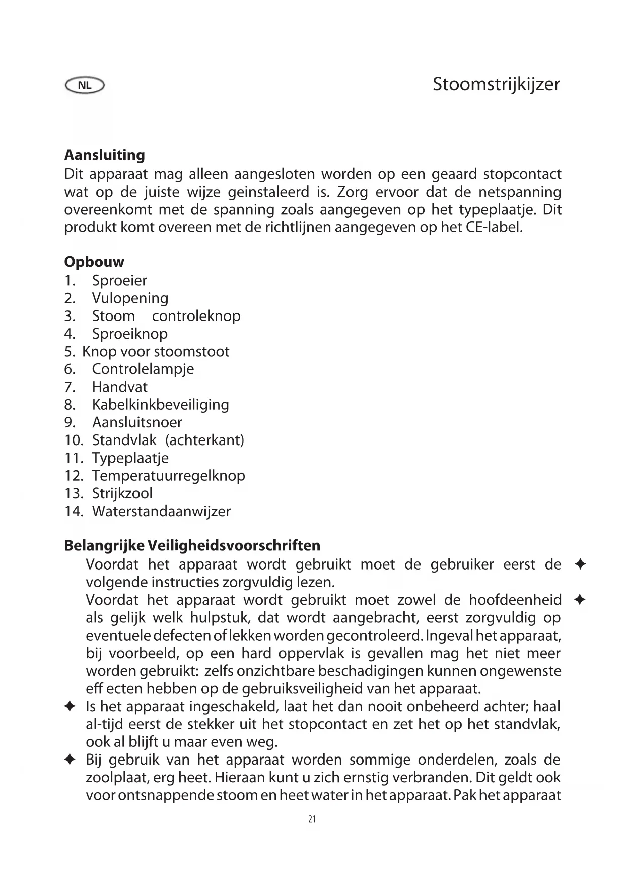 Belangrijke Veiligheidsvoorschriften Voordat het apparaat wordt gebruikt moet de gebruiker eerst de ✦ volgende instructies zorgvuldig lezen. Voordat het apparaat wordt gebruikt moet zowel de hoofdeenheid ✦ als gelijk welk hulpstuk, dat wordt aangebracht, eerst zorgvuldig op eventuele defecten of lekken worden gecontroleerd. Ingeval het apparaat, bij voorbeeld, op een hard oppervlak is gevallen mag het niet meer worden gebruikt: zelfs onzichtbare beschadigingen kunnen ongewenste e ecten hebben op de gebruiksveiligheid van het apparaat. Is het apparaat ingeschakeld, laat het dan nooit onbeheerd achter; haal ✦ al-tijd eerst de stekker uit het stopcontact en zet het op het standvlak, ook al blijft u maar even weg. Bij gebruik van het apparaat worden sommige onderdelen, zoals de ✦ zoolplaat, erg heet. Hieraan kunt u zich ernstig verbranden. Dit geldt ook voor ontsnappende stoom en heet water in het apparaat. Pak het apparaat