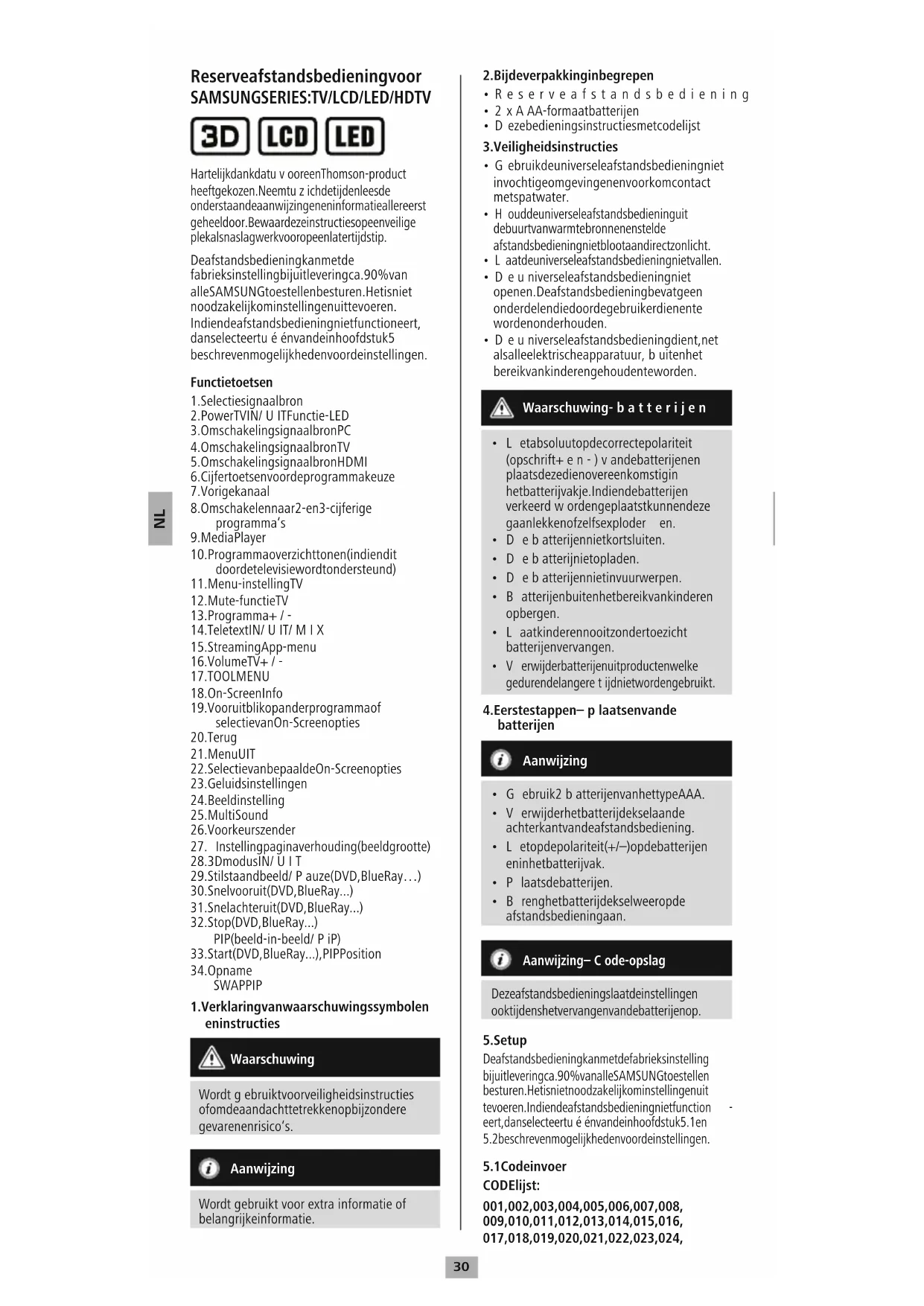 Hartelijk dank dat uvoor een Thomson-product heeft gekozen. Neemt uzich de tijd en lees de onderstaande aanwijzingen en informatie allereerst geheel door. Bewaar deze instructies op een veilige plek als naslagwerk voor op een later tijdstip. De afstandsbediening kan met de fabrieksinstelling bij uitlevering ca. 90% van alle SAMSUNG toestellen besturen. Het is niet noodzakelijk om instellingen uit te voeren. Indien de afstandsbediening niet functioneert, dan selecteert uéén van de in hoofdstuk 5 beschreven mogelijkheden voor de instellingen. Functietoetsen