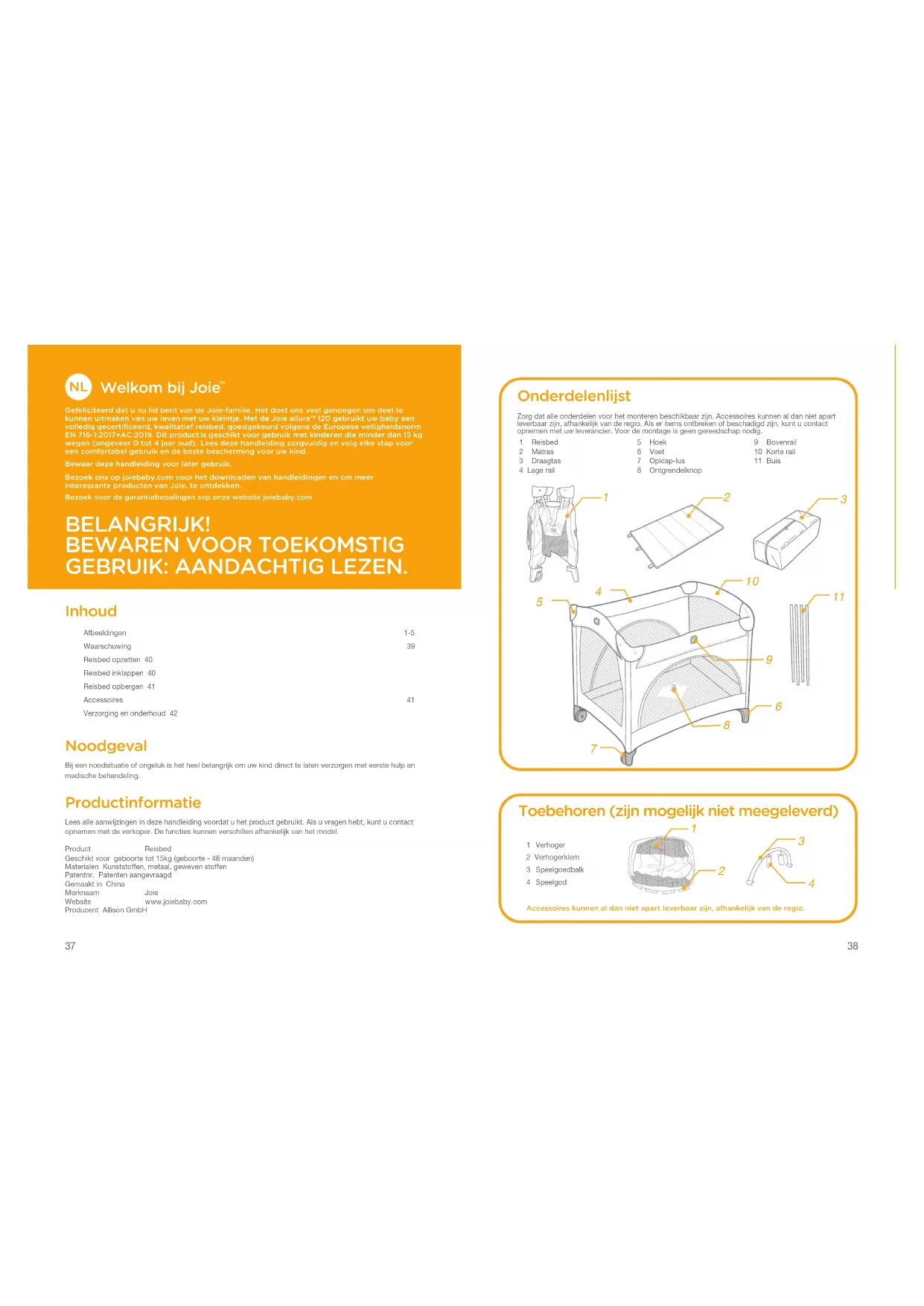 GEBRUIK: AANDACHTIG LEZEN. Inhoud Afbeeldingen 1-5Waarschuwing 39Reisbed opzetten 40Reisbed inklappen 40Reisbed opbergen 41Accessoires 41Verzorging en onderhoud 42 Noodgeval Bij een noodsituatie of ongeluk is het heel belangrijk om uw kind direct te laten verzorgen met eerste hulp en medische behandeling. Productinformatie Lees alle aanwijzingen in deze handleiding voordat u het product gebruikt. Als u vragen hebt, kunt u contact opnemen met de verkoper. De functies kunnen verschillen afhankelijk van het model.Product ReisbedGeschikt voor geboorte tot 15kg (geboorte - 48 maanden)Materialen Kunststoffen, metaal, geweven stoffenPatentnr. Patenten aangevraagdGemaakt in ChinaMerknaam JoieWebsite www.joiebaby.com Producent Allison GmbH Toebehoren (zijn mogelijk niet meegeleverd) 1 Verhoger 2 Verhogerklem3 Speelgoedbalk4 SpeelgodAccessoires kunnen al dan niet apart leverbaar zijn, afhankelijk van de regio.1 Reisbed2 Matras3 Draagtas4 Lage rail5 Hoek6 Voet7 Opklap-lus8 Ontgrendelknop9 Bovenrail10 Korte rail11 Buis Onderdelenlijst Zorg dat alle onderdelen voor het monteren beschikbaar zijn. Accessoires kunnen al dan niet apart leverbaar zijn, afhankelijk van de regio. Als er items ontbreken of beschadigd zijn, kunt u contact opnemen met uw leverancier. Voor de montage is geen gereedschap nodig.