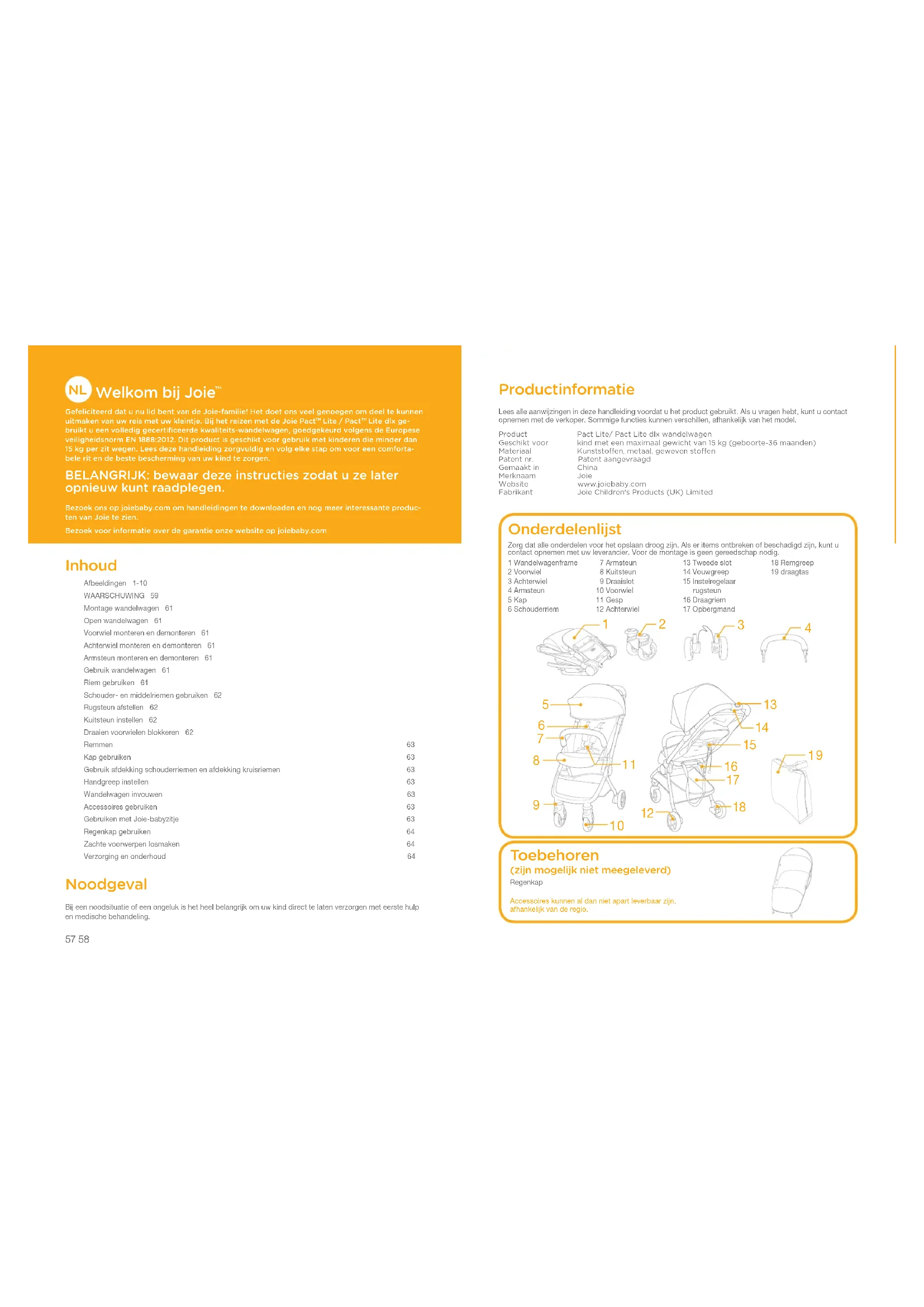 Gefeliciteerd dat u nu lid bent van de Joie-familie! Het doet ons veel genoegen om deel te kunnen uitmaken van uw reis met uw kleintje. Bij het reizen met de Joie Pact Lite / Pact Lite dlx ge-bruikt u een volledig gecertificeerde kwaliteits-wandelwagen, goedgekeurd volgens de Europese veiligheidsnorm EN 1888:2012. Dit product is geschikt voor gebruik met kinderen die minder dan 15 kg per zit wegen. Lees deze handleiding zorgvuldig en volg elke stap om voor een comforta-bele rit en de beste bescherming van uw kind te zorgen. BELANGRIJK: bewaar deze instructies zodat u ze later opnieuw kunt raadplegen. Bezoek ons op joiebaby.com om handleidingen te downloaden en nog meer interessante produc-ten van Joie te zien.Bezoek voor informatie over de garantie onze website op joiebaby.com Inhoud Afbeeldingen 1-10WAARSCHUWING 59Montage wandelwagen 61Open wandelwagen 61Voorwiel monteren en demonteren 61Achterwiel monteren en demonteren 61Armsteun monteren en demonteren 61Gebruik wandelwagen 61Riem gebruiken 61Schouder- en middelriemen gebruiken 62Rugsteun afstellen 62Kuitsteun instellen 62Draaien voorwielen blokkeren 62Remmen 63Kap gebruiken 63Gebruik afdekking schouderriemen en afdekking kruisriemen 63Handgreep instellen 63Wandelwagen invouwen 63Accessoires gebruiken 63Gebruiken met Joie-babyzitje 63Regenkap gebruiken 64Zachte voorwerpen losmaken 64Verzorging en onderhoud 64 Noodgeval Bij een noodsituatie of een ongeluk is het heel belangrijk om uw kind direct te laten verzorgen met eerste hulp en medische behandeling. Productinformatie Lees alle aanwijzingen in deze handleiding voordat u het product gebruikt. Als u vragen hebt, kunt u contact opnemen met de verkoper. Sommige functies kunnen verschillen, afhankelijk van het model.Product Pact Lite/ Pact Lite dlx wandelwagenGeschikt voor kind met een maximaal gewicht van 15 kg (geboorte-36 maanden)Materiaal Kunststoffen, metaal, geweven stoffenPatent nr. Patent aangevraagdGemaakt in ChinaMerknaam JoieWebsite www.joiebaby.comFabrikant Joie Children's Products (UK) Limited1 Wandelwagenframe2 Voorwiel3 Achterwiel4 Armsteun5 Kap6 Schouderriem 7 Armsteun 8 Kuitsteun 9 Draaislot10 Voorwiel11 Gesp12 Achterwiel13 Tweede slot14 Vouwgreep15 Instelregelaar rugsteun16 Draagriem17 Opbergmand18 Remgreep19 draagtas Onderdelenlijst Zorg dat alle onderdelen voor het opslaan droog zijn. Als er items ontbreken of beschadigd zijn, kunt u contact opnemen met uw leverancier. Voor de montage is geen gereedschap nodig. Toebehoren (zijn mogelijk niet meegeleverd) RegenkapAccessoires kunnen al dan niet apart leverbaar zijn, afhankelijk van de regio.59 60 WAARSCHUWING ! WAARSCHUWING Gebruik altijd de veiligheidsriemen. Veiligheidsriemen en zitsystemen moeten op de juiste wijze worden gebruikt. ! WAARSCHUWING Controleer voor het gebruik of alle sluitingen goed vastzitten. ! WAARSCHUWING Laat uw kind niet met dit product spelen. ! WAARSCHUWING Controleer voor het gebruik of de bevestigingsmid- delen van de wandelwagen of het kinderzitje goed zijn vastgezet. ! Montage door volwassene vereist. ! Gebruik de wandelwagen voor een kind dat minder dan 15kg weegt. Als het kind niet past, kan dit de wandelwagen beschadigen. ! Om een gevaarlijke en instabiele conditie te vermijden, moet u niet meer dan 4,5 kg in de opbergmand plaatsen. ! Laat uw kind nooit zonder toezicht achter Let altijd op uw kind als het in de wandelwagen zit. ! Gebruik de wandelwagen met slechts één kind tegelijk. Leg nooit hand- tassen, boodschappentassen, pakjes of onderdelen van toebehoren op de greep of de kap. ! Gebruik geen toebehoren die niet door de fabrikant zijn goedgekeurd. Gebruik uitsluitend vervangende onderdelen die zijn geleverd of aan- bevolen door de fabrikant. ! Gebruik nooit accessoires, onderdelen of componenten die niet door de fabrikant zijn gemaakt of goedgekeurd. Lees altijd eerst zorgvuldig de handleiding. ! Lees alle aanwijzingen in deze handleiding voordat u het product ge- bruikt. Bewaar de handleiding voor later gebruik. Niet-naleving van de waarschuwingen en de instructies kan ernstig letsel of de dood veroorzaken. ! Om ernstig letsel te vermijden door vallen of uit de wagen glijden, moet u altijd de riemen gebruiken. ! Zorg er voor dat het lichaam van uw kind geen bewegende onderdelen raakt bij het aanpassen van de wandelwagen. ! Zorg ervoor dat de wandelwagen volledig geopend of dichtgevouwen is voordat u uw kind in de buurt laat komen. ! Het kind kan in de beenopeningen glijden en gewurgd worden als het harnas niet wordt gebruikt. ! Gebruik de wandelwagen nooit op trappen of roltrappen. ! Uit de buurt houden van voorwerpen, vloeistoffen en elektronica met een hoge temperatuur. ! Laat uw kind nooit in de wandelwagen staan of met het hoofd naar de voorkant van de wandelwagen zitten. ! Plaats de wandelwagen nooit op wegen, hellingen of gevaarlijke gebie- den. ! Om verstikking te voorkomen, moet u GEEN voorwerpen met een koord rond de hals van uw kind hangen, de koorden van dit product laten hangen of koorden aan speelgoed bevestigen. ! Elke last bevestigd aan de greep of op de achterkant van de rugsteun of de zijkanten van de wandelwagen be vloeden de stabiliteit van de wandelwagen. ! Til de wandelwagen NIET op als daar een kind in zit. ! Gebruik de opbergmand NIET om een kind in te plaatsen. ! Om omvallen te voorkomen, moet u het kind nooit in de wandelwagen laten klimmen. Til het kind altijd in en uit de wandelwagen. ! Om afgeklemde vingers te voorkomen, moet u opletten bij het in- en uitvouwen van de wandelwagen. ! Om letsel te voorkomen, moet u uw kind uit de buurt houden tijdens het open- of samenvouwen van dit product. ! Om voor de veiligheid van uw kind te zorgen, moet u ervoor zorgen dat alle onderdelen goed zijn gemonteerd en vastgezet voordat u de wandelwagen gebruikt. ! Om verstikking te voorkomen, moet u er voor zorgen dat uw kind niet door de kap wordt bedekt. ! Gebruik altijd de remmen bij het parkeren van de wandelwagen. ! Gebruik de wandelwagen niet meer als deze is bes