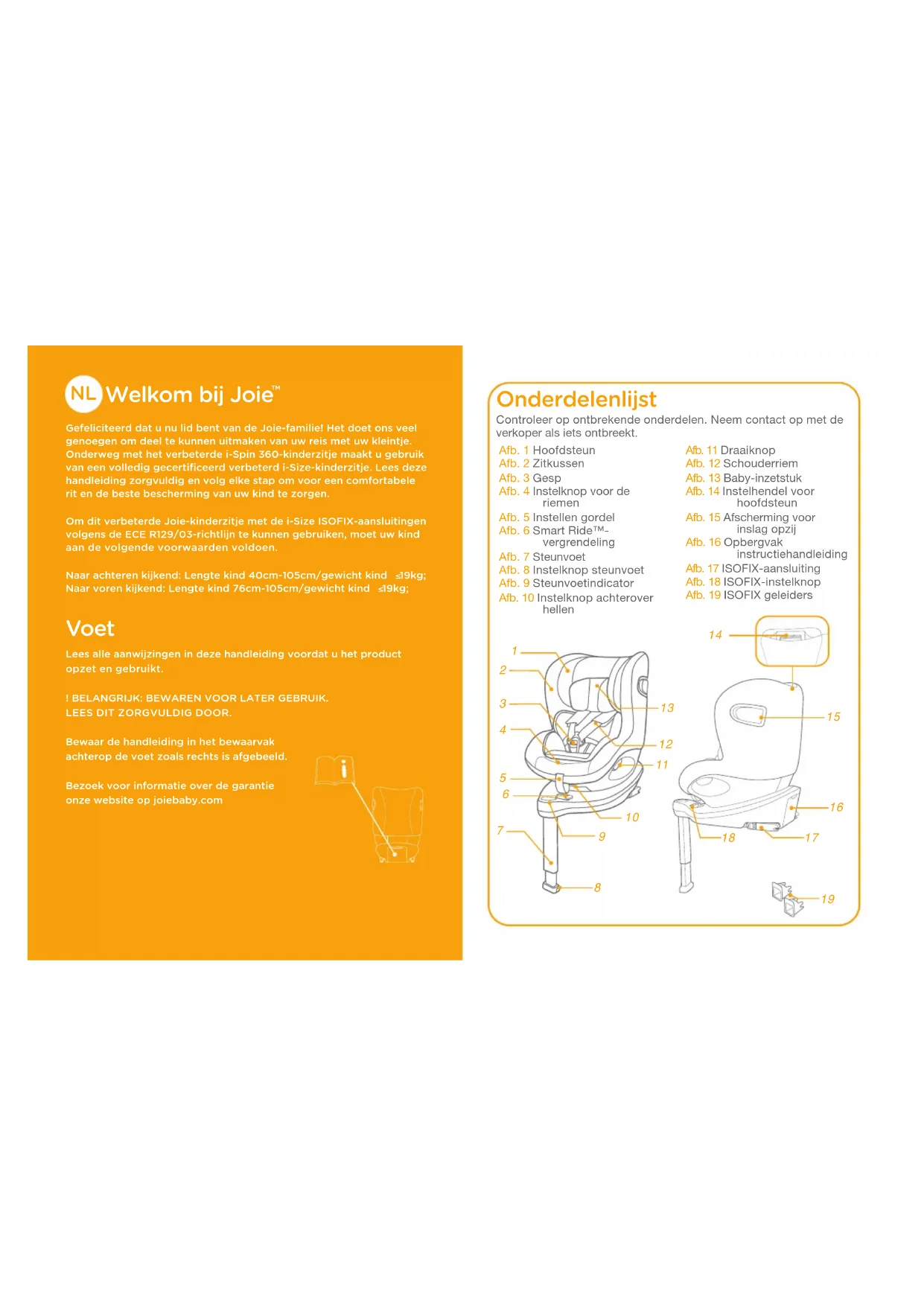 Gefeliciteerd dat u nu lid bent van de Joie-familie! Het doet ons veel genoegen om deel te kunnen uitmaken van uw reis met uw kleintje. Onderweg met het verbeterde i-Spin 360-kinderzitje maakt u gebruik van een volledig gecertificeerd verbeterd i-Size-kinderzitje. Lees deze handleiding zorgvuldig en volg elke stap om voor een comfortabele rit en de beste bescherming van uw kind te zorgen.Om dit verbeterde Joie-kinderzitje met de i-Size ISOFIX-aansluitingen volgens de ECE R129/03-richtlijn te kunnen gebruiken, moet uw kind aan de volgende voorwaarden voldoen.Naar achteren kijkend: Lengte kind 40cm-105cm/gewicht kind 19kg; Naar voren kijkend: Lengte kind 76cm-105cm/gewicht kind 19kg; Voet Lees alle aanwijzingen in deze handleiding voordat u het product opzet en gebruikt.! BELANGRIJK: BEWAREN VOOR LATER GEBRUIK.LEES DIT ZORGVULDIG DOOR.Bewaar de handleiding in het bewaarvak achterop de voet zoals rechts is afgebeeld.Bezoek voor informatie over de garantie onze website op joiebaby.com Onderdelenlijst Afb. 1 HoofdsteunAfb. 2 ZitkussenAfb. 3 GespAfb. 4 Instelknop voor de riemen Afb. 5 Instellen gordelAfb. 6 Smart Ride™-vergrendelingAfb. 7 SteunvoetAfb. 8 Instelknop steunvoetAfb. 9 SteunvoetindicatorAfb. 10 Instelknop achterover hellenAfb. 11 DraaiknopAfb. 12 SchouderriemAfb. 13 Baby-inzetstuk Afb. 14 Instelhendel voor hoofdsteunAfb. 15 Afscherming voor inslag opzijAfb. 16 Opbergvak instructiehandleidingAfb. 17 ISOFIX-aansluitingAfb. 18 ISOFIX-instelknopAfb. 19 ISOFIX geleidersControleer op ontbrekende onderdelen. Neem contact op met de verkoper als iets ontbreekt.