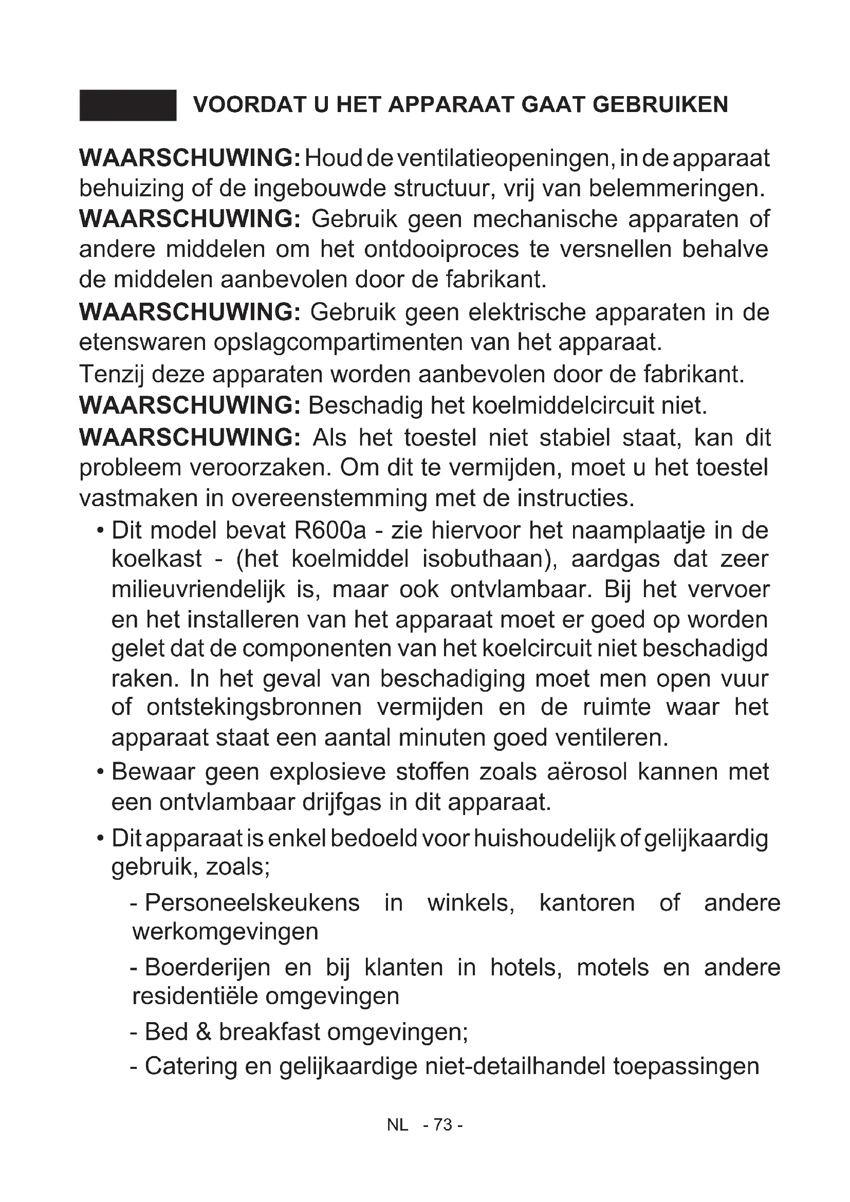 Fiche Produit ................................................................................................ 85 Installatie instructies sleepdeurmontage ...................................................... 86 -Deze gebruiksaanwijzing heeft betrekking op verschillende modellen. Daarom kunnen er verschillen voorkomen.NL - 73 - VOORDAT U HET APPARAAT GAAT GEBRUIKENDEEL 1. WAARSCHUWING: Houd de ventilatieopeningen, in de apparaat behuizing of de ingebouwde structuur, vrij van belemmeringen. WAARSCHUWING: Gebruik geen mechanische apparaten of andere middelen om het ontdooiproces te versnellen behalve de middelen aanbevolen door de fabrikant. WAARSCHUWING: Gebruik geen elektrische apparaten in de etenswaren opslagcompartimenten van het apparaat. Tenzij deze apparaten worden aanbevolen door de fabrikant. WAARSCHUWING: Beschadig het koelmiddelcircuit niet. WAARSCHUWING: Als het toestel niet stabiel staat, kan dit probleem veroorzaken. Om dit te vermijden, moet u het toestel vastmaken in overeenstemming met de instructies.
