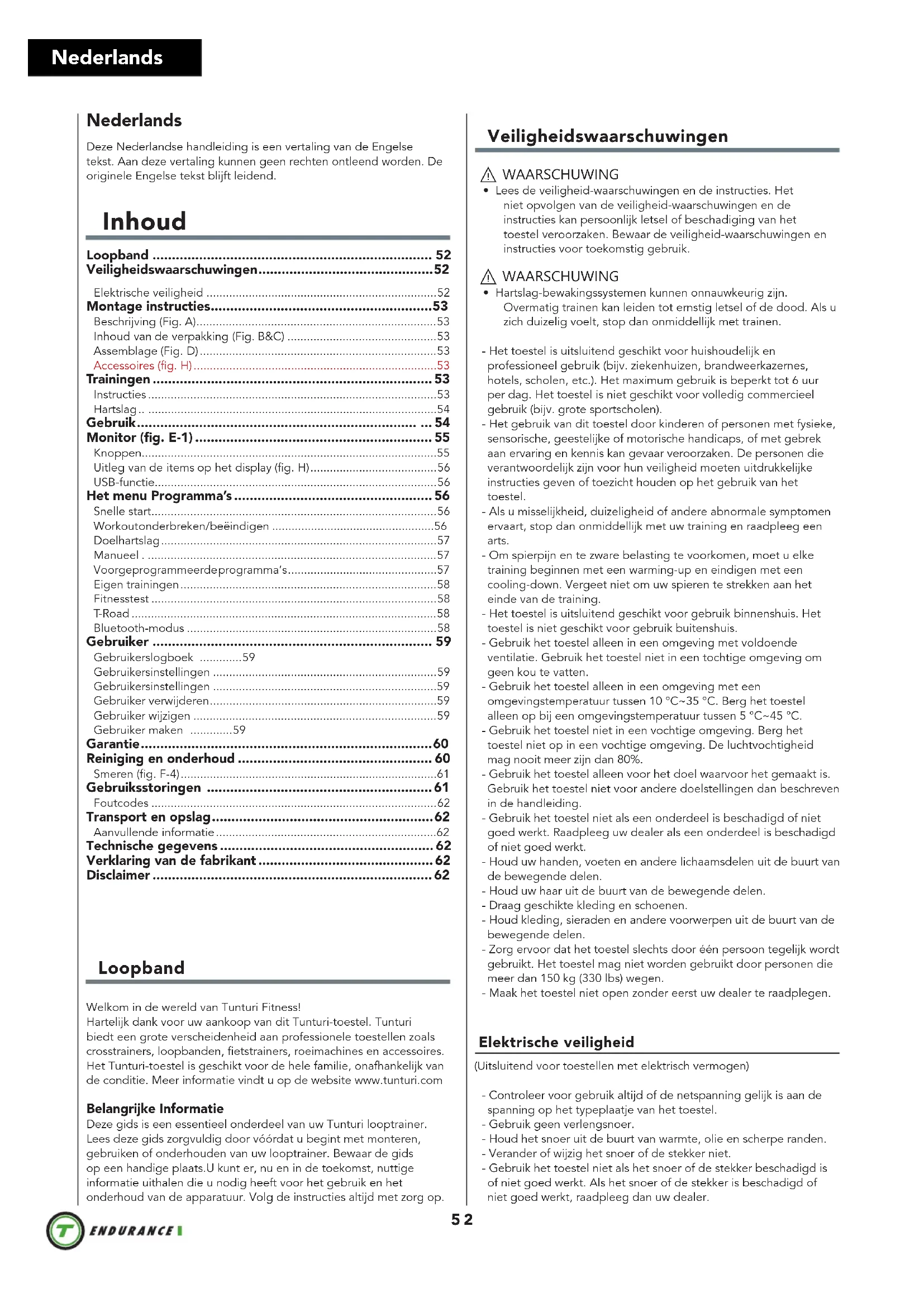 - Vitesse Km/H 0.5 ~ 16.0 Vitesse Mph 0.3 ~ 10.0 Inclinaison Étape 0 ~ 15 Longueur (replié) Cm 193.0 (137.0) Longueur (replié) Inch 76.0 (53.9) Largeur Cm 82.5 Largeur Inch 32.5 Hauteur (replié) Cm 149.0 (155.0) Hauteur (replié) Inch 58.7 (61.0) Poids Kg 117.0 Poids Lbs 257.9 Poids maxi utilisateur Kb 150 Poids maxi utilisateur Lbs 330 Récepteur de FC Khz 5.3 Khz Déclaration du fabricant Tunturi Fitness BV déclare que le produit est conforme aux directives et normes suivantes : EN 957 (HA), 89/336/CEE. Ce produit porte donc la marque CE. 12-2019 Tunturi New Fitness BV Purmerweg 1 1311 XE Almere Pays-Bas Limite de responsabilité © 2019 Tunturi New Fitness BV Tous les droits réservés. Le produit et le manuel sont sujets à modifications. Les spécifications peuvent hanger sans préavis. Check our website for the latest user manual version.52 Nederlands Loopband Welkom in de wereld van Tunturi Fitness!Hartelijk dank voor uw aankoop van dit Tunturi-toestel. Tunturi biedt een grote verscheidenheid aan professionele toestellen zoals crosstrainers, loopbanden, fietstrainers, roeimachines en accessoires. Het Tunturi-toestel is geschikt voor de hele familie, onafhankelijk van de conditie. Meer informatie vindt u op de website www.tunturi.comBelangrijke InformatieDeze gids is een essentieel onderdeel van uw Tunturi looptrainer. Lees deze gids zorgvuldig door vóórdat u begint met monteren, gebruiken of onderhouden van uw looptrainer. Bewaar de gids op een handige plaats.U kunt er, nu en in de toekomst, nuttige informatie uithalen die u nodig heeft voor het gebruik en het onderhoud van de apparatuur. Volg de instructies altijd met zorg op. Nederlands Deze Nederlandse handleiding is een vertaling van de Engelse tekst. Aan deze vertaling kunnen geen rechten ontleend worden. De originele Engelse tekst blijft leidend. Inhoud Loopband 52Veiligheidswaarschuwingen 52 Elektrische veiligheid p. 52