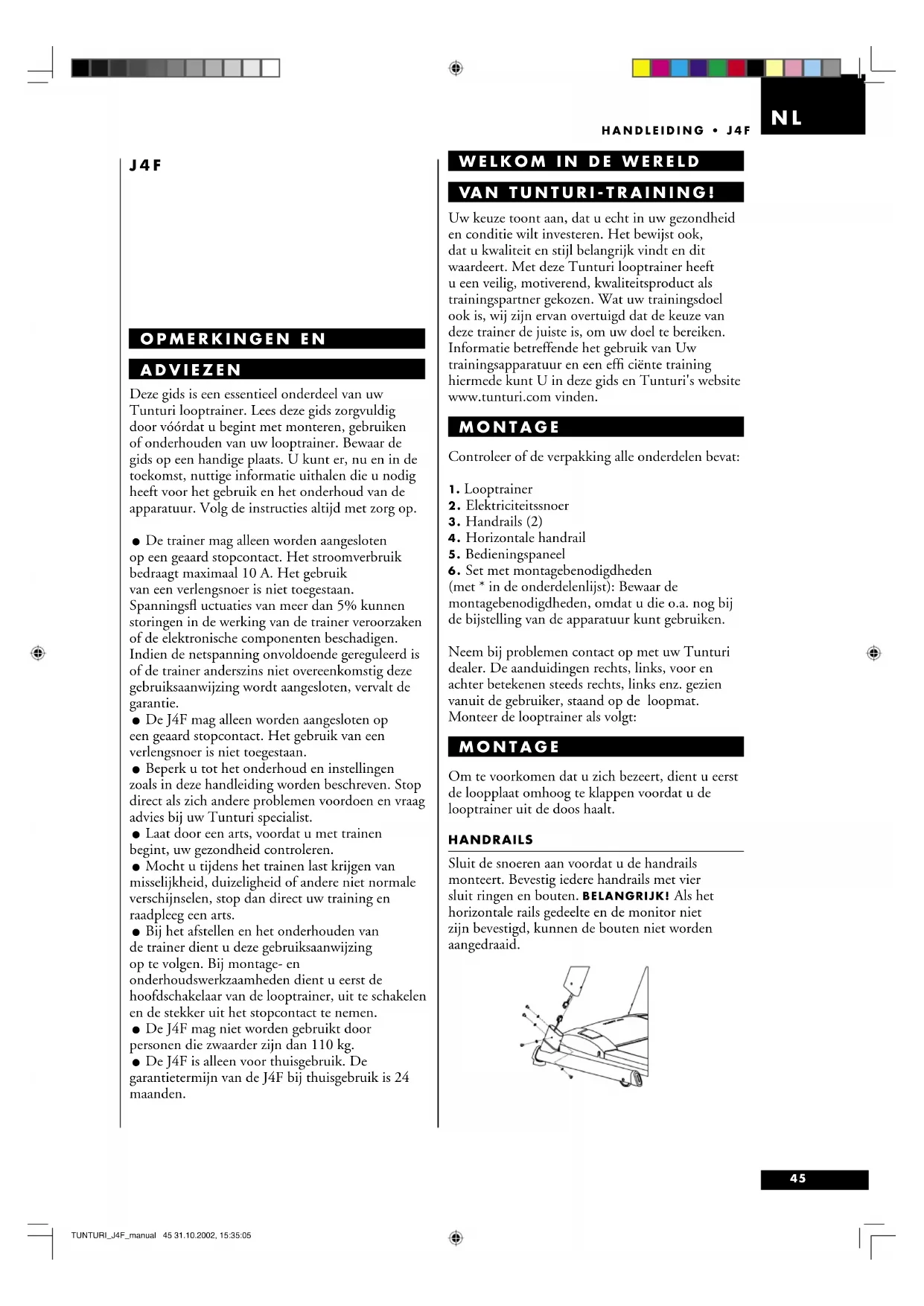 (met * in de onderdelenlijst): Bewaar de montagebenodigdheden, omdat u die o.a. nog bij de bijstelling van de apparatuur kunt gebruiken. Neem bij problemen contact op met uw Tunturi dealer. De aanduidingen rechts, links, voor en achter betekenen steeds rechts, links enz. gezien vanuit de gebruiker, staand op de loopmat. Monteer de looptrainer als volgt: MONTAGE Om te voorkomen dat u zich bezeert, dient u eerst de loopplaat omhoog te klappen voordat u de looptrainer uit de doos haalt. HANDRAILS Sluit de snoeren aan voordat u de handrails monteert. Bevestig iedere handrails met vier sluit ringen en bouten. BELANGRIJK! Als het horizontale rails gedeelte en de monitor niet zijn bevestigd, kunnen de bouten niet worden aangedraaid. TUNTURI_J4F_manual 45 31.10.2002, 15:35:0546