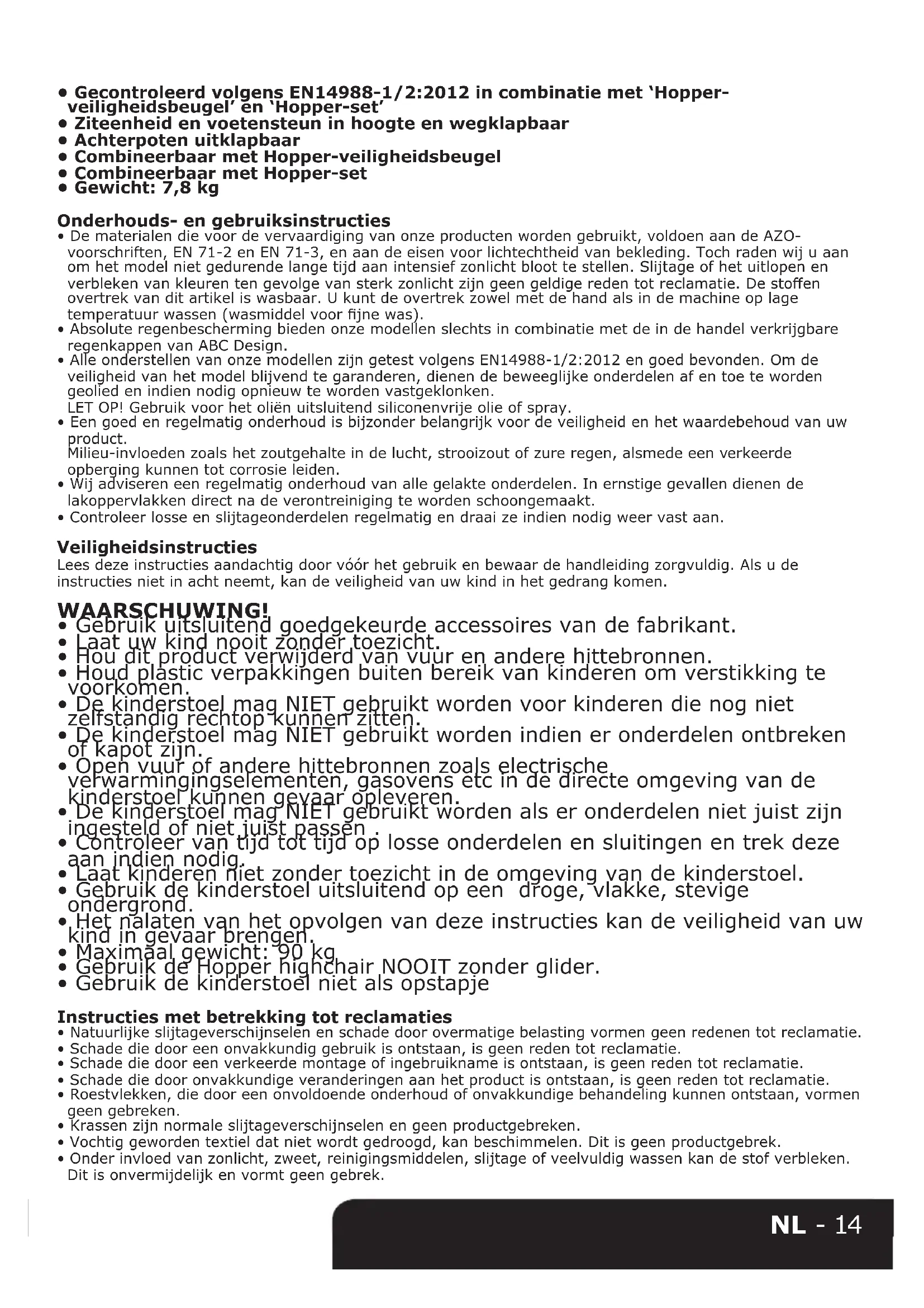 - Gebruik de kinderstoel niet als opstapje Instructies met betrekking tot reclamaties