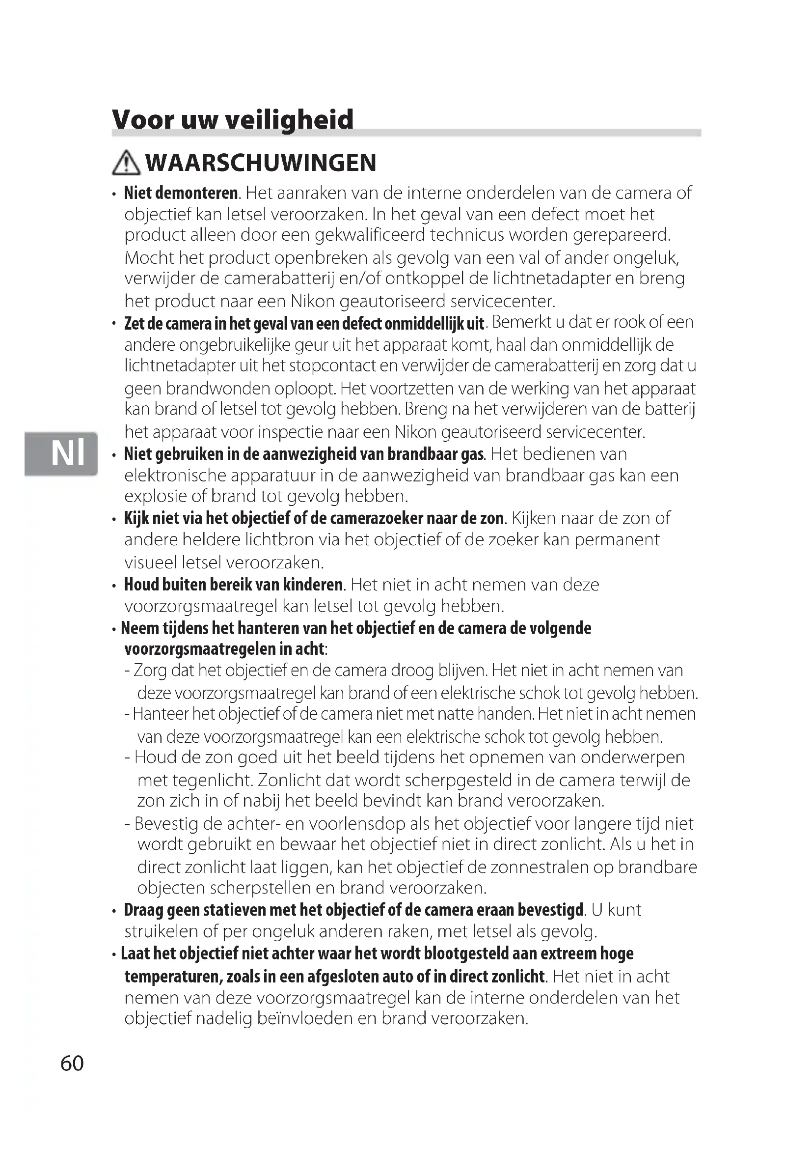 - Niet demonteren. Het aanraken van de interne onderdelen van de camera of objectief kan letsel veroorzaken. In het geval van een defect moet het product alleen door een gekwalificeerd technicus worden gerepareerd. Mocht het product openbreken als gevolg van een val of ander ongeluk, verwijder de camerabatterij en/of ontkoppel de lichtnetadapter en breng het product naar een Nikon geautoriseerd servicecenter.