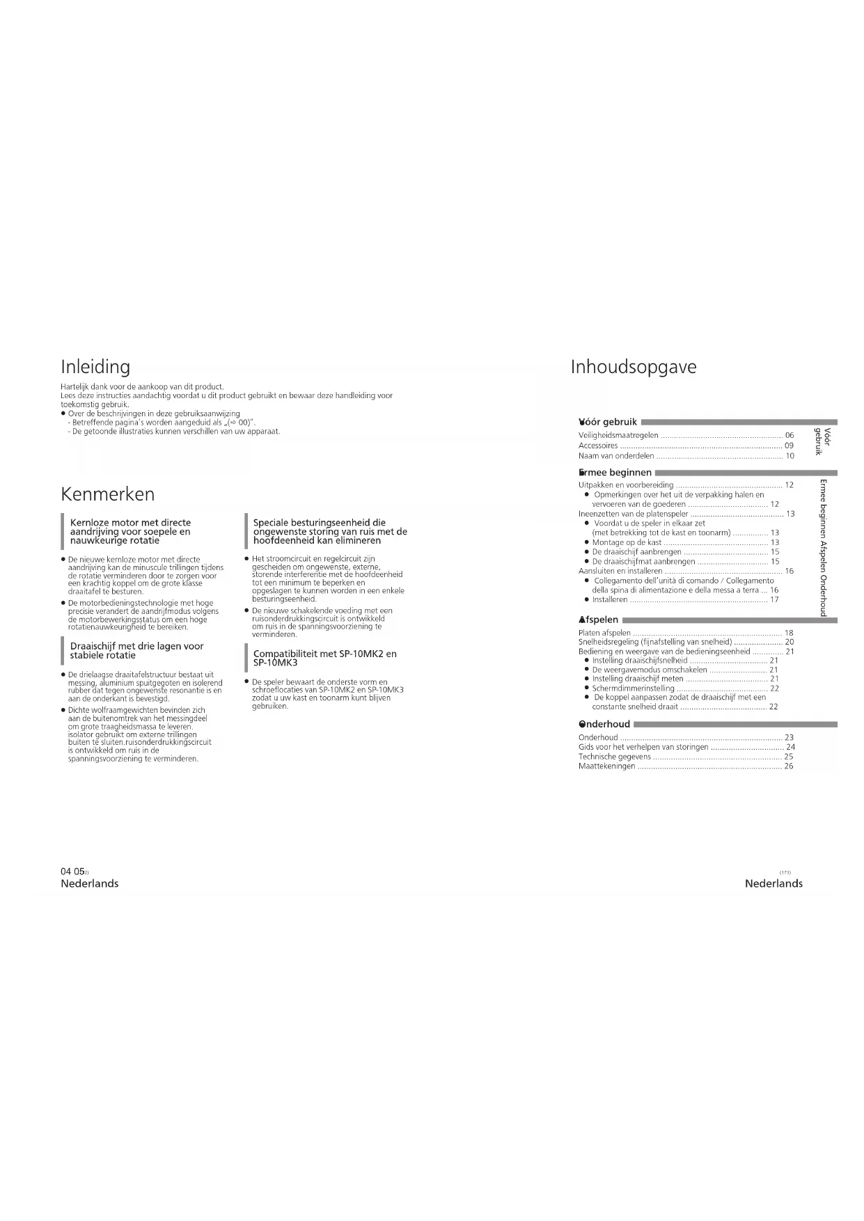 22) Gids voor het verhelpen van storingen Technische gegevens AlgemeenVoeding 110 - 240 V AC, 50/60 HzStroomverbruik 10 W (spanning AAN)0,05 W (spanning UIT) Afmetingen(B×H×D)<Bedieningseenheid> 110×84×350 mm<Hoofdeenheid> 365×109×365 mmGewicht <Bedieningseenheid> Ong. 2,1 k <Hoofdeenheid>Ong. 18.2 k Gebruikstemperatuur 0 °C tot 40 °CBedrijfsvochtigheid 35 % tot 80 % RH (zonder condensatie)PlatenspelergedeelteAandrijving Directe aandrijvingMotor Gelijkstroommotor zonder borstelsDraaischijf Messing en aluminium gegoten gecombineerd Diameter: 323 mmGewicht: Ong. 7,9 k