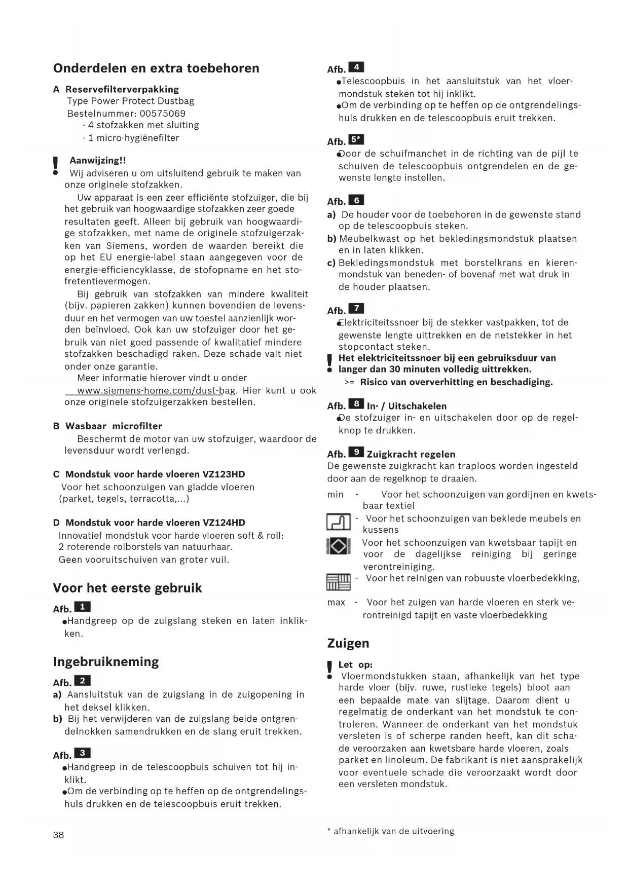 Aanwijzing!! Wij adviseren u om uitsluitend gebruik te maken van onze originele stofzakken. Uw apparaat is een zeer efficiënte stofzuiger, die bij het gebruik van hoogwaardige stofzakken zeer goede resultaten geeft. Alleen bij gebruik van hoogwaardi- ge stofzakken, met name de originele stofzuigerzak- ken van Siemens, worden de waarden bereikt die op het EU energie-label staan aangegeven voor de energie-efficiencyklasse, de stofopname en het sto- fretentievermogen. Bij gebruik van stofzakken van mindere kwaliteit (bijv. papieren zakken) kunnen bovendien de levens- duur en het vermogen van uw toestel aanzienlijk wor- den beïnvloed. Ook kan uw stofzuiger door het ge- bruik van niet goed passende of kwalitatief mindere stofzakken beschadigd raken. Deze schade valt niet onder onze garantie. Meer informatie hierover vindt u onder www.siemens-home.com/dust-bag. Hier kunt u ook onze originele stofzuigerzakken bestellen. B Wasbaar microfilter Beschermt de motor van uw stofzuiger, waardoor de levensduur wordt verlengd. C Mondstuk voor harde vloeren VZ123HD Voor het schoonzuigen van gladde vloeren (parket, tegels, terracotta,...) D Mondstuk voor harde vloeren VZ124HD Innovatief mondstuk voor harde vloeren soft & roll: 2 roterende rolborstels van natuurhaar. Geen vooruitschuiven van groter vuil. Voor het eerste gebruik Afb.