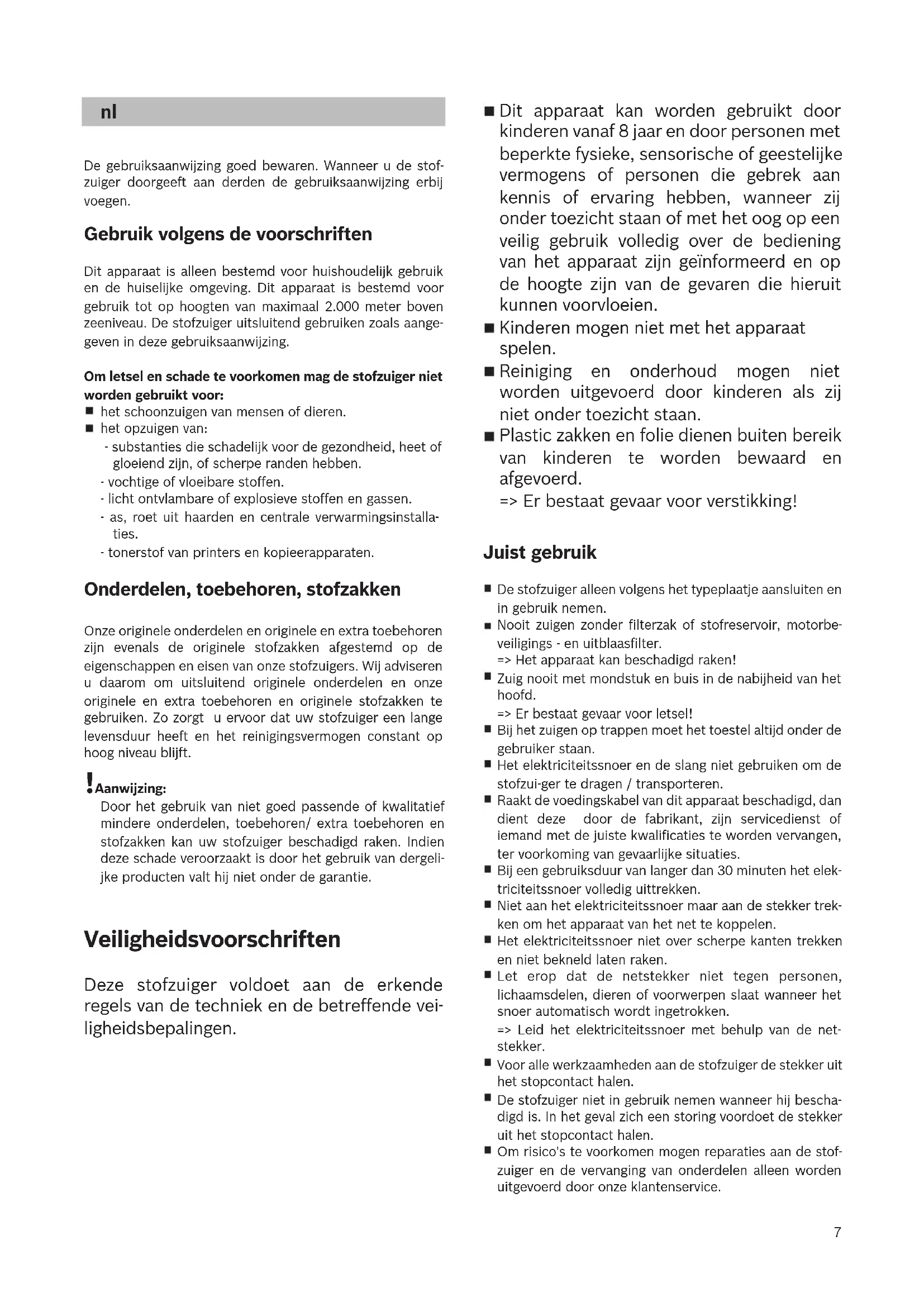 De gebruiksaanwijzing goed bewaren. Wanneer u de stof- zuiger doorgeeft aan derden de gebruiksaanwijzing erbij voegen. Gebruik volgens de voorschriften Dit apparaat is alleen bestemd voor huishoudelijk gebruik en de huiselijke omgeving. Dit apparaat is bestemd voor gebruik tot op hoogten van maximaal 2.000 meter boven zeeniveau. De stofzuiger uitsluitend gebruiken zoals aange- geven in deze gebruiksaanwijzing. Om letsel en schade te voorkomen mag de stofzuiger niet worden gebruikt voor: het schoonzuigen van mensen of dieren. het opzuigen van: - substanties die schadelijk voor de gezondheid, heet of gloeiend zijn, of scherpe randen hebben. - vochtige of vloeibare stoffen. - licht ontvlambare of explosieve stoffen en gassen. - as, roet uit haarden en centrale verwarmingsinstalla- ties. - tonerstof van printers en kopieerapparaten. Onderdelen, toebehoren, stofzakken Onze originele onderdelen en originele en extra toebehoren zijn evenals de originele stofzakken afgestemd op de eigenschappen en eisen van onze stofzuigers. Wij adviseren u daarom om uitsluitend originele onderdelen en onze originele en extra toebehoren en originele stofzakken te gebruiken. Zo zorgt u ervoor dat uw stofzuiger een lange levensduur heeft en het reinigingsvermogen constant op hoog niveau blijft. !Aanwijzing: Door het gebruik van niet goed passende of kwalitatief mindere onderdelen, toebehoren/ extra toebehoren en stofzakken kan uw stofzuiger beschadigd raken. Indien deze schade veroorzaakt is door het gebruik van dergeli- jke producten valt hij niet onder de garantie. Veiligheidsvoorschriften Deze stofzuiger voldoet aan de erkende regels van de techniek en de betreffende vei- ligheidsbepalingen.8 De stofzuiger beschermen tegen weersinvloeden, vocht en hittebronnen. Zorg ervoor dat er geen brandbare of alcoholhoudende stoffen op de filters (filterzak, motorbeveiligingsfilter, uit- blaasfilter, etc.) terechtkomen. De stofzuiger is niet geschikt voor gebruik op bouwplaat- sen. => Opzuigen van bouwpuin kan leiden tot beschadiging van het toestel. Wanneer de stofzuiger niet gebruikt wordt het toestel uit- schakelen en de stekker uit het stopcontact halen. Versleten apparaten onmiddellijk onbruikbaar maken, het toestel daarna op een verantwoorde wijze afvoeren. !Let op Als de zekering in de meterkast bij het inschakelen van het toestel wordt geactiveerd, dan kan dit worden ver- oorzaakt doordat er tegelijkertijd meerdere elektrische apparaten met hoge aansluitwaarde op hetzelfde stroom- circuit zijn aangesloten. De zekering wordt onvermijdelijk geactiveerd wanneer u alvorens het toestel aan te zetten de laagste stand instelt en pas daarna een hogere stand kiest. Instructies voor recycling Verpakking De verpakking beschermt de stofzuiger tegen beschadi- ging tijdens het transport. Deze bestaat uit milieuvrien- delijk materiaal en is daarom recyclebaar. Breng verpak- kingsmateriaal dat u niet meer nodig heeft naar een ver- zamelplaats voor de verwerking van afval. Oude toestellen Oude apparaten bevatten vaak nog waardevol materiaal. Geef daarom uw oude toestel voor hergebruik af aan uw handelaar of een recyclecentrum. Informatie over actuele methoden van afvalverwijdering kunt u krijgen bij uw han- delaar of uw gemeente. Afvoer van filters en filterzakken Filter en filterzak zijn gemaakt van milieuvriendelijke materialen. Voor zover deze geen stoffen bevatten die niet toegestaan zijn als huisvuil, kunnen ze via het nor- male huisvuil worden afgevoerd. Informatie op het energielabel Dit is een stofzuiger met een basisslang, bestemd voor algemene doeleinden. Om op tapijt en harde vloeren de aangegeven energie-effi- ciëntie en reinigingsprestatieklasse te bereiken gebruikt u het omschakelbare universele mondstuk. De berekeningen zijn gebaseerd op de Gedelegeerde Verordening (EU) Nr. 665/2013 van de Commissie van 3 mei 2013 ter aanvulling van richtlijn 2010/30/EU. Alle procedures die niet precies in deze handleiding beschreven staan, zijn uitgevoerd op basis van de norm EN 60312-1:2017*. *Aangezien de levensduurtest voor de motor wordt uitge- voerd met een leeg stofreservoir, dient de aangegeven levensduur van de motor voor het testen met een halfvol stofreservoir met 10% te worden verhoogd.