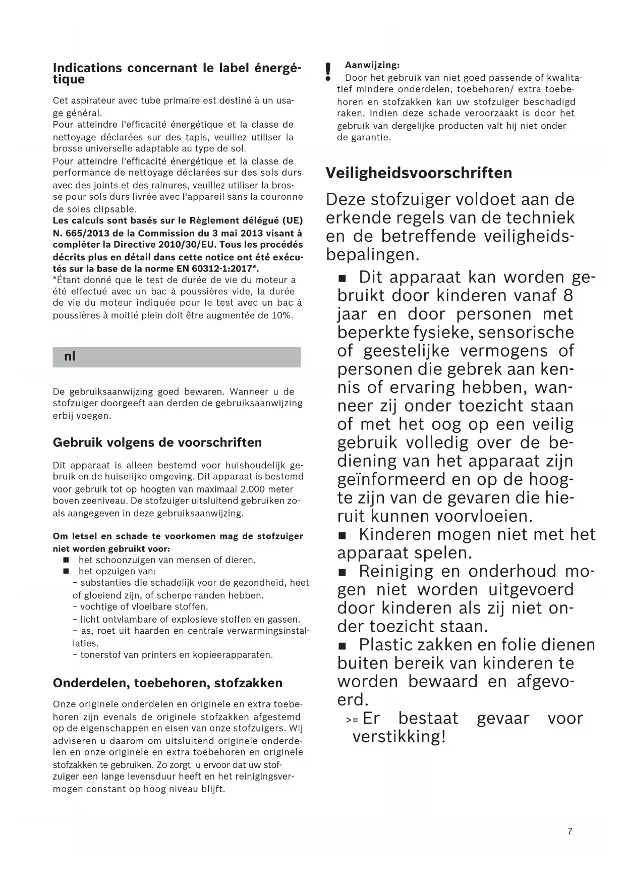 Aanwijzing: Door het gebruik van niet goed passende of kwalita-tief mindere onderdelen, toebehoren/ extra toebe-horen en stofzakken kan uw stofzuiger beschadigd raken. Indien deze schade veroorzaakt is door het gebruik van dergelijke producten valt hij niet onder de garantie. Veiligheidsvoorschriften Deze stofzuiger voldoet aan de erkende regels van de techniek en de betreffende veiligheids- bepalingen. Dit apparaat kan worden ge- bruikt door kinderen vanaf 8 jaar en door personen met beperkte fysieke, sensorische of geestelijke vermogens of personen die gebrek aan ken- nis of ervaring hebben, wan- neer zij onder toezicht staan of met het oog op een veilig gebruik volledig over de be- diening van het apparaat zijn geïnformeerd en op de hoog- te zijn van de gevaren die hie- ruit kunnen voorvloeien. Kinderen mogen niet met het apparaat spelen. Reiniging en onderhoud mo- gen niet worden uitgevoerd door kinderen als zij niet on- der toezicht staan. Plastic zakken en folie dienen buiten bereik van kinderen te worden bewaard en afgevo- erd. >= Er bestaat gevaar voor verstikking! Indications concernant le label énergé- tique Cet aspirateur avec tube primaire est destiné à un usa-ge général. Pour atteindre l'efficacité énergétique et la classe de nettoyage déclarées sur des tapis, veuillez utiliser la brosse universelle adaptable au type de sol. Pour atteindre l'efficacité énergétique et la classe de performance de nettoyage déclarées sur des sols durs avec des joints et des rainures, veuillez utiliser la bros-se pour sols durs livrée avec l'appareil sans la couronne de soies clipsable.Les calculs sont basés sur le Règlement délégué (UE) N. 665/2013 de la Commission du 3 mai 2013 visant à compléter la Directive 2010/30/EU. Tous les procédés décrits plus en détail dans cette notice ont été exécu-tés sur la base de la norme EN 60312-1:2017*.*Étant donné que le test de durée de vie du moteur a été effectué avec un bac à poussières vide, la durée de vie du moteur indiquée pour le test avec un bac à poussières à moitié plein doit être augmentée de 10%.8 Juist gebruik De stofzuiger alleen volgens het typeplaatje aansluiten en in gebruik nemen. Nooit zuigen zonder filterzak of stofreservoir, motor- beveiligings- en uitblaasfilter. >= Het apparaat kan beschadigd raken! Zuig nooit met mondstuk en buis in de nabijheid van het hoofd. >= Er bestaat gevaar voor letsel! Bij het zuigen op trappen moet het toestel altijd onder de gebruiker staan. Het elektriciteitssnoer en de slang niet gebruiken om de stofzui-ger te dragen / transporteren. Raakt de voedingskabel van dit apparaat beschadigd, dan dient deze door de fabrikant, zijn servicedienst of iemand met de juiste kwalificaties te worden vervan- gen, ter voorkoming van gevaarlijke situaties. Bij een gebruiksduur van langer dan 30 minuten het elektriciteitssnoer volledig uittrekken. Niet aan het elektriciteitssnoer maar aan de stekker trekken om het apparaat van het net te koppelen. Het elektriciteitssnoer niet over scherpe kanten trek- ken en niet bekneld laten raken. Let erop dat de netstekker niet tegen personen, lichaamsdelen, dieren of voorwerpen slaat wanneer het snoer automatisch wordt ingetrokken. >= Leid het elektriciteitssnoer met behulp van de netstekker. Voor alle werkzaamheden aan de stofzuiger de stekker uit het stopcontact halen. De stofzuiger niet in gebruik nemen wanneer hij be- schadigd is. In het geval zich een storing voordoet de stekker uit het stopcontact halen. Om risico's te voorkomen mogen reparaties aan de stofzuiger en de vervanging van onderdelen alleen worden uitgevoerd door onze klantenservice. De stofzuiger beschermen tegen weersinvloeden, vocht en hittebronnen. Zorg ervoor dat er geen brandbare of alcoholhouden- de stoffen op de filters (filterzak, motorbeveiligingsfil- ter, uitblaasfilter, etc.) terechtkomen. De stofzuiger is niet geschikt voor gebruik op bouw- plaatsen. >= Opzuigen van bouwpuin kan leiden tot beschadi- ging van het toestel. Wanneer de stofzuiger niet gebruikt wordt het toestel uitschakelen en de stekker uit het stopcontact halen. Versleten apparaten onmiddellijk onbruikbaar maken, het toestel daarna op een verantwoorde wijze afvo- eren.
