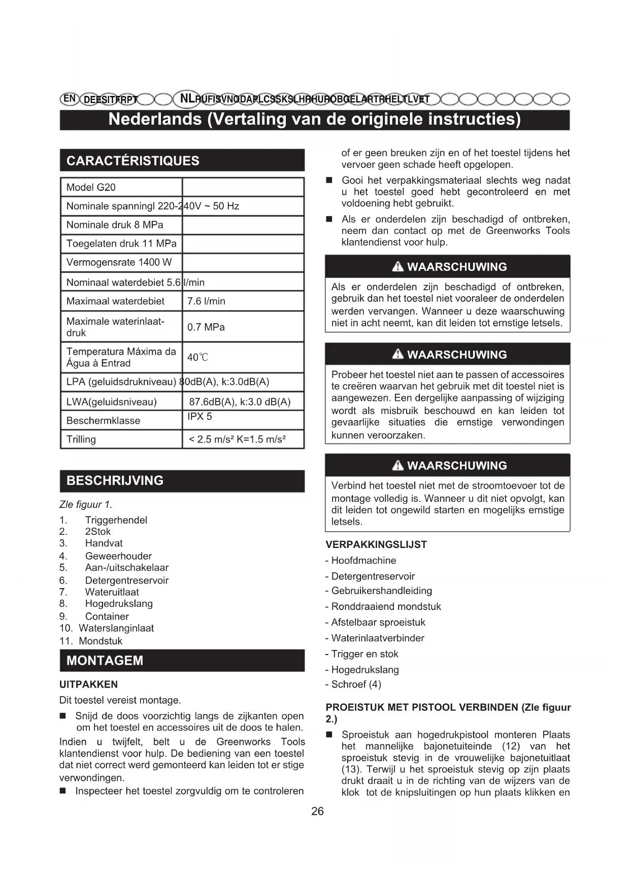 MONTAGEM UITPAKKEN Dit toestel vereist montage. Snijd de doos voorzichtig langs de zijkanten open om het toestel en accessoires uit de doos te halen. Indien u twijfelt, belt u de Greenworks Tools klantendienst voor hulp. De bediening van een toestel dat niet correct werd gemonteerd kan leiden tot er stige verwondingen. Inspecteer het toestel zorgvuldig om te controleren of er geen breuken zijn en of het toestel tijdens het vervoer geen schade heeft opgelopen. Gooi het verpakkingsmateriaal slechts weg nadat u het toestel goed hebt gecontroleerd en met voldoening hebt gebruikt. Als er onderdelen zijn beschadigd of ontbreken, neem dan contact op met de Greenworks Tools klantendienst voor hulp. WAARSCHUWING Als er onderdelen zijn beschadigd of ontbreken, gebruik dan het toestel niet vooraleer de onderdelen werden vervangen. Wanneer u deze waarschuwing niet in acht neemt, kan dit leiden tot ernstige letsels. WAARSCHUWING Probeer het toestel niet aan te passen of accessoires te creëren waarvan het gebruik met dit toestel niet is aangewezen. Een dergelijke aanpassing of wijziging wordt als misbruik beschouwd en kan leiden tot gevaarlijke situaties die ernstige verwondingen kunnen veroorzaken. WAARSCHUWING Verbind het toestel niet met de stroomtoevoer tot de montage volledig is. Wanneer u dit niet opvolgt, kan dit leiden tot ongewild starten en mogelijks ernstige letsels. VERPAKKINGSLIJST - Hoofdmachine - Detergentreservoir - Gebruikershandleiding - Ronddraaiend mondstuk - Afstelbaar sproeistuk - Waterinlaatverbinder - Trigger en stok - Hogedrukslang - Schroef (4) PROEISTUK MET PISTOOL VERBINDEN (Zle figuur 2.) Sproeistuk aan hogedrukpistool monteren Plaats het mannelijke bajonetuiteinde (12) van het sproeistuk stevig in de vrouwelijke bajonetuitlaat (13). Terwijl u het sproeistuk stevig op zijn plaats drukt draait u in de richting van de wijzers van de klok tot de knipsluitingen op hun plaats klikken enNederlands (Vertaling van de originele instructies)
