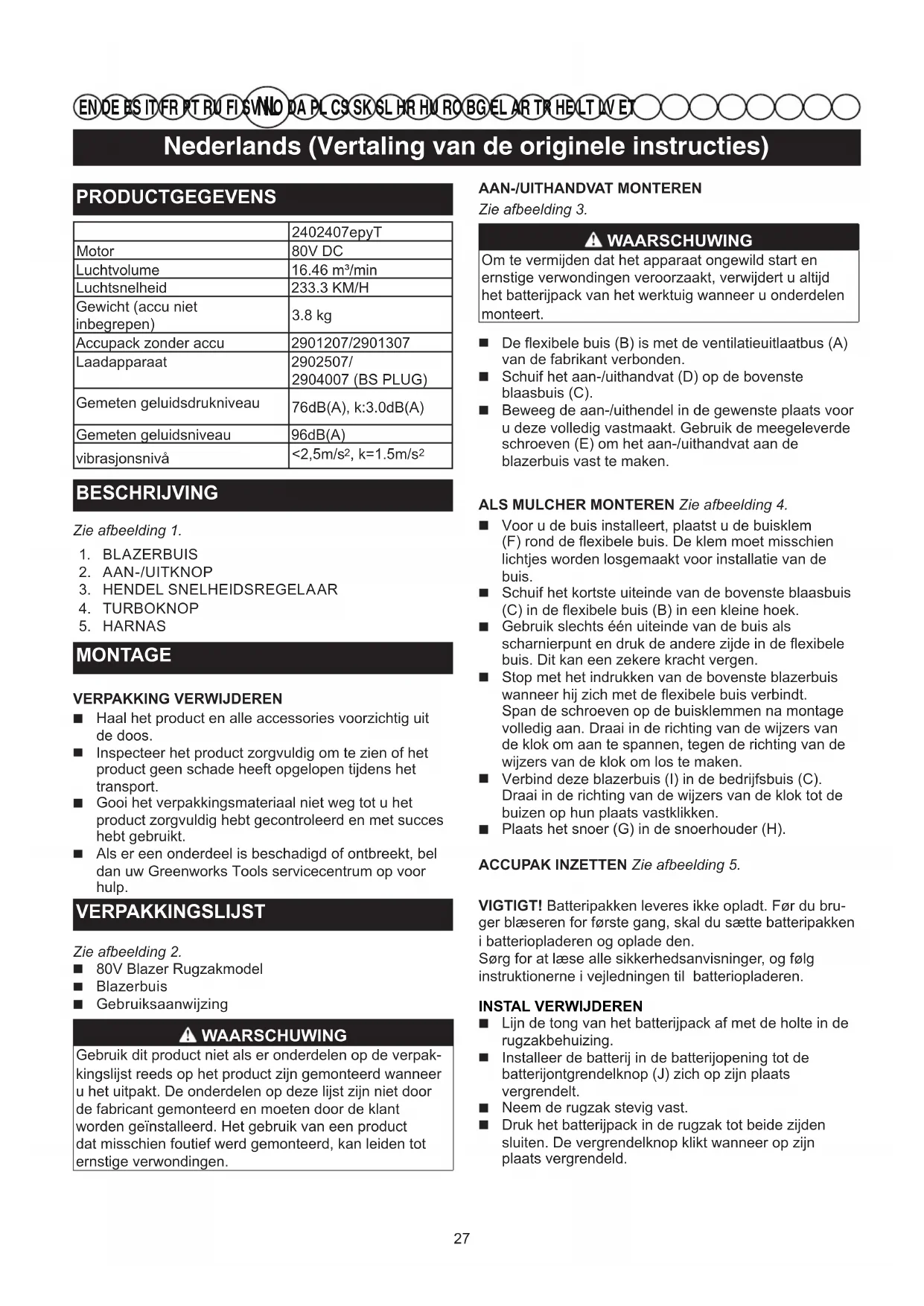 MONTAGE VERPAKKING VERWIJDEREN Haal het product en alle accessories voorzichtig uit de doos. Inspecteer het product zorgvuldig om te zien of het product geen schade heeft opgelopen tijdens het transport. Gooi het verpakkingsmateriaal niet weg tot u het product zorgvuldig hebt gecontroleerd en met succes hebt gebruikt. Als er een onderdeel is beschadigd of ontbreekt, bel dan uw Greenworks Tools servicecentrum op voor hulp. VERPAKKINGSLIJST Zie afbeelding 2. 80V Blazer Rugzakmodel Blazerbuis Gebruiksaanwijzing WAARSCHUWING Gebruik dit product niet als er onderdelen op de verpak-kingslijst reeds op het product zijn gemonteerd wanneer u het uitpakt. De onderdelen op deze lijst zijn niet door de fabricant gemonteerd en moeten door de klant worden geïnstalleerd. Het gebruik van een product dat misschien foutief werd gemonteerd, kan leiden tot ernstige verwondingen.AAN-/UITHANDVAT MONTERENZie afbeelding 3. WAARSCHUWING Om te vermijden dat het apparaat ongewild start enernstige verwondingen veroorzaakt, verwijdert u altijdhet batterijpack van het werktuig wanneer u onderdelen monteert. De flexibele buis (B) is met de ventilatieuitlaatbus (A) van de fabrikant verbonden. Schuif het aan-/uithandvat (D) op de bovenste blaasbuis (C). Beweeg de aan-/uithendel in de gewenste plaats voor u deze volledig vastmaakt. Gebruik de meegeleverde schroeven (E) om het aan-/uithandvat aan de blazerbuis vast te maken.ALS MULCHER MONTEREN Zie afbeelding 4. Voor u de buis installeert, plaatst u de buisklem (F) rond de flexibele buis. De klem moet misschien lichtjes worden losgemaakt voor installatie van de buis. Schuif het kortste uiteinde van de bovenste blaasbuis (C) in de flexibele buis (B) in een kleine hoek. Gebruik slechts één uiteinde van de buis als scharnierpunt en druk de andere zijde in de flexibele buis. Dit kan een zekere kracht vergen. Stop met het indrukken van de bovenste blazerbuis wanneer hij zich met de flexibele buis verbindt. Span de schroeven op de buisklemmen na montage volledig aan. Draai in de richting van de wijzers van de klok om aan te spannen, tegen de richting van de wijzers van de klok om los te maken. Verbind deze blazerbuis (I) in de bedrijfsbuis (C). Draai in de richting van de wijzers van de klok tot de buizen op hun plaats vastklikken. Plaats het snoer (G) in de snoerhouder (H).ACCUPAK INZETTEN Zie afbeelding 5.VIGTIGT! Batteripakken leveres ikke opladt. Før du bru-ger blæseren for første gang, skal du sætte batteripakken i batteriopladeren og oplade den.Sørg for at læse alle sikkerhedsanvisninger, og følg instruktionerne i vejledningen til batteriopladeren.INSTAL VERWIJDEREN Lijn de tong van het batterijpack af met de holte in de rugzakbehuizing. Installeer de batterij in de batterijopening tot de batterijontgrendelknop (J) zich op zijn plaats vergrendelt. Neem de rugzak stevig vast. Druk het batterijpack in de rugzak tot beide zijden sluiten. De vergrendelknop klikt wanneer op zijn plaats vergrendeld. 27English (original instructions) Nederlands (Vertaling van de originele instructies)