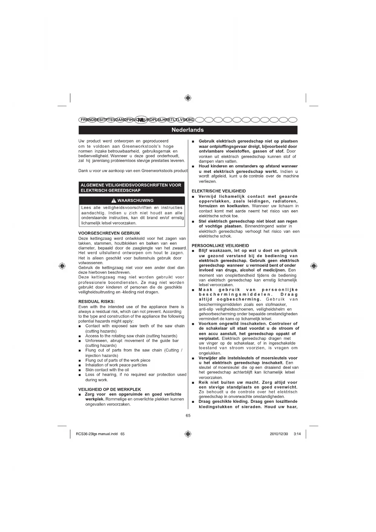 Houd het werktuig alleen aan de geïsoleerde handvatten vast omdat de zaagketting met verborgen kabels in contact kan komen. Zaagkettingen die in contact komen met een kabel "onder spanning" kunnen blootgestelde metalen onderdelen van het werktuig "onder spanning" brengen en kunnen de bediener een elektrische schok toedienen. RCS36-23lgs manual.indd 66RCS36-23lgs manual.indd 66 2010/12/30 3:142010/12/30 3:1467 Nederlands