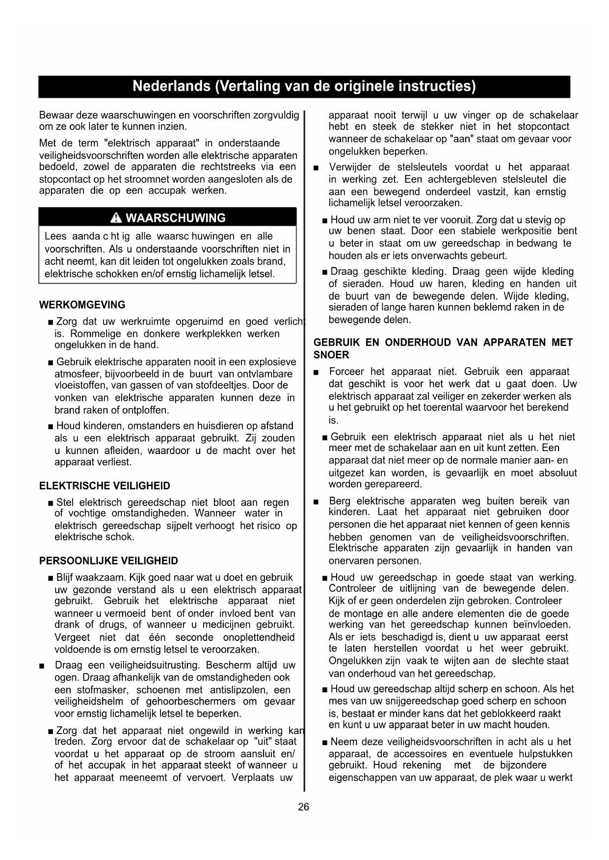 Recicle os materiais em vez de pô-los directamente no lixo doméstico. Para proteger o ambiente, a ferramenta, os acessórios e as embalagens devem ser seleccionados. SÍMBOLO Alerta de Segurança V Volts Reciprocidade por minuto Corrente directa Conformidade CE Agradecemos que leia atentamente as instruções antes de iniciar a máquina. Utilize uma máscara de proteção contra o pó Use protecção para os ouvidos Use protecção para os olhos Reciclar26 27 Nederlands (Vertaling van de originele instructies) Nederlands (Vertaling van de originele instructies) Bewaar deze waarschuwingen en voorschriften zorgvuldig om ze ook later te kunnen inzien. Met de term "elektrisch apparaat" in onderstaande veiligheidsvoorschriften worden alle elektrische apparaten bedoeld, zowel de apparaten die rechtstreeks via een stopcontact op het stroomnet worden aangesloten als de apparaten die op een accupak werken. WAARSCHUWING Lees aanda c ht ig alle waarsc huwingen en alle voorschriften. Als u onderstaande voorschriften niet in acht neemt, kan dit leiden tot ongelukken zoals brand, elektrische schokken en/of ernstig lichamelijk letsel. WERKOMGEVING ■ Zorg dat uw werkruimte opgeruimd en goed verlicht is. Rommelige en donkere werkplekken werken ongelukken in de hand. ■ Gebruik elektrische apparaten nooit in een explosieve atmosfeer, bijvoorbeeld in de buurt van ontvlambare vloeistoffen, van gassen of van stofdeeltjes. Door de vonken van elektrische apparaten kunnen deze in brand raken of ontploffen. ■ Houd kinderen, omstanders en huisdieren op afstand als u een elektrisch apparaat gebruikt. Zij zouden u kunnen afleiden, waardoor u de macht over het apparaat verliest. ELEKTRISCHE VEILIGHEID ■ Stel elektrisch gereedschap niet bloot aan regen of vochtige omstandigheden. Wanneer water in elektrisch gereedschap sijpelt verhoogt het risico op elektrische schok. PERSOONLIJKE VEILIGHEID ■ Blijf waakzaam. Kijk goed naar wat u doet en gebruik uw gezonde verstand als u een elektrisch apparaat gebruikt. Gebruik het elektrische apparaat niet wanneer u vermoeid bent of onder invloed bent van drank of drugs, of wanneer u medicijnen gebruikt. Vergeet niet dat één seconde onoplettendheid voldoende is om ernstig letsel te veroorzaken. ■ Draag een veiligheidsuitrusting. Bescherm altijd uw ogen. Draag afhankelijk van de omstandigheden ook een stofmasker, schoenen met antislipzolen, een veiligheidshelm of gehoorbeschermers om gevaar voor ernstig lichamelijk letsel te beperken. ■ Zorg dat het apparaat niet ongewild in werking kan treden. Zorg ervoor dat de schakelaar op "uit" staat voordat u het apparaat op de stroom aansluit en/ of het accupak in het apparaat steekt of wanneer u het apparaat meeneemt of vervoert. Verplaats uw apparaat nooit terwijl u uw vinger op de schakelaar hebt en steek de stekker niet in het stopcontact wanneer de schakelaar op "aan" staat om gevaar voor ongelukken beperken. ■ Verwijder de stelsleutels voordat u het apparaat in werking zet. Een achtergebleven stelsleutel die aan een bewegend onderdeel vastzit, kan ernstig lichamelijk letsel veroorzaken. ■ Houd uw arm niet te ver vooruit. Zorg dat u stevig op uw benen staat. Door een stabiele werkpositie bent u beter in staat om uw gereedschap in bedwang te houden als er iets onverwachts gebeurt. ■ Draag geschikte kleding. Draag geen wijde kleding of sieraden. Houd uw haren, kleding en handen uit de buurt van de bewegende delen. Wijde kleding, sieraden of lange haren kunnen beklemd raken in de bewegende delen.