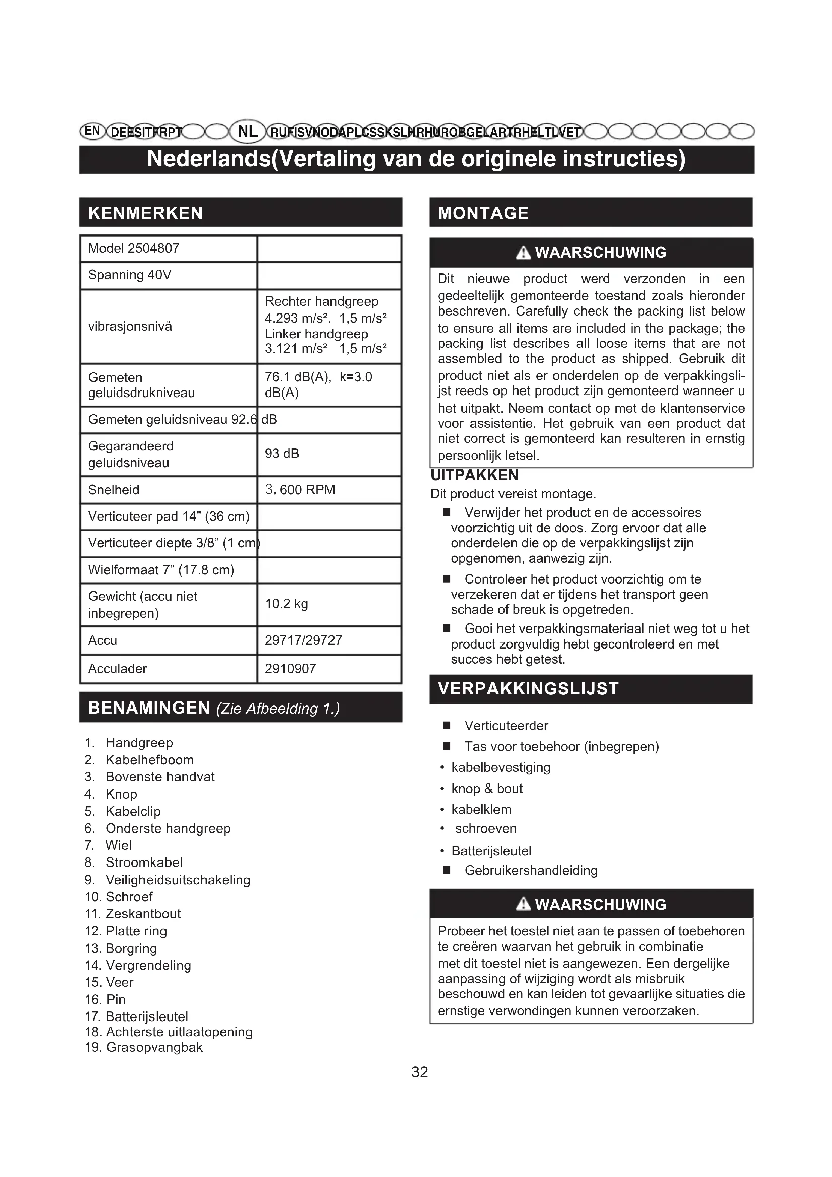 DE ES IT FR PT RU FI SV NO DA PL CS SK SL HR HU RO BG EL AR TR HE LT LV ET MONTAGE WAARSCHUWING Dit nieuwe product werd verzonden in een gedeeltelijk gemonteerde toestand zoals hieronder beschreven. Carefully check the packing list below to ensure all items are included in the package; the packing list describes all loose items that are not assembled to the product as shipped. Gebruik dit product niet als er onderdelen op de verpakkingsli- jst reeds op het product zijn gemonteerd wanneer u het uitpakt. Neem contact op met de klantenservice voor assistentie. Het gebruik van een product dat niet correct is gemonteerd kan resulteren in ernstig persoonlijk letsel. UITPAKKEN Dit product vereist montage. Verwijder het product en de accessoires voorzichtig uit de doos. Zorg ervoor dat alle onderdelen die op de verpakkingslijst zijn opgenomen, aanwezig zijn. Controleer het product voorzichtig om te verzekeren dat er tijdens het transport geen schade of breuk is opgetreden. Gooi het verpakkingsmateriaal niet weg tot u het product zorgvuldig hebt gecontroleerd en met succes hebt getest. VERPAKKINGSLIJST Verticuteerder Tas voor toebehoor (inbegrepen)