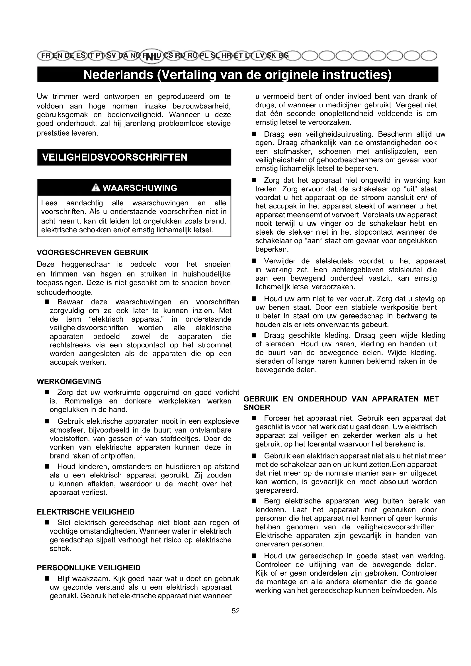 FR EN DE ES IT PT SV DA NO FI HU CS RU RO PL SL HR ET LT LV SK BG Uw trimmer werd ontworpen en geproduceerd om te voldoen aan hoge normen inzake betrouwbaarheid, gebruiksgemak en bedienveiligheid. Wanneer u deze goed onderhoudt, zal hij jarenlang probleemloos stevige prestaties leveren. VEILIGHEIDSVOORSCHRIFTEN WAARSCHUWING Lees aandachtig alle waarschuwingen en alle voorschriften. Als u onderstaande voorschriften niet in acht neemt, kan dit leiden tot ongelukken zoals brand, elektrische schokken en/of ernstig lichamelijk letsel. VOORGESCHREVEN GEBRUIK Deze heggenschaar is bedoeld voor het snoeien en trimmen van hagen en struiken in huishoudelijke toepassingen. Deze is niet geschikt om te snoeien boven schouderhoogte. Bewaar deze waarschuwingen en voorschriften zorgvuldig om ze ook later te kunnen inzien. Met de term “elektrisch apparaat” in onderstaande veiligheidsvoorschriften worden alle elektrische apparaten bedoeld, zowel de apparaten die rechtstreeks via een stopcontact op het stroomnet worden aangesloten als de apparaten die op een accupak werken. WERKOMGEVING Zorg dat uw werkruimte opgeruimd en goed verlicht is. Rommelige en donkere werkplekken werken ongelukken in de hand. Gebruik elektrische apparaten nooit in een explosieve atmosfeer, bijvoorbeeld in de buurt van ontvlambare vloeistoffen, van gassen of van stofdeeltjes. Door de vonken van elektrische apparaten kunnen deze in brand raken of ontploffen. Houd kinderen, omstanders en huisdieren op afstand als u een elektrisch apparaat gebruikt. Zij zouden u kunnen afleiden, waardoor u de macht over het apparaat verliest. ELEKTRISCHE VEILIGHEID Stel elektrisch gereedschap niet bloot aan regen of vochtige omstandigheden. Wanneer water in elektrisch gereedschap sijpelt verhoogt het risico op elektrische schok. PERSOONLIJKE VEILIGHEID Blijf waakzaam. Kijk goed naar wat u doet en gebruik uw gezonde verstand als u een elektrisch apparaat gebruikt. Gebruik het elektrische apparaat niet wanneer u vermoeid bent of onder invloed bent van drank of drugs, of wanneer u medicijnen gebruikt. Vergeet niet dat één seconde onoplettendheid voldoende is om ernstig letsel te veroorzaken. Draag een veiligheidsuitrusting. Bescherm altijd uw ogen. Draag afhankelijk van de omstandigheden ook een stofmasker, schoenen met antislipzolen, een veiligheidshelm of gehoorbeschermers om gevaar voor ernstig lichamelijk letsel te beperken. Zorg dat het apparaat niet ongewild in werking kan treden. Zorg ervoor dat de schakelaar op “uit” staat voordat u het apparaat op de stroom aansluit en/ of het accupak in het apparaat steekt of wanneer u het apparaat meeneemt of vervoert. Verplaats uw apparaat nooit terwijl u uw vinger op de schakelaar hebt en steek de stekker niet in het stopcontact wanneer de schakelaar op “aan” staat om gevaar voor ongelukken beperken. Verwijder de stelsleutels voordat u het apparaat in werking zet. Een achtergebleven stelsleutel die aan een bewegend onderdeel vastzit, kan ernstig lichamelijk letsel veroorzaken. Houd uw arm niet te ver vooruit. Zorg dat u stevig op uw benen staat. Door een stabiele werkpositie bent u beter in staat om uw gereedschap in bedwang te houden als er iets onverwachts gebeurt. Draag geschikte kleding. Draag geen wijde kleding of sieraden. Houd uw haren, kleding en handen uit de buurt van de bewegende delen. Wijde kleding, sieraden of lange haren kunnen beklemd raken in de bewegende delen.