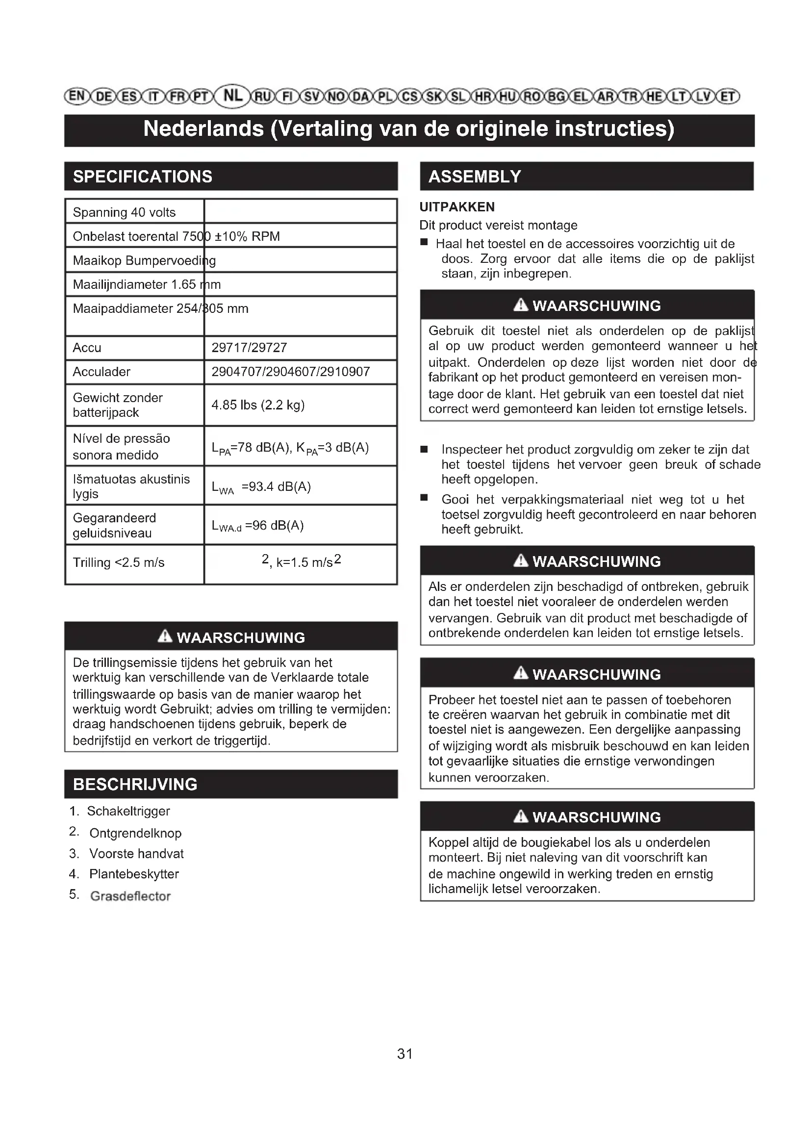 EREN Zie afbeelding 8. ■ Verwijder de accu. ■ Duw de vastzetknop (1) in en houd het in deze positie. ■ Draai de bedieningshendel (2) 90° totdat deze vast komt te zitten. ■ Laat de vastzetknop (1) los. WAARSCHUWING Gebruik bij vervanging van onderdelen uitsluitend originele delen. Het gebruik van andere onderdelen kan gevaar opleveren of het product beschadigen. WAARSCHUWING Om ernstige letsels te vermijden, verwijdert u het accupack altijd van het werktuig wanneer u het reinigt of onderhoudswerken uitvoert. ALGEMEN ONDERHOUD Voor elk gebruik, inspecteert u het hele product om be- schadigde, ontbrekende of losse onderdelen, zoals schro- even, moeren, bouten, doppen, etc. Maak alle binders en doppen stevig vast en gebruik het product niet tot alle ont- brekende of beschadigde onderdelen vervangen zijn. Vermijd het gebruik van oplosmiddelen wanneer u kunst- stof onderdelen reinigt. De meeste kunststoffen zijn ge- voelig voor schade door verschillende types commerciële oplosmiddelen en kunnen worden beschadigd door het gebruik ervan. Gebruik een schone doek om vuil, stof, olie, vet, etc. te verwijderen . WAARSCHUWING 33Nederlands (Vertaling van de originele instructies) Laat nooit remvloeistoffen, benzine, producten op petroleumbasis, bijtende oliën in contact komen met kunststof onderdelen. De chemicaliën kunnen het kunststof beschadigen, verzwakken of vernietigen, wat kan leiden tot ernstige letsels. Enkel de onderdelen die op de onderdelenlijst voorkomen zijn bedoeld om te worden hersteld of vervangen door de klant. Alle andere onderdelen moeten worden vervangen door een Geautoriseerd Onderhoudscentrum. WARNING Om ernstige letsels te vermijden, verwijdert u het accupack altijd van het werktuig wanneer u het reinigt of onderhoudswerken uitvoert. SPOELVERVANGING Zie afbeelding 9. Gebruik uitsluitend een twist monofilament maailijn met een diameter van 2mm. Verwijder het accupak. Druk de knipsluitingen aan het deksel van de spoelhouder in. Trek de spoelhouder omhoog om te verwijderen. Verwijder de oude spoel. Om de nieuwe spoel te installeren, zorgt u ervoor dat de lijn in de gleuf op de nieuwe spoel is vastgemaakt. Zorg ervoor dat het einde van de lijn ongeveer 15 cm. van de gleuf is uitgetrokken. Installeer de nieuwe spoel zodat de lijn en de gleuf met het oog in de lijnkop zijn afgelijnd. Draad de lijn in het oog. Trek aan de lijn die uit de lijnkop steekt zodat de lijn van de gleuf in de spoel loskomt. Herbevestig de spoelhouder door de knipsluitingen in te drukken en ze in de gleuven te steken en naar beneden te drukken tot de spoelhouder op zijn plaats klikt . LIJN VERVANGEN Zie afbeelding 10. Verwijder de spoel van de lijnkop. Opmerking: Verwijder oude lijn die op de spoel achterblijft. Knip twee lijnen, elk ongeveer 10 ft. (3 m) lang. Breng een lijn in het gat in het bovenste deel van de spoel, terwijl de andere lijn in het gat in het onderste deel van de spoel gaat. Wind de lijnen rond de spoel in de richting van de wijzers van de klok, zoals aangeduid door de pijlen op de spoel. Breng de draden aan in de geleidegleuven. Installeer de beschermkap op de spoel. Zorg dat het uiteinde van de snijdraad uit de sleuven van de beschermkap steekt. Plaats de veer in de trimmerkop met het smalle uiteinde omhoog gericht. Plaats de spoel in de trimmerkop. Stop de uiteinden van de draden door de gaten op de zijkant van de trimmerkop. Breng de beschermkap opnieuw aan op de trimmerkop. Duw totdat de beschermkap vast komt te zitten. TRIMMER OPBERGEN Verwijder, voordat u de bosmaaier opbergt, de batterijeenheid. Berg de unit buiten bereik van kinderen op. Berg hem niet op in de nabijheid van bijtende stoffen zoals chemische tuinproducten of strooizout. Berg de batterij op een koele plaats op en laad hem op. Temperaturen die hoger of lager dan de normale omgevingstemperatuur zijn, verkorten de levensduur van de batterij. Berg de accu-eenheid op in een ruimte waar de temperatuur lager is dan 27°C, en waar het niet vochtig is. Na verloop van tijd lopen batterijen leeg. Hoe hoger de temperatuur, hoe sneller de batterij leegloopt. Als het apparaat voor lange tijd niet wordt gebruikt, dient u de batterij iedere maand of om de twee maanden op te laden. Hierdoor verlengt u de levensduur van de batterij. Zet de bosmaaier gedurende het transport vast, om schade of letsel te voorkomen. Voordat u het apparaat opbergt, dient u het schoon te maken en onderhoud uit te voeren. Gebruik geschikte beschermingsmiddelen voor snij-accessoires met metalen snijbladen. Gebruik tijdens transport en opslag een geschikte afdekking voor metalen snijbladen. MILIEUBESCHERMING aspect vormen voor het gebruik van de machine, ten gunste van de civiele samenleving en de omgeving waarin we leven. Wees geen storend element voor uw buren. Volg nauwgezet de plaatselijke normen voor het verwerken van de verpakking, olie, benzine, filters, versleten delen of eender welk element met een sterke invloed op de omgeving; dit afval mag niet met de huisafval weggeworpen worden, maar moet gescheiden worden en aan speciale verzamelcentra toevertrouwd worden, die de recyclage van de materialen zullen verzorgen. Volg nauwkeurig de lokale normen op voor de afdanking van het snijafval. 34Nederlands (Vertaling van de originele instructies) PROBLEMEN OPLOSSEN