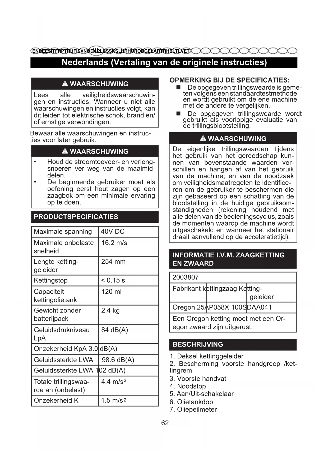 Zie afbeelding 12 - 15 Het is belangrijk dat u stevig staat en uw lichaamsgewicht gelijkmatig over beide voeten verdeelt.Haal indien mogelijk de stam van de grond af en ondersteun deze met takken, stammen of spieën. Volg deze eenvoudige richtlijnen om ge- mak-kelijk te kunnen zagen: Als de boomstam over de gehele lengte wordt ondersteund, zaagt u vanaf de bovenkant. Als de boomstam aan één kant wordt ondersteund,zaag dan 1/3 van de boomdiameter van onderaf.Maak dan een laatste inkeping door van bovenaf te zagen tot in de eerste inkeping. Als de boomstam aan twee kanten wordt ondersteund, zaagt u 1/3 van de boomdiameter van bovenaf en zaagt u tot slot het laatste 2/3 van onderaf tot in de eerste inkeping. Ga bij zaagwerkzaamheden op een helling altijd hoger dan de boomstam staan. Verminder de aandrukkracht wanneer de stam bijna is doorgezaagd en blijf de handgrepen van de kettingzaag stevig vasthouden om volledige controle te behouden. Laat de ketting de grond niet raken. Nadat u het zagen heeft voltooid, wacht u tot de zaagketting tot stilstand is gekomen voor u de kettingzaag beweegt. Schakel de motor altijd uit voordat u naar een andere boom gaat. ONDERHOUD WAARSCHUWING Verwijder het accupack altijd uit de machine voor u de kettingspanning controleert of de ketting afstelt. Draag beschermhandschoe-nen terwijl u de ketting, het zwaard of plaa sen rond de ketting aanraakt. KETTINGSPANNING AFSTELLEN Zie afbeelding 2-7 Maak de aanspanmoeren van het kettingdeksel met de meegeleverde sleutel los. De aanspanmoeren van het kettingdeksel moeten niet volledig worden verwijderd om de kettingspanning af te stellen.Nederlands (Vertaling van de originele instructies)
