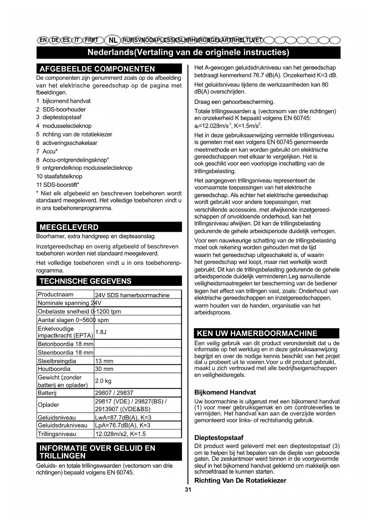 FR PT RU FI SV NO DA PL CS SK SL HR HU RO BG EL AR TR HE LT LV ET AFGEBEELDE COMPONENTEN De componenten zijn genummerd zoals op de afbeelding van het elektrische gereedschap op de pagina met fbeeldingen. 1 bijkomend handvat 2 SDS-boorhouder 3 dieptestopstaaf 4 modusselectieknop 5 richting van de rotatiekiezer 6 activeringsschakelaar 7 Accu* 8 Accu-ontgrendelingsknop* 9 ontgrendelknop modusselectieknop 10 staafafstelknop 11 SDS-boorstift*
