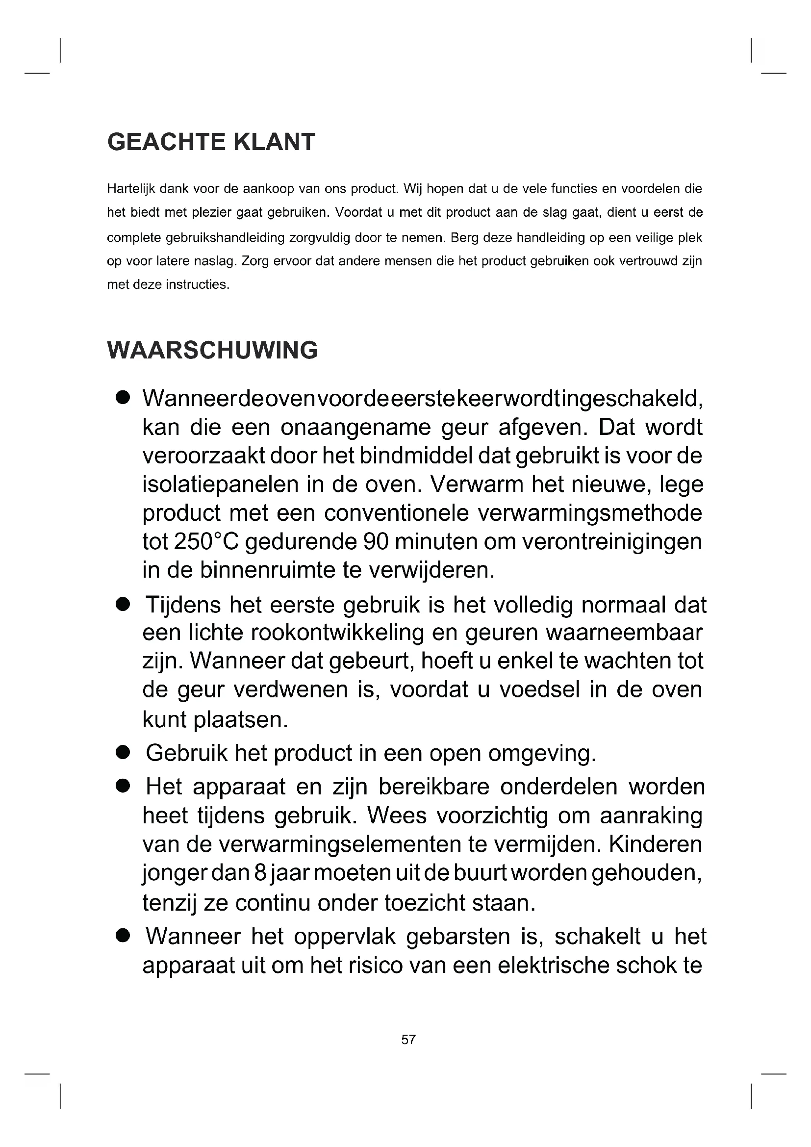 Wanneer de oven voor de eerste keer wordt ingeschakeld, kan die een onaangename geur afgeven. Dat wordt veroorzaakt door het bindmiddel dat gebruikt is voor de isolatiepanelen in de oven. Verwarm het nieuwe, lege product met een conventionele verwarmingsmethode tot 250°C gedurende 90 minuten om verontreinigingen in de binnenruimte te verwijderen. Tijdens het eerste gebruik is het volledig normaal dat een lichte rookontwikkeling en geuren waarneembaar zijn. Wanneer dat gebeurt, hoeft u enkel te wachten tot de geur verdwenen is, voordat u voedsel in de oven kunt plaatsen. Gebruik het product in een open omgeving. Het apparaat en zijn bereikbare onderdelen worden heet tijdens gebruik. Wees voorzichtig om aanraking van de verwarmingselementen te vermijden. Kinderen jonger dan 8 jaar moeten uit de buurt worden gehouden, tenzij ze continu onder toezicht staan. Wanneer het oppervlak gebarsten is, schakelt u het apparaat uit om het risico van een elektrische schok te58 voorkomen. Dit apparaat kan worden gebruikt door kinderen van 8 jaar en ouder en personen met verminderde lichamelijke, sensorische of mentale vaardigheden of gebrek aan ervaring en kennis wanneer ze onder toezicht staan of geïnstrueerd zijn over het veilige gebruik van het apparaat en de gevaren die hieraan verbonden zijn. Kinderen mogen niet met het apparaat spelen. Zonder toezicht mogen kinderen het apparaat niet reinigen of normaal onderhoud uitvoeren. Tijdens het gebruik kan het apparaat zeer heet worden. Wees voorzichtig om aanraking van de verwarmingselementen in de oven te vermijden. Laat kinderen nooit in de buurt van de oven, wanneer die in gebruik is, met name wanneer de grill wordt gebruikt. Zorg ervoor dat het apparaat uitgeschakeld is voordat u de ovenlamp vervangt om de kans op een elektrische schok te vermijden. De onderbreking moet in de vaste stroomkring worden ingebouwd conform de aansluitspecicaties. Kinderen moeten onder toezicht staan, zodat ze niet met het apparaat gaan spelen. Dit apparaat is niet bedoeld voor gebruik door personen (waaronder kinderen) met verminderde lichamelijke, sensorische of mentale vaardigheden, of gebrek aan ervaring en kennis, tenzij ze onder toezicht staan of geïnstrueerd zijn over het gebruik van het apparaat59 door een persoon die verantwoordelijk is voor hun veiligheid. Toegankelijke onderdelen kunnen heet worden tijdens het gebruik. Houd jonge kinderen uit de buurt. Een alpolige schakelaar moet in de vaste stroomkring worden ingebouwd conform de installatievoorschriften. Wanneer het netsnoer beschadigd is, moet het door de fabrikant, zijn onderhoudscentrum of personen met overeenkomstige kwalicaties worden vervangen, om gevaren te voorkomen. Gebruik geen scherpe, schurende reinigers of scherpe metalen schrapers om de deurruit van de oven te reinigen. Deze kunnen het oppervlak be schadigen waardoor het glas kan breken.