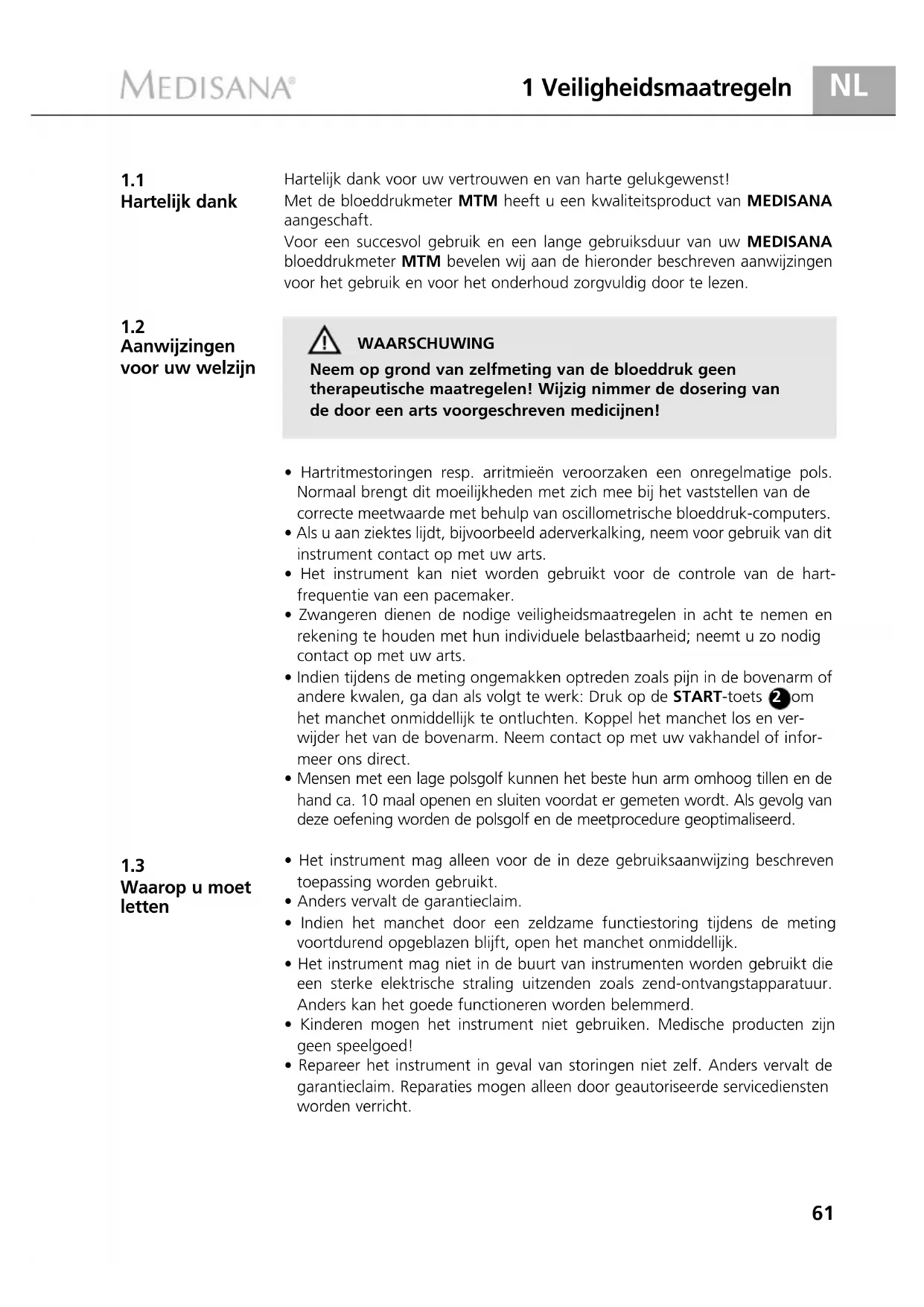 Voor een succesvol gebruik en een lange gebruiksduur van uw MEDISANA bloeddrukmeter MTM bevelen wij aan de hieronder beschreven aanwijzingen voor het gebruik en voor het onderhoud zorgvuldig door te lezen.