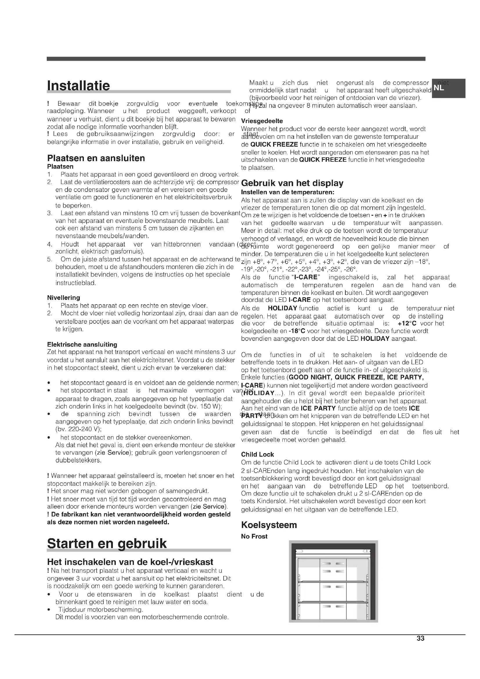 - Tijdsduurmotorbescherming. Ditmodelisvoorzienvaneenmotorbeschermendecontrole. Maaktu zichdus niet ongerustals decompressor niet onmiddellijkstartnadat u hetapparaatheeftuitgeschakeld (bijvoorbeeldvoorhetreinigenofontdooienvandevriezer). Hijzalnaongeveer8minutenautomatischweeraanslaan. Vriesgedeelte Wanneerhetproductvoordeeerstekeeraangezetwordt,wordt aanbevolenomnahetinstellenvandegewenstetemperatuur deQUICK FREEZEfunctieinteschakelenomhetvriesgedeelte snellertekoelen.Hetwordtaangeradenometenswarenpasnahet uitschakelenvandeQUICK FREEZEfunctieinhetvriesgedeelte teplaatsen. Gebruik van het display Instellen van de temperaturen: Alshetapparaataaniszullendedisplayvandekoelkastende vriezerdetemperaturentonendieopdatmomentzijningesteld. Omzetewijzigenishetvoldoendedetoetsen- en+ intedrukken vanhet gedeeltewaarvan ude temperatuurwilt aanpassen. Meerindetail:metelkedrukopdetoetsenwordtdetemperatuur verhoogdofverlaagd,enwordtdehoeveelheidkoudediebinnen deruimte wordtgegenereerd op eengelijke maniermeer of minder.Detemperaturendieuinhetkoelgedeeltekuntselecteren zijn+8°,+7°,+6°,+5°,+4°,+3°,+2°,dievandevriezerzijn–18°, -19°,-20°,-21°,-22°,-23°,-24°,-25°,-26°. Alsde functie“I-CARE” ingeschakeldis, zal het apparaat automatisch de temperaturen regelen aande handvan de temperaturenbinnendekoelkastenbuiten.Ditwordtaangegeven doordatdeLEDI-CARE ophettoetsenbordaangaat. Alsde HOLIDAY functie actiefis kunt u de temperatuurniet regelen.Het apparaatgaat automatischover op deinstelling dievoor debetreffende situatieoptimaal is: +12°C voorhet koelgedeelteen-18°C voorhetvriesgedeelte.Dezefunctiewordt bovendienaangegevendoordatdeLEDHOLIDAY aangaat. Omde functiesin ofuit teschakelen ishet voldoendede betreffendetoetsintedrukken.Hetaan-ofuitgaanvandeLED ophettoetsenbordgeeftaanofdefunctiein-ofuitgeschakeldis. Enkelefuncties(GOOD NIGHT, QUICK FREEZE, ICE PARTY, I-CARE)kunnenniettegelijkertijdmetanderewordengeactiveerd (HOLIDAY...). In dit gevalwordt eenbepaalde prioriteit aangehoudendieuhelptbijhetbeterbeherenvanhetapparaat. AanheteindvandeICE PARTY functiealtijdopdetoetsICE PARTY drukkenomhetknipperenvandebetreffendeLEDenhet geluidssignaaltestoppen.Hetknipperenenhetgeluidssignaal gevenaan datde functie isbeëindigd endat de flesuit het vriesgedeeltemoetwordengehaald. Child Lock OmdefunctieChildLockteactiverendientudetoetsChildLock 2sI-CAREndenlangingedrukthouden.Hetinschakelenvande toetsenblokkeringwordtbevestigddoorenkortgeluidssignaal enhet aangaanvan de betreffendeLED ophet toetsenbord. Omdezefunctieuitteschakelendruktu2sI-CAREndenopde toetsKinderslot.Hetuitschakelenwordtbevestigddooreenkort geluidssignaalenhetuitgaanvandebetreffendeLED. Koelsysteem No Frost34