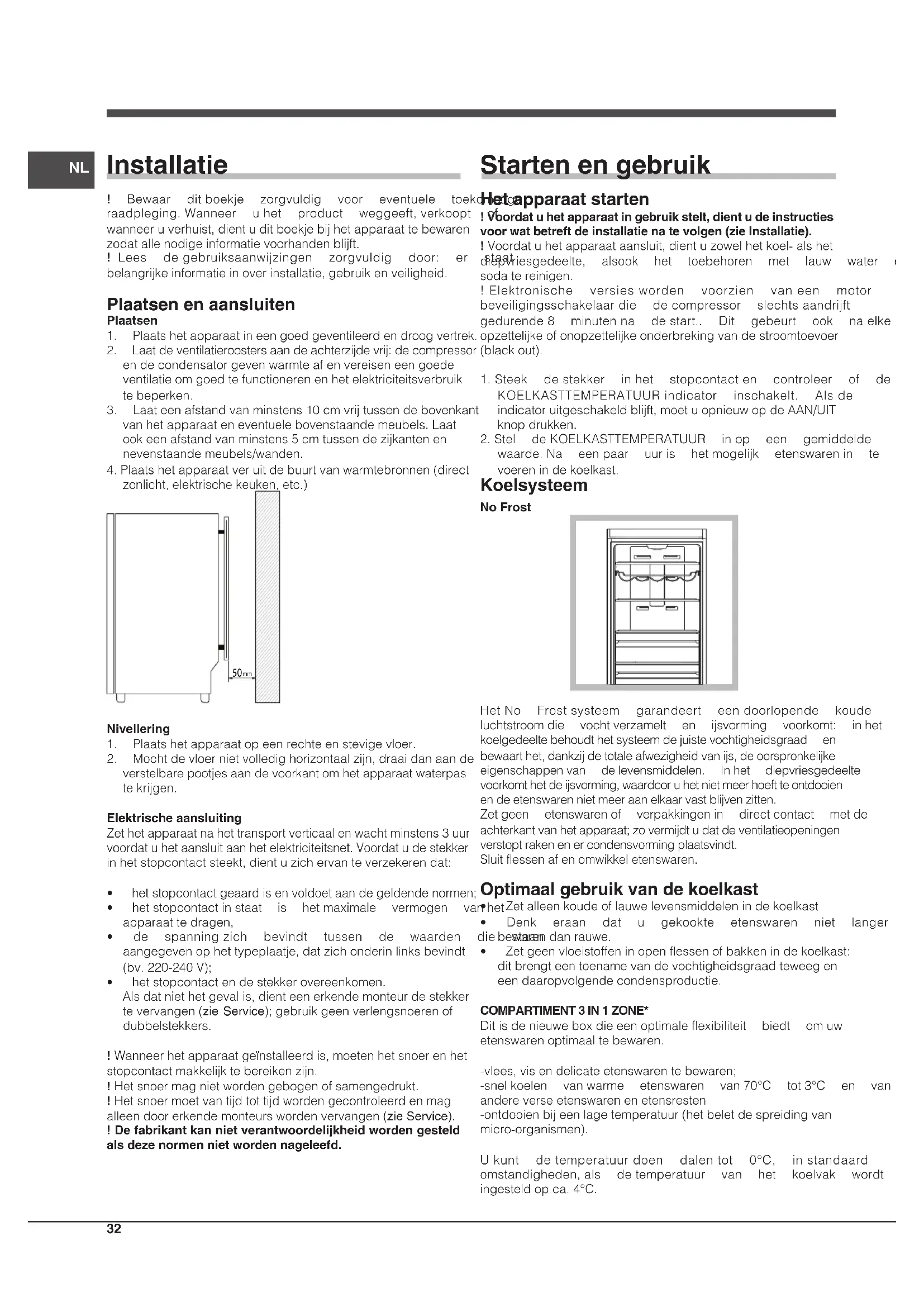 Installatie ! Bewaar ditboekje zorgvuldig voor eventuele toekomstige raadpleging.Wanneer uhet product weggeeft,verkoopt of wanneeruverhuist,dientuditboekjebijhetapparaattebewaren zodatallenodigeinformatievoorhandenblijft. ! Lees degebruiksaanwijzingen zorgvuldig door: er staat belangrijkeinformatieinoverinstallatie,gebruikenveiligheid. Plaatsen en aansluiten Plaatsen
