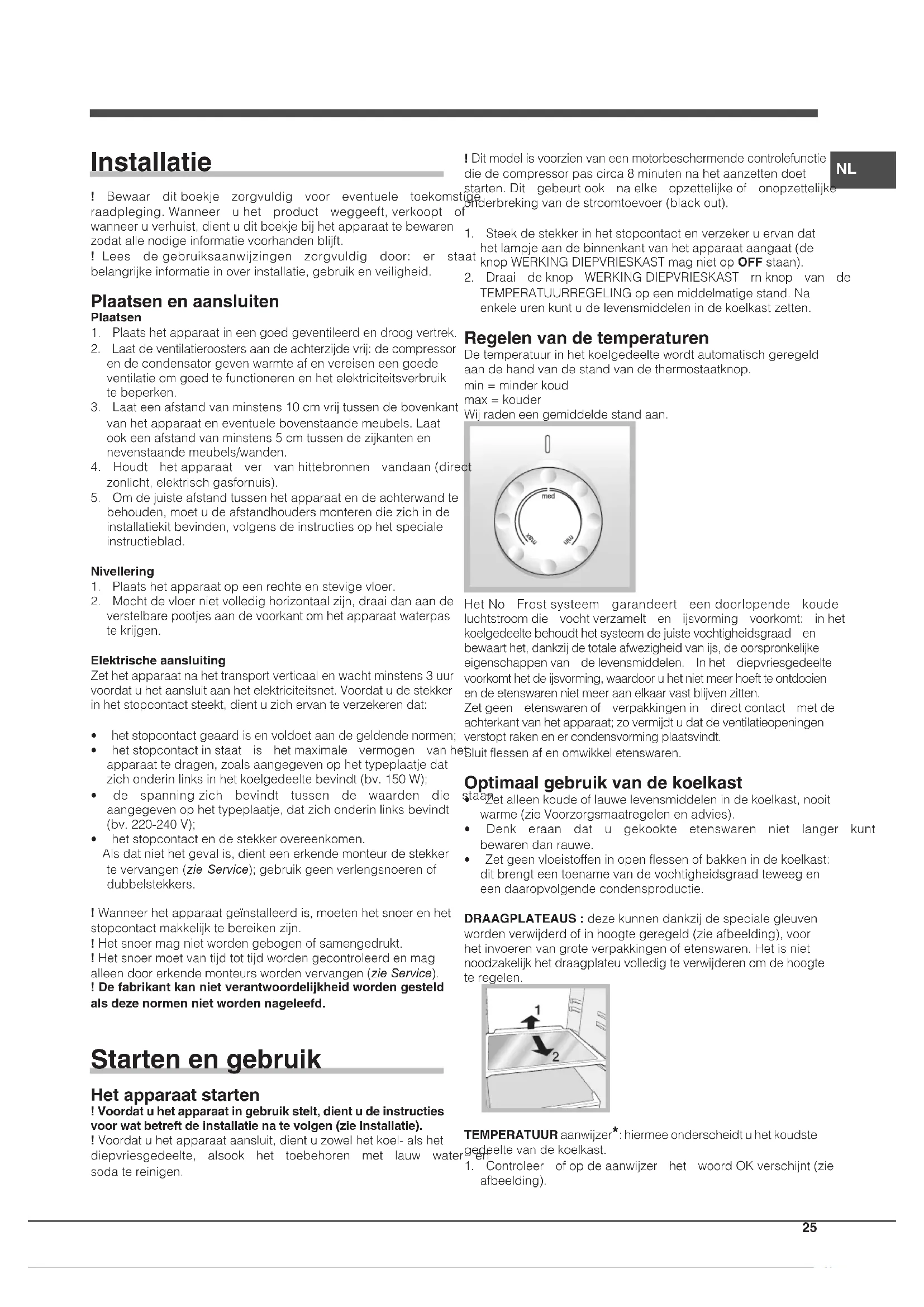 - hetstopcontactendestekkerovereenkomen. Alsdatniethetgevalis,dienteenerkendemonteurdestekker tevervangen(zie Service);gebruikgeenverlengsnoerenof dubbelstekkers. !Wanneerhetapparaatgeïnstalleerdis,moetenhetsnoerenhet stopcontactmakkelijktebereikenzijn. !Hetsnoermagnietwordengebogenofsamengedrukt. !Hetsnoermoetvantijdtottijdwordengecontroleerdenmag alleendoorerkendemonteurswordenvervangen(zie Service). ! De fabrikant kan niet verantwoordelijkheid worden gesteld als deze normen niet worden nageleefd. Starten en gebruik Het apparaat starten ! Voordat u het apparaat in gebruik stelt, dient u de instructies voor wat betreft de installatie na te volgen (zie Installatie). !Voordatuhetapparaataansluit,dientuzowelhetkoel-alshet diepvriesgedeelte, alsook het toebehoren met lauw water en sodatereinigen. !Ditmodelisvoorzienvaneenmotorbeschermendecontrolefunctie diedecompressorpascirca8minutennahetaanzettendoet starten.Dit gebeurtook naelke opzettelijkeof onopzettelijke onderbrekingvandestroomtoevoer(blackout).