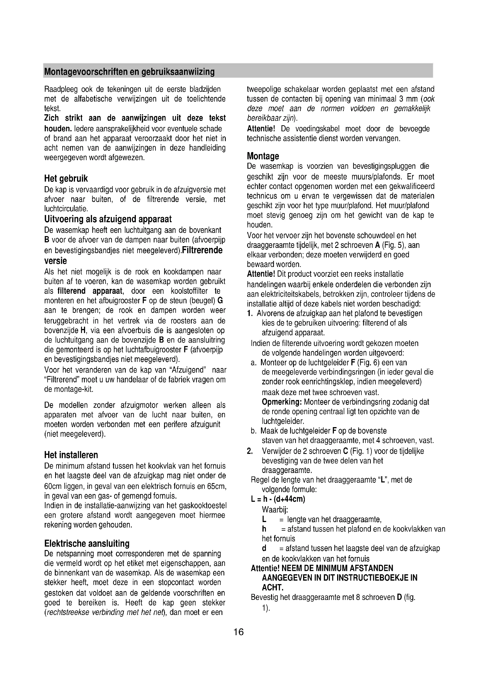 Dans l’éventualité où l’éclairage ne devait pas fonctionner, vérifier si les lampes ont été introduites correctement dans15 leur logement, avant de contacter le service après-vente. Attention Ne jamais utiliser la hotte sans que la grille soit correctement montée. La pièce doit disposer d’une ventilation suffisante dans le cas où vous utilisez simultanément la hotte et des appareils à gaz ou alimentés par d’autres combustibles. L’air aspiré ne doit pas être dirigé dans un conduit utilisé pour l’évacuation de fumées produites par d’autres appareils à gaz ou alimentés par d’autres combustibles. Il est sévèrement interdit de cuisiner des aliments à la flamme sous la hotte. Il faut absolument éviter l’emploi de la flamme libre, celle- ci étant nuisible pour les filtres et pouvant provoquer des incendies. La friture doit être faite sous contrôle pour éviter que l’huile surchauffée ne prenne feu. Pour ce qui concerne les mesures techniques et de sécurité qu’il faut adopter pour l’évacuation des fumées, veuillez vous référer aux dispositions prévues par les règlements des autorités locales compétentes. La hotte doit être nettoyée fréquemment à l’intérieur comme à l’extérieur. L’inobservance des normes de nettoyage de la hotte, de la substitution et du nettoyage des filtres comporte des risques d’incendie. Toute responsabilité est déclinée pour les éventuels inconvénients, dégâts ou incendies provoqués à l’appareils par l’inobservance des instructions reportées dans ce manuel. Cet appareil porte le symbole du recyclage conformément à la Directive Européenne 2002/96/CE concernant les Déchets d’Équipements Électriques et Électroniques (DEEE ou WEEE). En procédant correctement à la mise au rebut de cet appareil, vous contribuerez à empêcher toute conséquence nuisible pour l’environnement et la santé de l’homme. Le symbole présent sur l’appareil ou sur la documentation qui l’accompagne indique que ce produit ne peut en aucun cas être traité comme déchet ménager. Il doit par conséquent être remis à un centre de collecte des déchets chargé du recyclage des équipements électriques et électroniques. Pour la mise au rebut, respectez les normes relatives à l’élimination des déchets en vigueur dans le pays d’installation. Pour obtenir de plus amples détails au sujet du traitement, de la récupération et du recyclage de cet appareil, veuillez vous adresser au bureau compétent de votre commune, à la société de collecte des déchets ou directement à votre revendeur.16 Montagevoorschriften en gebruiksaanwiizing Raadpleeg ook de tekeningen uit de eerste bladzijden met de alfabetische verwijzingen uit de toelichtende tekst. Zich strikt aan de aanwijzingen uit deze tekst houden. Iedere aansprakelijkheid voor eventuele schade of brand aan het apparaat veroorzaakt door het niet in acht nemen van de aanwijzingen in deze handleiding weergegeven wordt afgewezen. Het gebruik De kap is vervaardigd voor gebruik in de afzuigversie met afvoer naar buiten, of de filtrerende versie, met luchtcirculatie. Uitvoering als afzuigend apparaat De wasemkap heeft een luchtuitgang aan de bovenkant B voor de afvoer van de dampen naar buiten (afvoerpijp en bevestigingsbandjes niet meegeleverd). Filtrerende versie Als het niet mogelijk is de rook en kookdampen naar buiten af te voeren, kan de wasemkap worden gebruikt als filterend apparaat, door een koolstoffilter te monteren en het afbuigrooster F op de steun (beugel) G aan te brengen; de rook en dampen worden weer teruggebracht in het vertrek via de roosters aan de bovenzijde H, via een afvoerbuis die is aangesloten op de luchtuitgang aan de bovenzijde B en de aansluitring die gemonteerd is op het luchtafbuigrooster F (afvoerpijp en bevestigingsbandjes niet meegeleverd). Voor het veranderen van de kap van “Afzuigend” naar “Filtrerend” moet u uw handelaar of de fabriek vragen om de montage-kit. De modellen zonder afzuigmotor werken alleen als apparaten met afvoer van de lucht naar buiten, en moeten worden verbonden met een perifere afzuigunit (niet meegeleverd). Het installeren De minimum afstand tussen het kookvlak van het fornuis en het laagste deel van de afzuigkap mag niet onder de 60cm liggen, in geval van een elektrisch fornuis en 65cm, in geval van een gas- of gemengd fornuis. Indien in de installatie-aanwijzing van het gaskooktoestel een grotere afstand wordt aangegeven moet hiermee rekening worden gehouden. Elektrische aansluiting De netspanning moet corresponderen met de spanning die vermeld wordt op het etiket met eigenschappen, aan de binnenkant van de wasemkap. Als de wasemkap een stekker heeft, moet deze in een stopcontact worden gestoken dat voldoet aan de geldende voorschriften en goed te bereiken is. Heeft de kap geen stekker (rechtstreekse verbinding met het net), dan moet er een tweepolige schakelaar worden geplaatst met een afstand tussen de contacten bij opening van minimaal 3 mm (ook deze moet aan de normen voldoen en gemakkelijk bereikbaar zijn). Attentie! De voedingskabel moet door de bevoegde technische assistentie dienst worden vervangen. Montage De wasemkap is voorzien van bevestigingspluggen die geschikt zijn voor de meeste muurs/plafonds. Er moet echter contact opgenomen worden met een gekwalificeerd technicus om u ervan te vergewissen dat de materialen geschikt zijn voor het type muur/plafond. Het muur/plafond moet stevig genoeg zijn om het gewicht van de kap te houden. Voor het vervoer zijn het bovenste schouwdeel en het draaggeraamte tijdelijk, met 2 schroeven A (Fig. 5), aan elkaar verbonden; deze moeten verwijderd en goed bewaard worden. Attentie! Dit product voorziet een reeks installatie handelingen waarbij enkele onderdelen die verbonden zijn aan elektriciteitskabels, betrokken zijn, controleer tijdens de installatie altijd of deze kabels niet worden beschadigd: