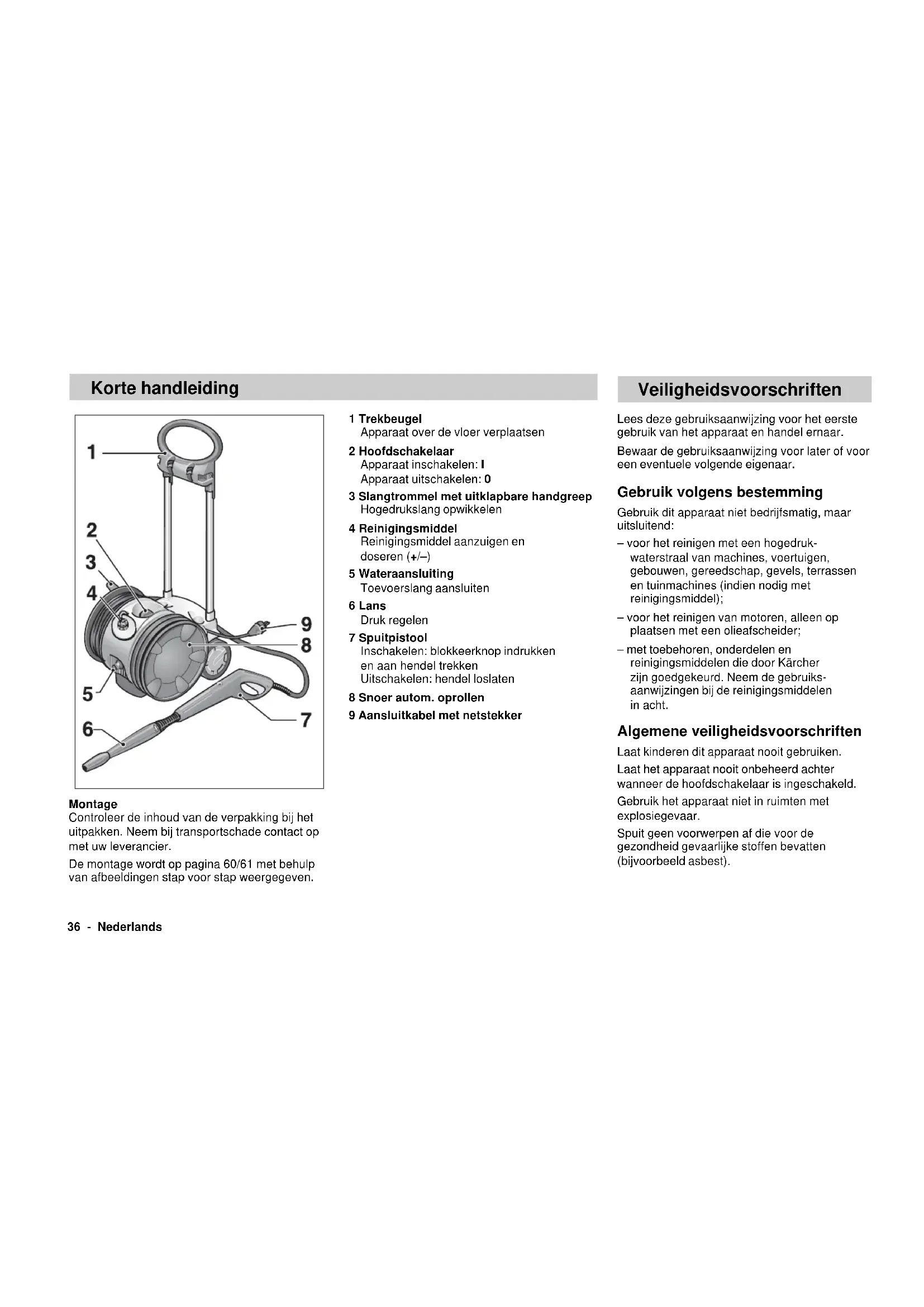 Procedura di valutazione della conformità seguita: Appendice V Livello di potenza sonora misurato: 91 dB(A) garantita: 93 dB(A) Mediante accorgimenti interni, è stato assicurato che gli apparecchi di serie siano sempre conformi ai requisiti delle attuali direttive CE e alle norme applicate.I firmatari agis- cono su incarico e con i poteri dell’Amministrazione. 5.957-566 (04/03)36 - Nederlands Korte handleiding 1 Trekbeugel Apparaat over de vloer verplaatsen 2 Hoofdschakelaar Apparaat inschakelen: I Apparaat uitschakelen: 0 3 Slangtrommel met uitklapbare handgreep Hogedrukslang opwikkelen 4 Reinigingsmiddel Reinigingsmiddel aanzuigen en doseren (+/–) 5 Wateraansluiting Toevoerslang aansluiten 6 Lans Druk regelen 7 Spuitpistool Inschakelen: blokkeerknop indrukken en aan hendel trekken Uitschakelen: hendel loslaten 8 Snoer autom. oprollen 9 Aansluitkabel met netstekker Veiligheidsvoorschriften Lees deze gebruiksaanwijzing voor het eerste gebruik van het apparaat en handel ernaar. Bewaar de gebruiksaanwijzing voor later of voor een eventuele volgende eigenaar. Gebruik volgens bestemming Gebruik dit apparaat niet bedrijfsmatig, maar uitsluitend: – voor het reinigen met een hogedruk- waterstraal van machines, voertuigen, gebouwen, gereedschap, gevels, terrassen en tuinmachines (indien nodig met reinigingsmiddel); – voor het reinigen van motoren, alleen op plaatsen met een olieafscheider; – met toebehoren, onderdelen en reinigingsmiddelen die door Kärcher zijn goedgekeurd. Neem de gebruiks- aanwijzingen bij de reinigingsmiddelen in acht. Algemene veiligheidsvoorschriften Laat kinderen dit apparaat nooit gebruiken. Laat het apparaat nooit onbeheerd achter wanneer de hoofdschakelaar is ingeschakeld. Gebruik het apparaat niet in ruimten met explosiegevaar. Spuit geen voorwerpen af die voor de gezondheid gevaarlijke stoffen bevatten (bijvoorbeeld asbest). Montage Controleer de inhoud van de verpakking bij het uitpakken. Neem bij transportschade contact op met uw leverancier. De montage wordt op pagina 60/61 met behulp van afbeeldingen stap voor stap weergegeven.Nederlands - 37