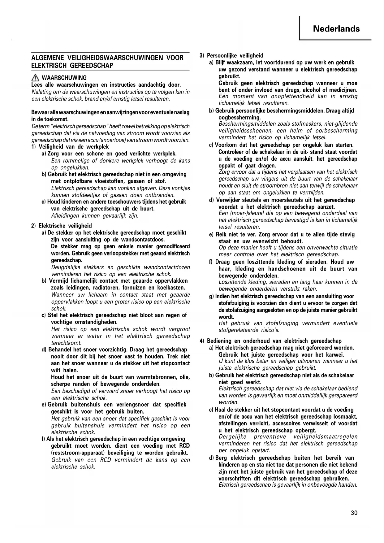 ELEKTRISCH GEREEDSCHAP WAARSCHUWING Lees alle waarschuwingen en instructies aandachtig door. Nalating om de waarschuwingen en instructies op te volgen kan in een elektrische schok, brand en/of ernstig letsel resulteren. Bewaar alle waarschuwingen en aanwijzingen voor eventuele naslag in de toekomst. De term “elektrisch gereedschap” heeft zowel betrekking op elektrisch gereedschap dat via de netvoeding van stroom wordt voorzien als gereedschap dat via een accu (snoerloos) van stroom wordt voorzien.