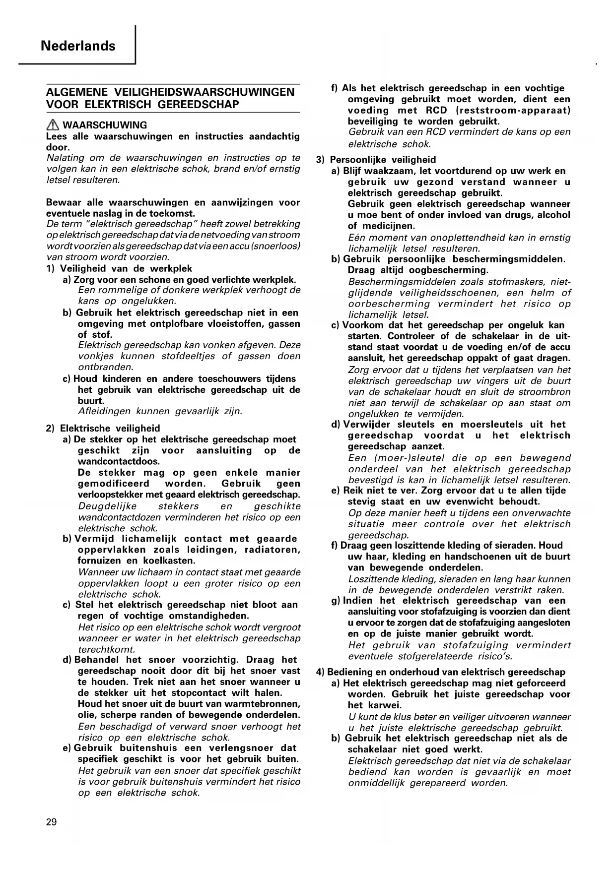 a) Blijf waakzaam, let voortdurend op uw werk en gebruik uw gezond verstand wanneer u elektrisch gereedschap gebruikt. Gebruik geen elektrisch gereedschap wanneer u moe bent of onder invloed van drugs, alcohol of medicijnen. Eén moment van onoplettendheid kan in ernstig lichamelijk letsel resulteren. b) Gebruik persoonlijke beschermingsmiddelen. Draag altijd oogbescherming. Beschermingsmiddelen zoals stofmaskers, niet- glijdende veiligheidsschoenen, een helm of oorbescherming vermindert het risico op lichamelijk letsel. c) Voorkom dat het gereedschap per ongeluk kan starten. Controleer of de schakelaar in de uit- stand staat voordat u de voeding en/of de accu aansluit, het gereedschap oppakt of gaat dragen. Zorg ervoor dat u tijdens het verplaatsen van het elektrisch gereedschap uw vingers uit de buurt van de schakelaar houdt en sluit de stroombron niet aan terwijl de schakelaar op aan staat om ongelukken te vermijden. d) Verwijder sleutels en moersleutels uit het gereedschap voordat u het elektrisch gereedschap aanzet. Een (moer-)sleutel die op een bewegend onderdeel van het elektrisch gereedschap bevestigd is kan in lichamelijk letsel resulteren. e) Reik niet te ver. Zorg ervoor dat u te allen tijde stevig staat en uw evenwicht behoudt. Op deze manier heeft u tijdens een onverwachte situatie meer controle over het elektrisch gereedschap. f) Draag geen loszittende kleding of sieraden. Houd uw haar, kleding en handschoenen uit de buurt van bewegende onderdelen. Loszittende kleding, sieraden en lang haar kunnen in de bewegende onderdelen verstrikt raken. g) Indien het elektrisch gereedschap van een aansluiting voor stofafzuiging is voorzien dan dient u ervoor te zorgen dat de stofafzuiging aangesloten en op de juiste manier gebruikt wordt. Het gebruik van stofafzuiging vermindert eventuele stofgerelateerde risico’s.