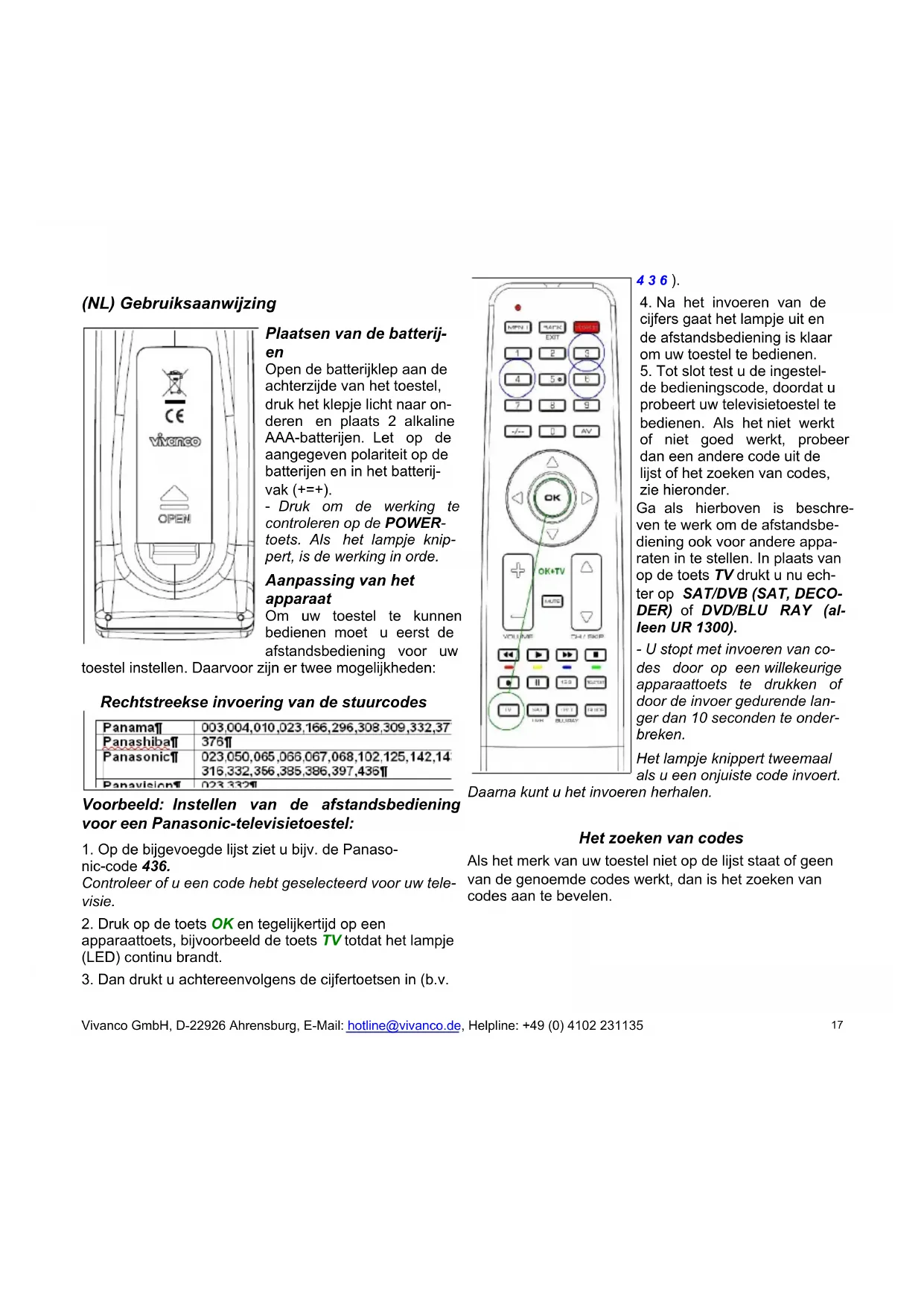 de bedieningscode, doordat u probeert uw televisietoestel te bedienen. Als het niet werkt of niet goed werkt, probeer dan een andere code uit de lijst of het zoeken van codes, zie hieronder. Ga als hierboven is beschre- ven te werk om de afstandsbe- diening ook voor andere appa- raten in te stellen. In plaats van op de toets TV drukt u nu ech- ter op SAT/DVB (SAT, DECO- DER) of DVD/BLU RAY (al- leen UR 1300). - U stopt met invoeren van co- des door op een willekeurige apparaattoets te drukken of door de invoer gedurende lan- ger dan 10 seconden te onder- breken. Het lampje knippert tweemaal als u een onjuiste code invoert. Daarna kunt u het invoeren herhalen. Het zoeken van codes Als het merk van uw toestel niet op de lijst staat of geen van de genoemde codes werkt, dan is het zoeken van codes aan te bevelen. Vivanco GmbH, D-22926 Ahrensburg, E-Mail: hotline@vivanco.de, Helpline: +49 (0) 4102 231135 17Handmatig zoeken van codes