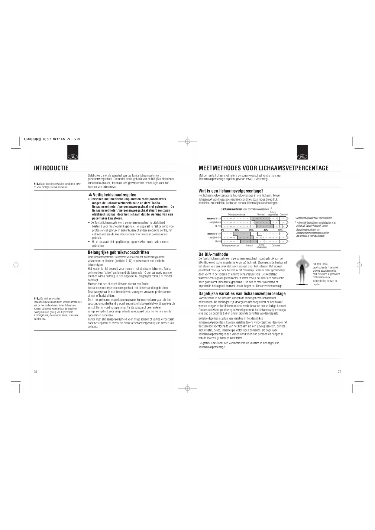 - Het apparaat niet op glibberige oppervlakken zoals natte vloeren gebruiken. Belangrijke gebruiksvoorschriften Deze lichaamsvetmeter is bestemd voor actieve tot middelmatig actieve volwassenen en kinderen (leeftijden 7–17) en volwassenen met atletische lichaamstypen. Het toestel is niet bedoeld voor mensen met atletische lichamen. Tanita definieert een "atleet" als iemand die tenminste 10 uur per week intensief traint en wiens hartslag in rust ongeveer 60 slagen per minuut of minder bedraagt. Mensen met een atletisch lichaam dienen een Tanita lichaamsvetmeter/personenweegschaal met atletenstand te gebruiken. Deze weegschaal is niet bedoeld voor zwangere vrouwen, professionele atleten of bodybuilders. De in het geheugen opgeslagen gegevens kunnen verloren gaan als het apparaat onoordeelkundig wordt gebruikt of blootgesteld wordt aan te grote verschillen in voedingsspanning. Tanita aanvaardt geen enkele aansprakelijkheid voor enige schade veroorzaakt door het verlies van de opgeslagen gegevens. Tanita wijst alle aansprakelijkheid voor enige schade of verlies veroorzaakt door het apparaat of eventuele eisen tot schadevergoeding van derden van de hand. N.B.: Deze gebruiksaanwijzing aandachtig lezenen voor naslagdoeleinden bewaren.N.B.: De metingen van hetlichaamsvetpercentage zullen variëren afhankelijkvan de hoeveelheid water in het lichaam enkunnen beïnvloed worden door dehydratie ofoverhydratie als gevolg van bijvoorbeeldalcoholgebruik, menstruatie, ziekte, intensievetraining enz.