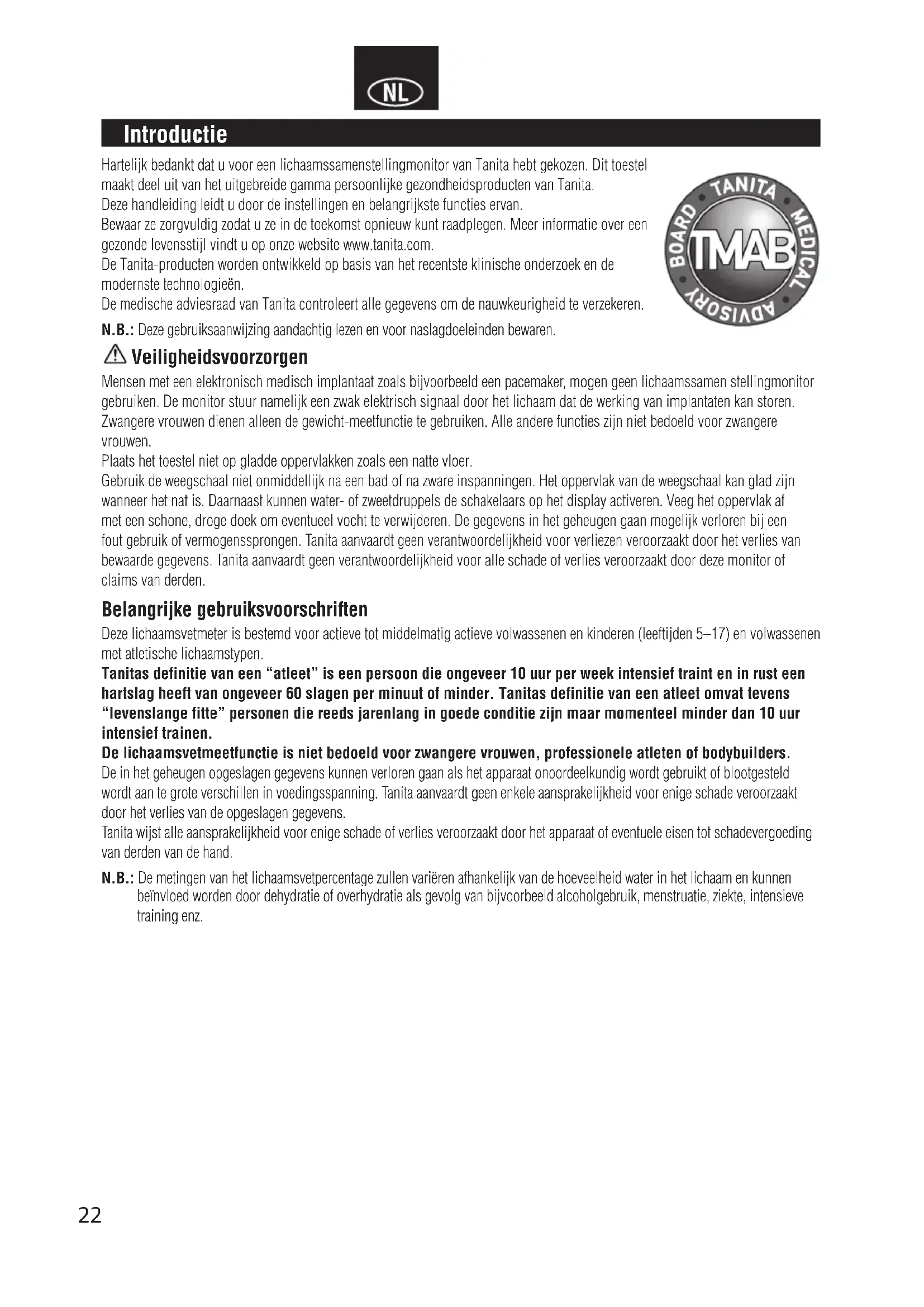 Précision du taux de graisse 0.1% Données personnelles 4 mémoires Alimentation 2 piles Lithium CR2032 (incluses) Consommation d’énergie 60 mA au maximum Courant émis 50 kHz, 6.25 kHz, 100 µA Jeter des piles avec des déchets ménagers est interdit! En tant que consommateur, vous avez l’obligation de rendre les piles usages ou déchargées. Vous pouvez déposer vos vieilles piles dans des lieux de collecte publics de votre ville ou partout où des piles similaires sont vendues et que des boîtes de collection spécialement indiquées ont été mises en place. En cas de mise au rebut de l’appareil, les piles doivent en être ôtées et également déposées dans le point de collection. Remarque: Vous trouverez les índications suivantes sur les piles contenant des substances polluantes: Pb Pb = la pile contient du plomb, Cd Cd = la pile contient du cadmium, Hg Hg = la pile contient du mercure. Cet appareil est conforme à la directive2004/108/EC (compatibilité électromagnétique) en vigueur.22 Introductie Hartelijk bedankt dat u voor een lichaamssamenstellingmonitor van Tanita hebt gekozen. Dit toestel maakt deel uit van het uitgebreide gamma persoonlijke gezondheidsproducten van Tanita. Deze handleiding leidt u door de instellingen en belangrijkste functies ervan. Bewaar ze zorgvuldig zodat u ze in de toekomst opnieuw kunt raadplegen. Meer informatie over een gezonde levensstijl vindt u op onze website www.tanita.com. De Tanita-producten worden ontwikkeld op basis van het recentste klinische onderzoek en de modernste technologieën. De medische adviesraad van Tanita controleert alle gegevens om de nauwkeurigheid te verzekeren. N.B.: Deze gebruiksaanwijzing aandachtig lezen en voor naslagdoeleinden bewaren. Veiligheidsvoorzorgen Mensen met een elektronisch medisch implantaat zoals bijvoorbeeld een pacemaker, mogen geen lichaamssamen stellingmonitor gebruiken. De monitor stuur namelijk een zwak elektrisch signaal door het lichaam dat de werking van implantaten kan storen. Zwangere vrouwen dienen alleen de gewicht-meetfunctie te gebruiken. Alle andere functies zijn niet bedoeld voor zwangere vrouwen. Plaats het toestel niet op gladde oppervlakken zoals een natte vloer. Gebruik de weegschaal niet onmiddellijk na een bad of na zware inspanningen. Het oppervlak van de weegschaal kan glad zijn wanneer het nat is. Daarnaast kunnen water- of zweetdruppels de schakelaars op het display activeren. Veeg het oppervlak af met een schone, droge doek om eventueel vocht te verwijderen. De gegevens in het geheugen gaan mogelijk verloren bij een fout gebruik of vermogenssprongen. Tanita aanvaardt geen verantwoordelijkheid voor verliezen veroorzaakt door het verlies van bewaarde gegevens. Tanita aanvaardt geen verantwoordelijkheid voor alle schade of verlies veroorzaakt door deze monitor of claims van derden. Belangrijke gebruiksvoorschriften Deze lichaamsvetmeter is bestemd voor actieve tot middelmatig actieve volwassenen en kinderen (leeftijden 5–17) en volwassenen met atletische lichaamstypen. Tanitas definitie van een “atleet” is een persoon die ongeveer 10 uur per week intensief traint en in rust een hartslag heeft van ongeveer 60 slagen per minuut of minder. Tanitas definitie van een atleet omvat tevens “levenslange fitte” personen die reeds jarenlang in goede conditie zijn maar momenteel minder dan 10 uur intensief trainen. De lichaamsvetmeetfunctie is niet bedoeld voor zwangere vrouwen, professionele atleten of bodybuilders. De in het geheugen opgeslagen gegevens kunnen verloren gaan als het apparaat onoordeelkundig wordt gebruikt of blootgesteld wordt aan te grote verschillen in voedingsspanning. Tanita aanvaardt geen enkele aansprakelijkheid voor enige schade veroorzaakt door het verlies van de opgeslagen gegevens. Tanita wijst alle aansprakelijkheid voor enige schade of verlies veroorzaakt door het apparaat of eventuele eisen tot schadevergoeding van derden van de hand. N.B.: De metingen van het lichaamsvetpercentage zullen variëren afhankelijk van de hoeveelheid water in het lichaam en kunnen beïnvloed worden door dehydratie of overhydratie als gevolg van bijvoorbeeld alcoholgebruik, menstruatie, ziekte, intensieve training enz.23 S E T RECALL
