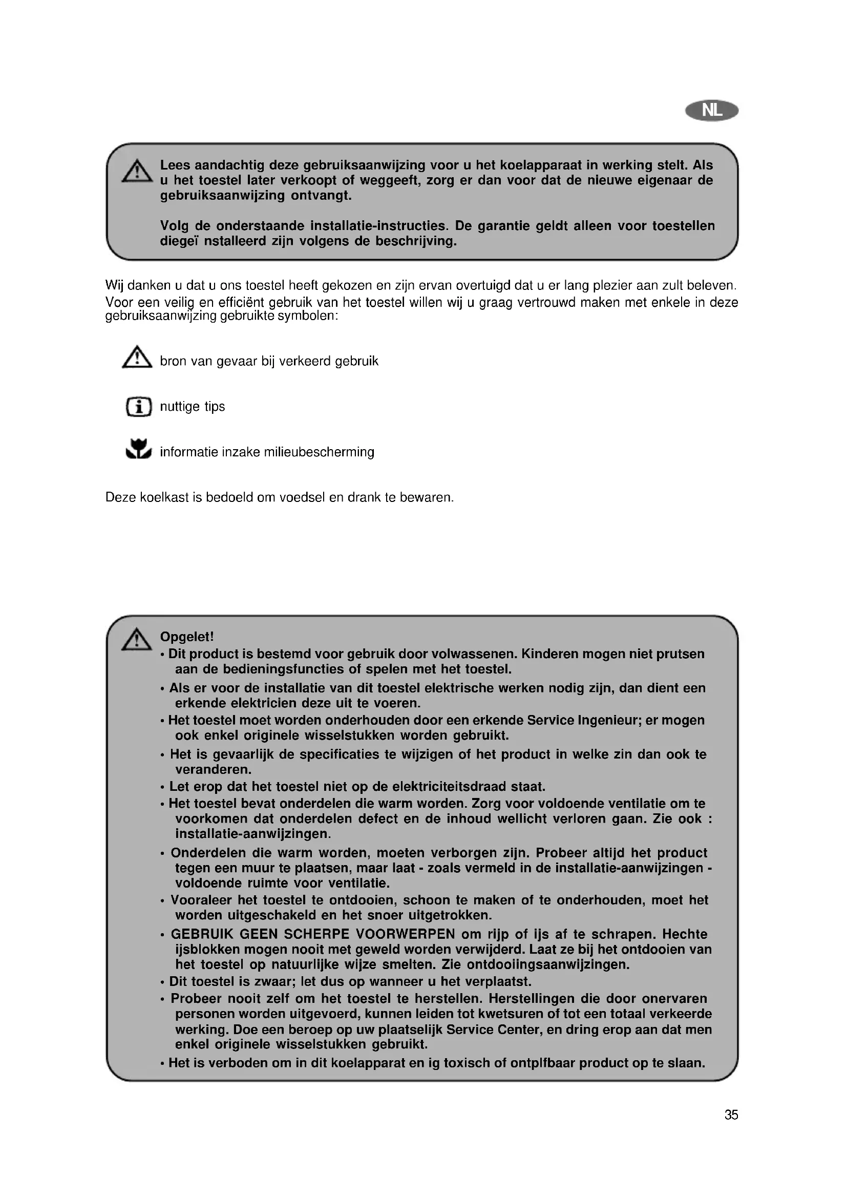 Lees aandachtig deze gebruiksaanwijzing voor u het koelapparaat in werking stelt. Als u het toestel later verkoopt of weggeeft, zorg er dan voor dat de nieuwe eigenaar de gebruiksaanwijzing ontvangt. Volg de onderstaande installatie-instructies. De garantie geldt alleen voor toestellen diegeïnstalleerd zijn volgens de beschrijving. Wij danken u dat u ons toestel heeft gekozen en zijn ervan overtuigd dat u er lang plezier aan zult beleven. Voor een veilig en efficiënt gebruik van het toestel willen wij u graag vertrouwd maken met enkele in deze gebruiksaanwijzing gebruikte symbolen: bron van gevaar bij verkeerd gebruik nuttige tips informatie inzake milieubescherming Deze koelkast is bedoeld om voedsel en drank te bewaren. Opgelet!