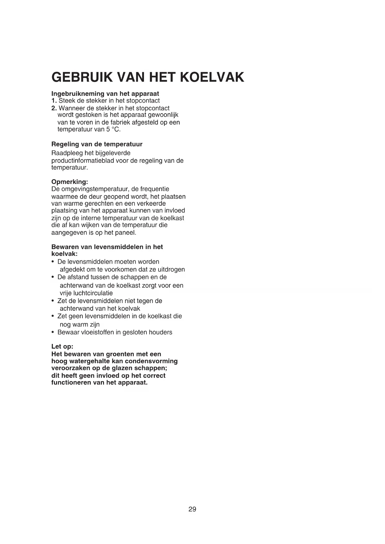 - Bewaar vloeistoffen in gesloten houders Let op: Het bewaren van groenten met een hoog watergehalte kan condensvorming veroorzaken op de glazen schappen; dit heeft geen invloed op het correct functioneren van het apparaat.