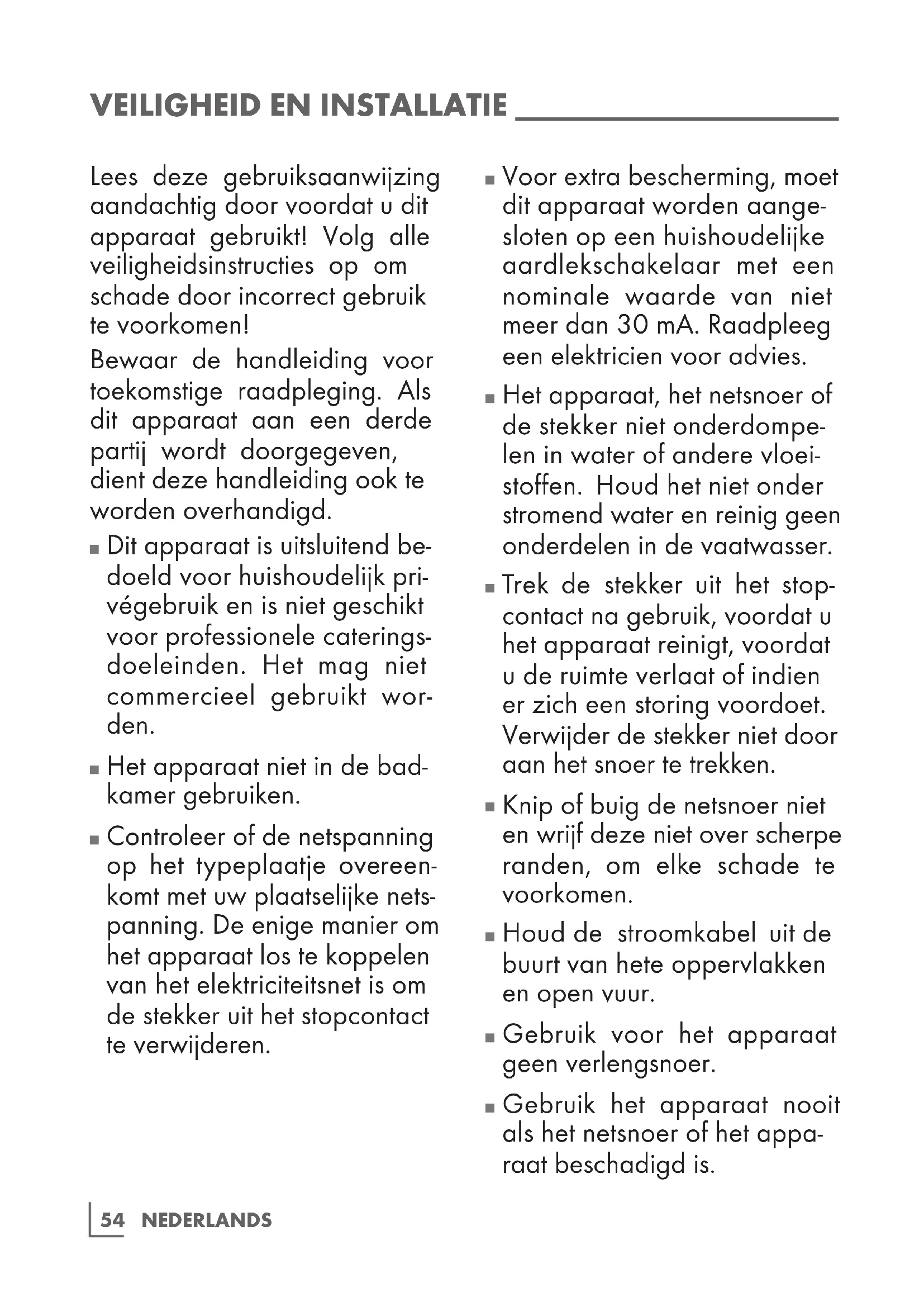 Dit apparaat kan worden ge- bruikt door kinderen vanaf 8 jaar en personen met vermin- derde fysieke, zintuiglijke of mentale vermogens, of met een gebrek aan ervaring en kennis, als deze onder toe- zicht staan of instructies heb- ben gekregen betreffende het veilige gebruik van het ap- paraat en op de hoogte zijn van de betrokken gevaren. Laat kinderen niet met het ap- paraat spelen. Reiniging en gebruikersonderhoud mogen niet zonder toezicht door kin- deren uitgevoerd worden.