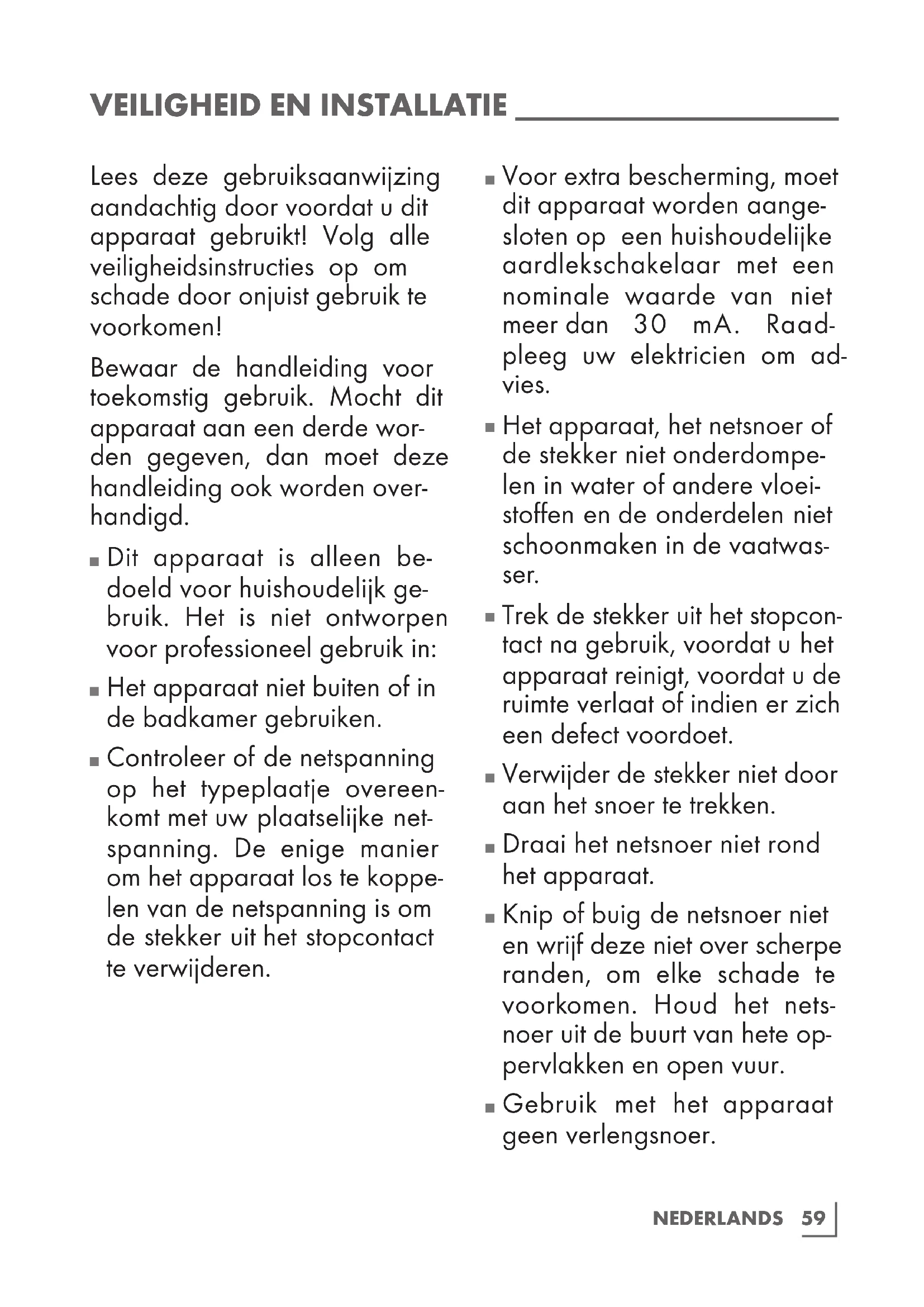 Voor extra bescherming, moet dit apparaat worden aange- sloten op een huishoudelijke aardlekschakelaar met een nominale waarde van niet meer dan 30 mA. Raad- pleeg uw elektricien om ad- vies.