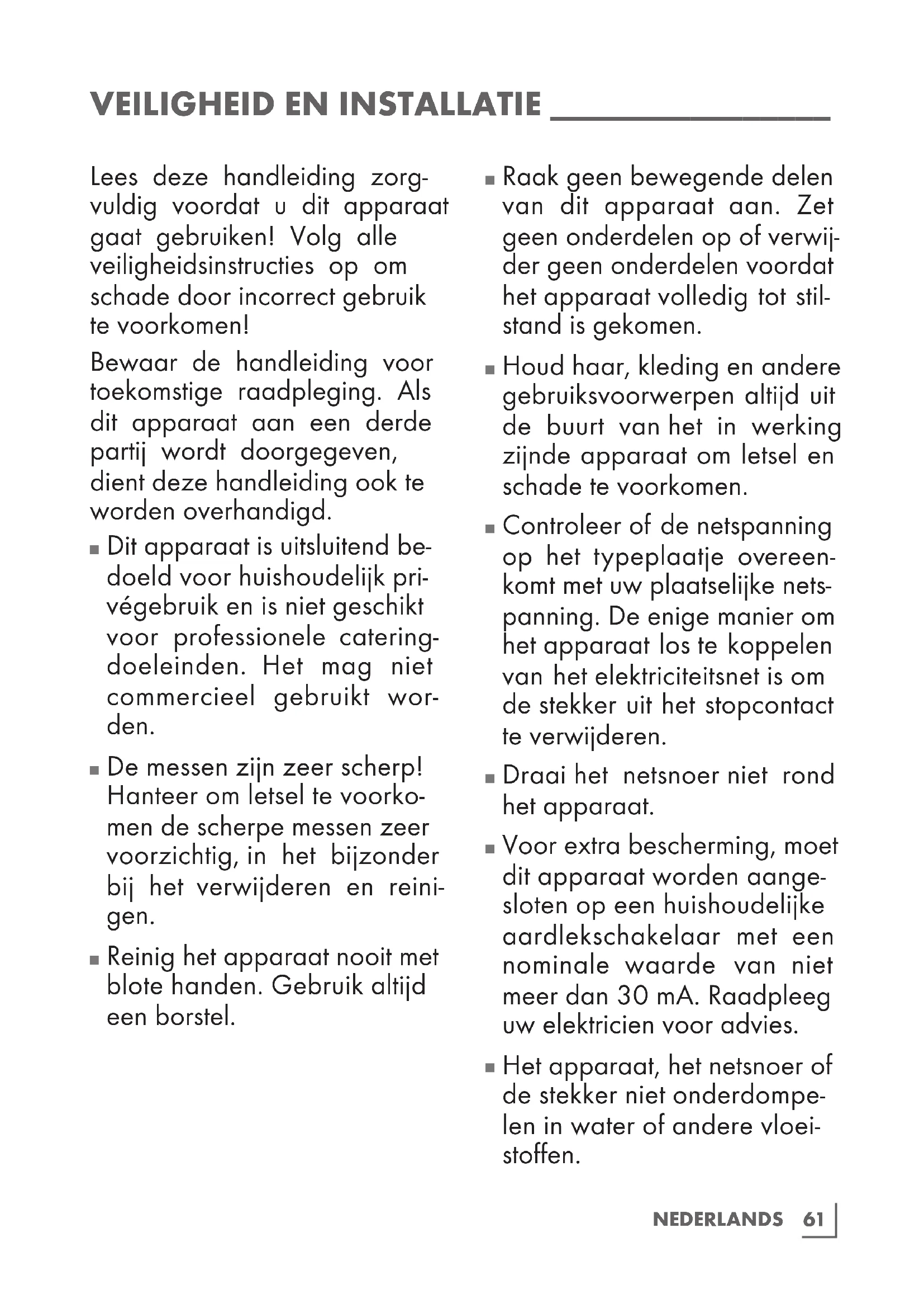 De messen zijn zeer scherp! Hanteer om letsel te voorko- men de scherpe messen zeer voorzichtig, in het bijzonder bij het verwijderen en reini- gen.