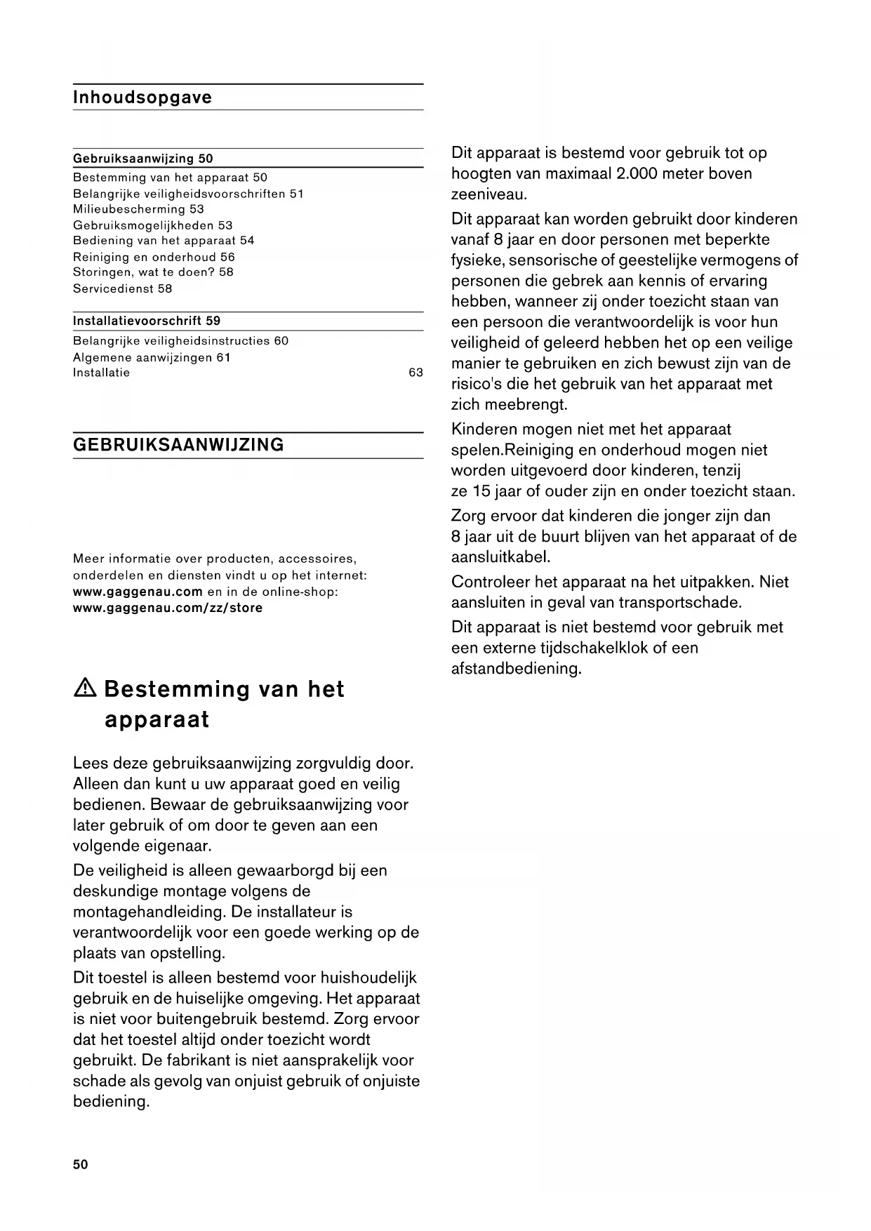 PP50 Inhoudsopgave [nl]Gebruiksaanwijzing en install ati evoorschri ft Gebruiksaanwijzing 50 Bestemming van het apparaat 50 Belangrijke veiligheidsvoorschriften 51 Milieubescherming 53 Gebruiksmogelijkheden 53 Bediening van het apparaat 54 Reiniging en onderhoud 56 Storingen, wat te doen? 58 Servicedienst 58 Installatievoorschrift 59 Belangrijke veiligheidsinstructies 60 Algemene aanwijzingen 61 Installatie 63 GEBRUIKSAANWIJZING Meer informatie over producten, accessoires, onderdelen en diensten vindt u op het internet: www.gaggenau.com en in de online-shop: www.gaggenau.com/zz/store m Bestemming van het apparaat Lees deze gebruiksaanwijzing zorgvuldig door. Alleen dan kunt u uw apparaat goed en veilig bedienen. Bewaar de gebruiksaanwijzing voor later gebruik of om door te geven aan een volgende eigenaar. De veiligheid is alleen gewaarborgd bij een deskundige montage volgens de montagehandleiding. De installateur is verantwoordelijk voor een goede werking op de plaats van opstelling. Dit toestel is alleen bestemd voor huishoudelijk gebruik en de huiselijke omgeving. Het apparaat is niet voor buitengebruik bestemd. Zorg ervoor dat het toestel altijd onder toezicht wordt gebruikt. De fabrikant is niet aansprakelijk voor schade als gevolg van onjuist gebruik of onjuiste bediening. Dit apparaat is bestemd voor gebruik tot op hoogten van maximaal 2.000 meter boven zeeniveau. Dit apparaat kan worden gebruikt door kinderen vanaf 8 jaar en door personen met beperkte fysieke, sensorische of geestelijke vermogens of personen die gebrek aan kennis of ervaring hebben, wanneer zij onder toezicht staan van een persoon die verantwoordelijk is voor hun veiligheid of geleerd hebben het op een veilige manier te gebruiken en zich bewust zijn van de risico's die het gebruik van het apparaat met zich meebrengt. Kinderen mogen niet met het apparaat spelen.Reiniging en onderhoud mogen niet worden uitgevoerd door kinderen, tenzij ze 15 jaar of ouder zijn en onder toezicht staan. Zorg ervoor dat kinderen die jonger zijn dan 8 jaar uit de buurt blijven van het apparaat of de aansluitkabel. Controleer het apparaat na het uitpakken. Niet aansluiten in geval van transportschade. Dit apparaat is niet bestemd voor gebruik met een externe tijdschakelklok of een afstandbediening.51 m Belangrijke veiligheidsvoorschriften Lees deze gebruiksaanwijzing zorgvuldig door. Alleen dan kunt u uw apparaat goed en veilig bedienen. Bewaar de gebruiksaanwijzing voor later gebruik of om door te geven aan een volgende eigenaar. Verstikkingsgevaar! Verpakkingsmateriaal is gevaarlijk voor kinderen. Kinderen nooit met verpakkingsmateriaal laten spelen. Levensgevaar! Teruggezogen verbrandingsgassen kunnen leiden tot vergiftiging. Altijd voor voldoende luchttoevoer zorgen, wanneer de luchtafvoer plaatsvindt in een ruimte met een vuurbron die gebruikmaakt van de aanwezige lucht. Vuurbronnen die de lucht in de ruimte verbruiken (bijv. apparaten die op gas, olie, hout of kolen worden gestookt, geisers, warmwatertoestellen) trekken de verbrandingslucht uit de opstellingsruimte en voeren de gassen via een afvoer (bijv. schoorsteen) af naar buiten. In combinatie met een ingeschakelde afzuigkap wordt aan de keuken en aan de ruimtes ernaast lucht onttrokken - zonder voldoende luchttoevoer ontstaat er een onderdruk. Giftige gassen uit de schoorsteen of het afvoerkanaal worden teruggezogen in de woonruimte. ▯ Zorg daarom altijd voor voldoende ventilatie. ▯ Een ventilatiekast in de muur alleen is niet voldoende om aan de minimale eisen te voldoen. U kunt het apparaat alleen dan zonder risico gebruiken wanneer de onderdruk in de ruimte waarin de vuurbron zich bevindt niet groter is dan 4 Pa (0,04 mbar). Dit kan worden bereikt wanneer de voor de verbranding benodigde lucht door niet afsluitbare openingen, bijv. in deuren, ramen, in combinatie met een ventilatiekast in de muur of andere technische voorzieningen, kan worden toegevoerd. Raadpleeg in ieder geval het bedrijf dat in uw huis zorgt voor de schoorsteenreiniging. Dit bedrijf is in staat het totale ventilatiesysteem van uw huis te beoordelen en kan een voorstel doen voor passende maatregelen op het gebied van de luchttoevoer. Indien de afzuiging alleen met recirculatie wordt gebruikt, is een onbeperkt gebruik mogelijk. Brandgevaar! ▯ De vetafzettingen in het vetfilter kunnen ontbranden. Vetfilter minstens om de 2 maanden reinigen. Apparaat niet zonder vetfilter gebruiken. Brandgevaar! ▯ De vetafzettingen in het vetfilter kunnen ontbranden. In de buurt van het apparaat nooit werken met een open vlam (bijv. flamberen). Het apparaat alleen in de buurt van een vuurbron voor vaste brandstoffen (bijv. hout of kolen) installeren wanneer er een afgesloten, niet verwijderbare afscherming aanwezig is. Er mogen geen vonken wegspringen. Risico van brand! ▯ Hete olie en heet vet vatten snel vlam. Hete olie en heet vet nooit gebruiken zonder toezicht. Vuur nooit blussen met water. Schakel de kookzone uit. Vlammen voorzichtig met een deksel, smoordeksel of iets dergelijks verstikken. Brandgevaar!52 ▯ Wanneer er gas-kookzones ingeschakeld zijn waar geen kookgerei op staat, wordt er tijdens het gebruik zeer veel warmte ontwikkeld. Een ventilatieapparaat dat daarop is aangebracht kan beschadigd of in brand raken. Gebruik de gas-kookzones alleen wanneer er kookgerei op staat. Risico van brand! ▯ Bij gelijktijdig gebruik van meerdere gas-kookzones ontwikkelt zich veel warmte. Hierdoor kan het ventilatieapparaat beschadigd of in brand raken. Het ventilatieapparaat mag alleen worden gecombineerd met gas-kookzones die een totaal vermogen van 18 kW niet overschrijden. Bij overschrijding van een totaal vermogen van 12 kW dienen de plaatselijke voorschriften met betrekking tot de ventilatie, de afmetingen van de ruimtes en de combinatie met ventilatie-apparaten voor afvoer- of circulatielucht in acht te worden genomen. Risico van verbranding! Tijdens het gebruik worden de toegankelijke onderdelen heet. De het